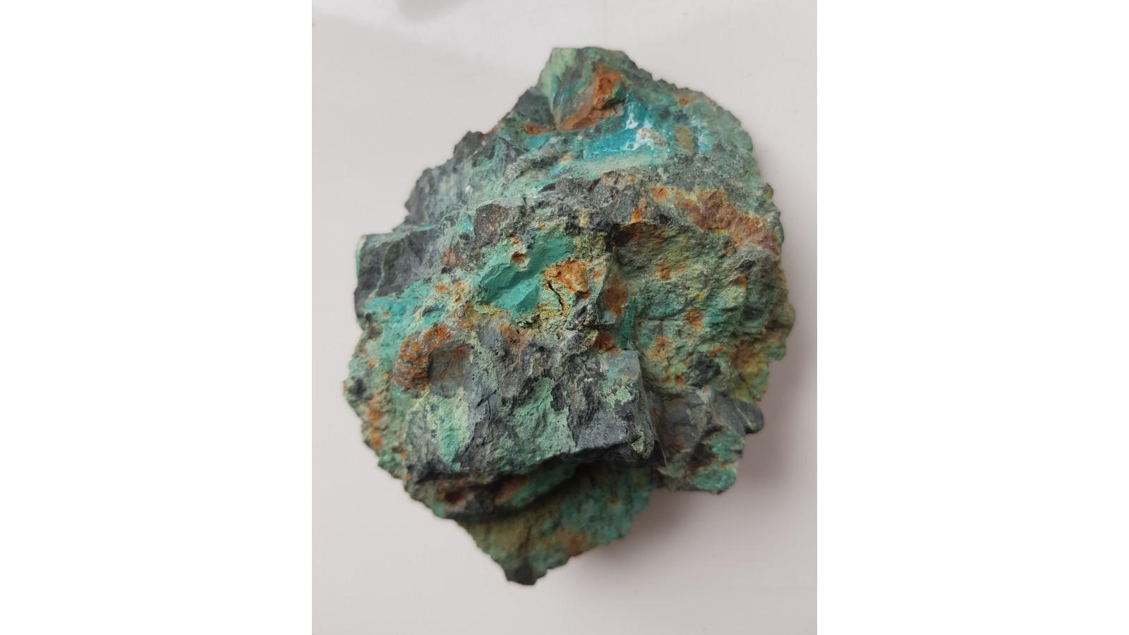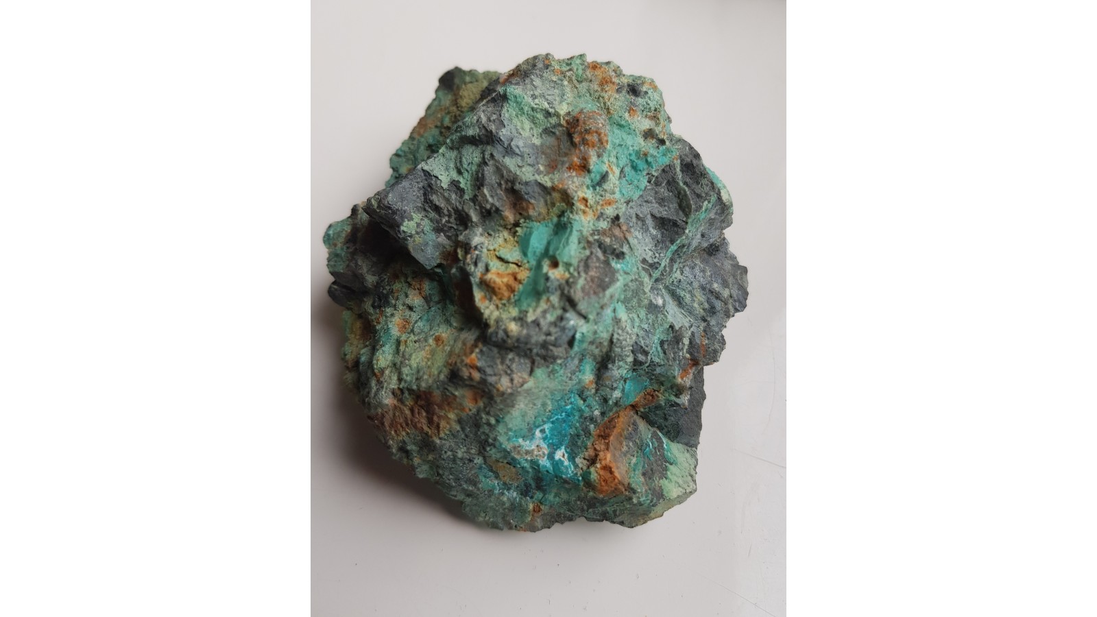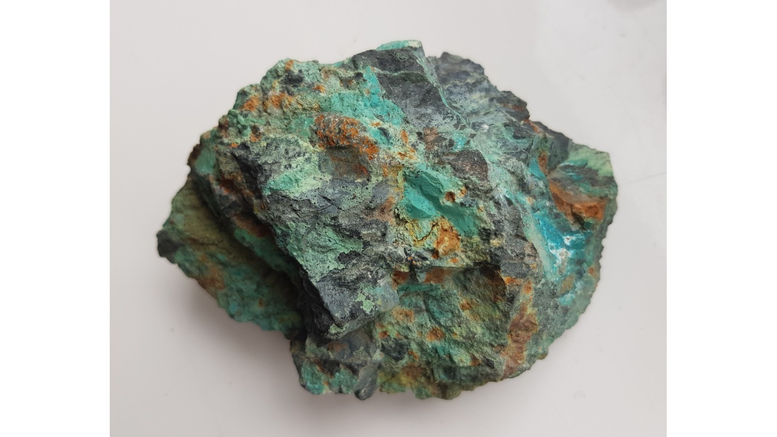 Okaz chryzokoli z Miedziank k. Janowic Wlk. w formie masywnych wydzieleń (nie nalotów) w łupku hornblendowym. Intensywna, turkusowa barwa. Duży, spektakularny okaz. Polecam.