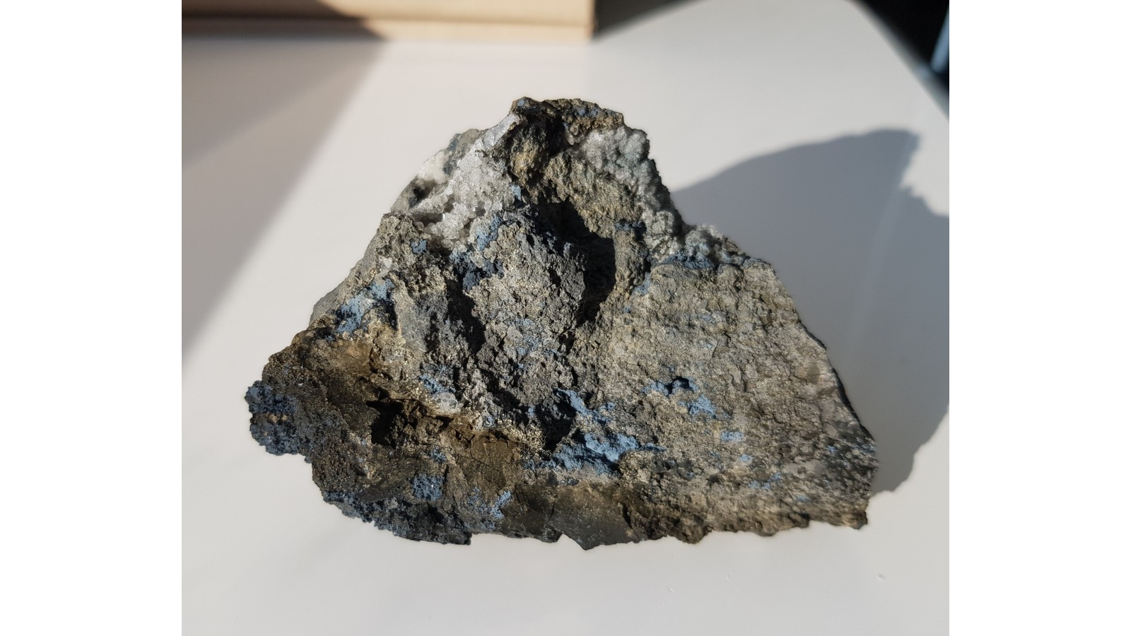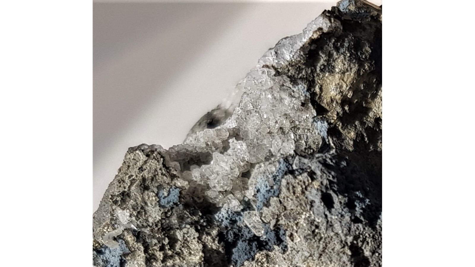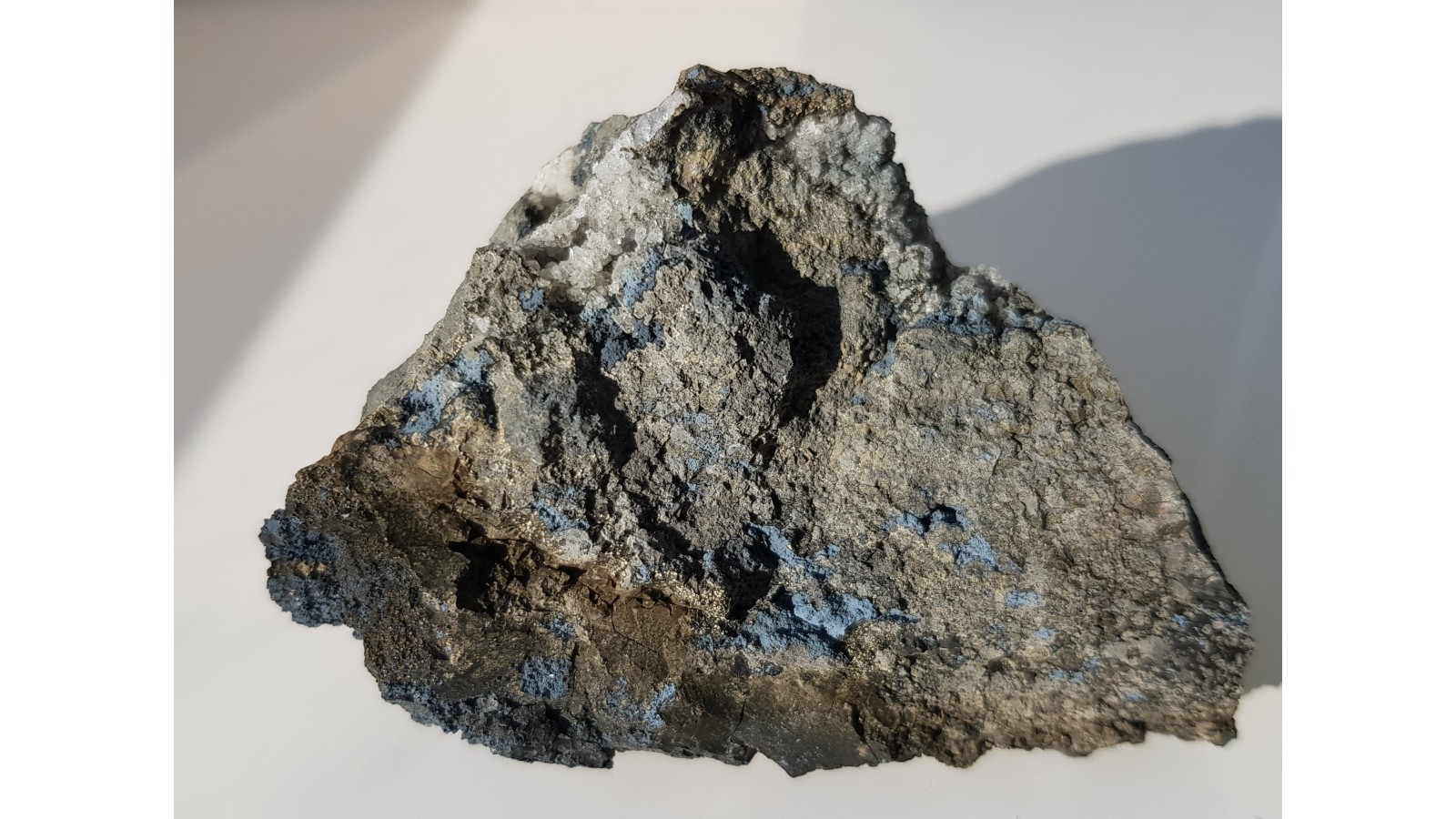 Okaz niebieskiego ferrosaponitu wraz z krystalicznym phillipsytem na bazalcie z Grabiszyc. Barwny i skrzący się w świetle. Polecam.