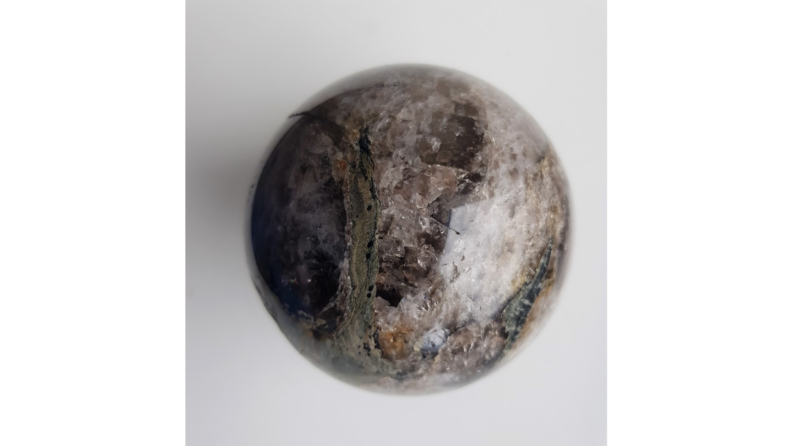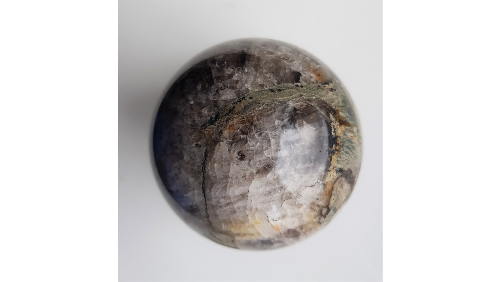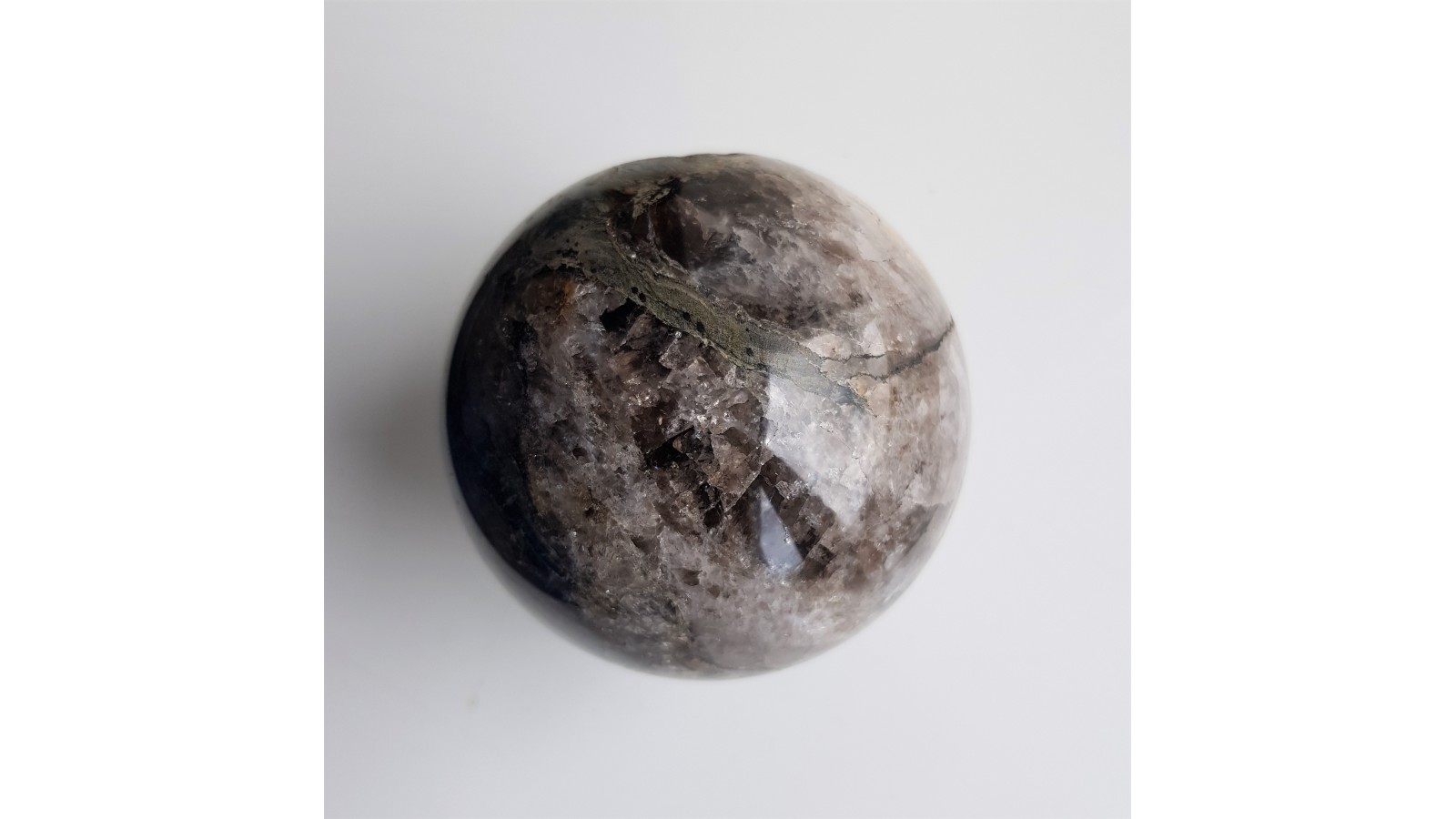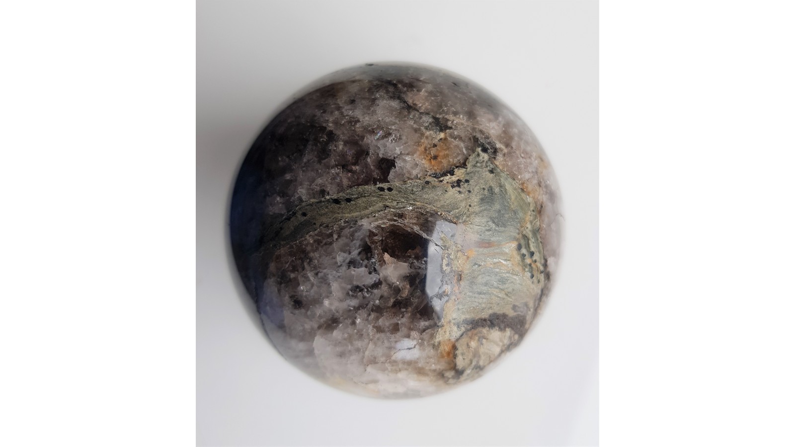 Kula z kwarcu/kwarcu dymnego tworzącego wkładki w łupkach łyszczykowych Czerniawskiej Kopy k. Czerniawy Zdroju. Kwarc miejscami wyraźnie zadymiony, widoczne wrostki pakietów łyszczyków o odcieniu zielonawym. Idealny poler. Polecam.