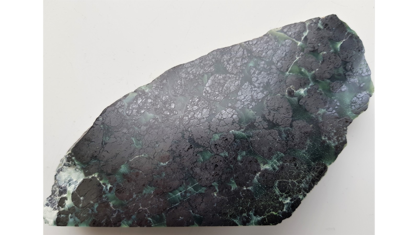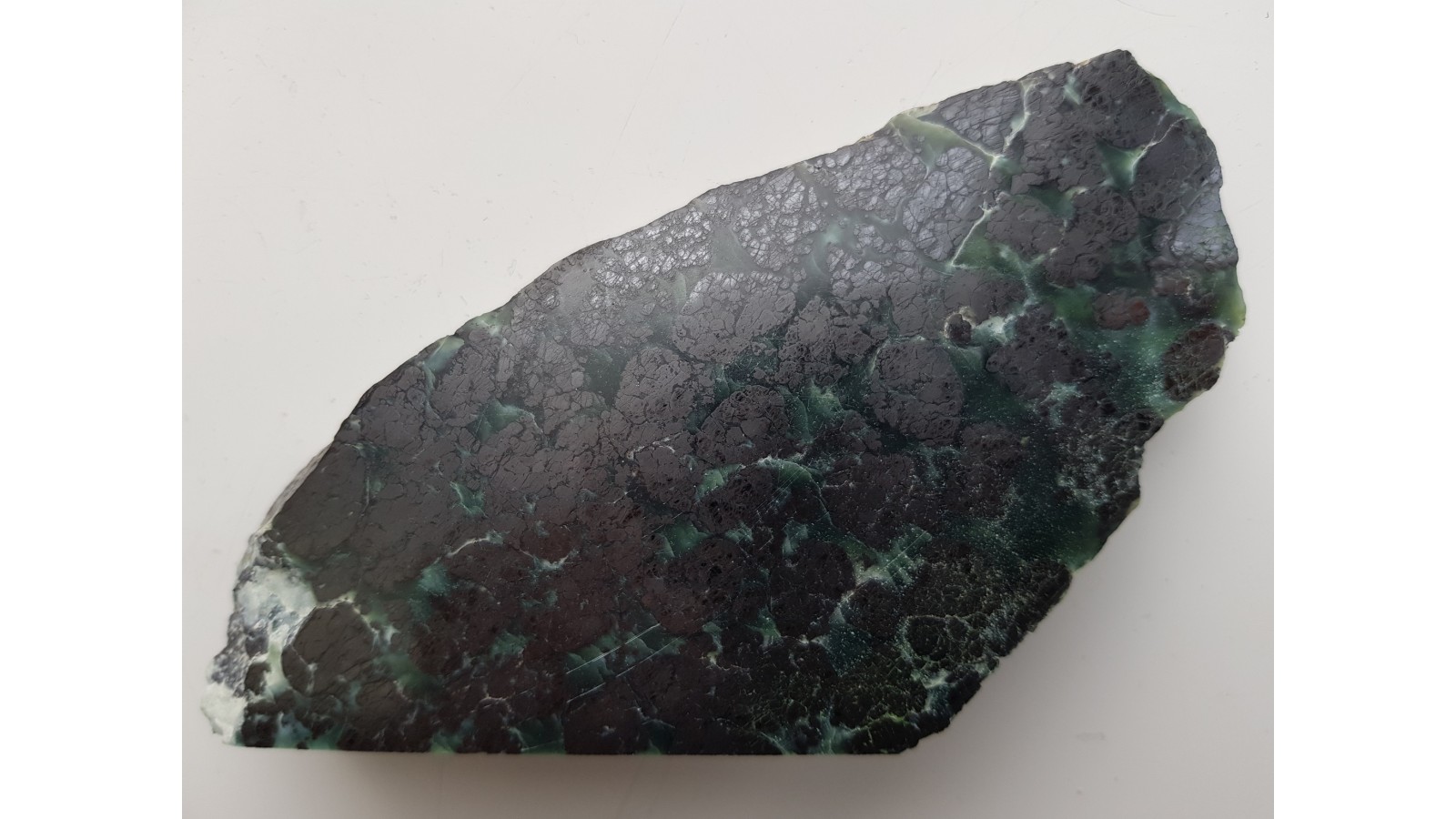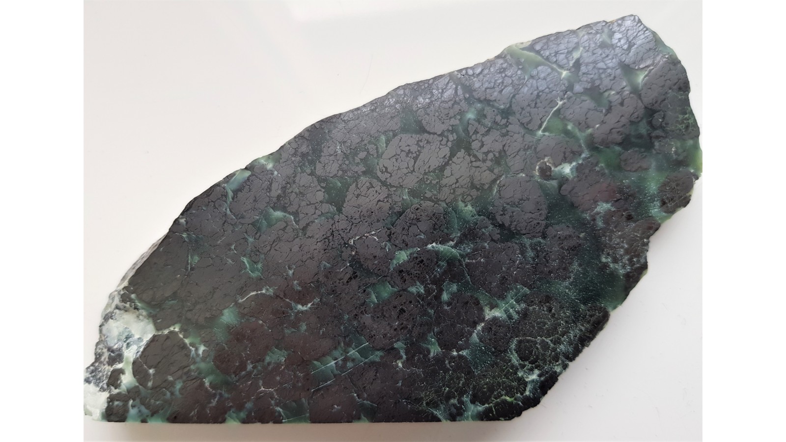Piękny okaz rudy chromitowej z dużymi skupieniami chromitu w przeświecającym serpentynicie (oficie). W chromitach widoczne strefy bardziej brązowawe, lepiej polerujące się i jednolite oraz bardziej "żelaziste", stalowe. Są to według danych dotyczących złoża pierwotne pikotyty (spinele z zawartością Mg), magnesiochromity bądź chromity glinowe oraz chromity i magnetyty, które są wtórne w stosunku do pikotytu. Idealny poler. Strona przeciwna naturalna. Bardzo estetyczny, duży okaz. Polecam.