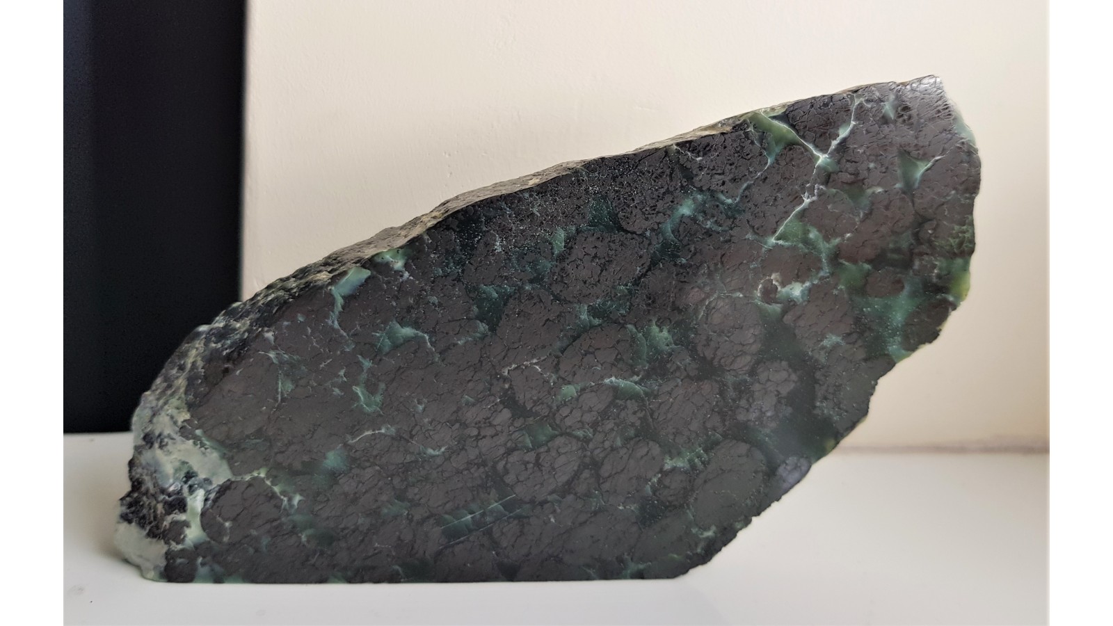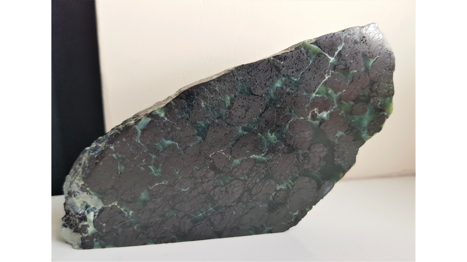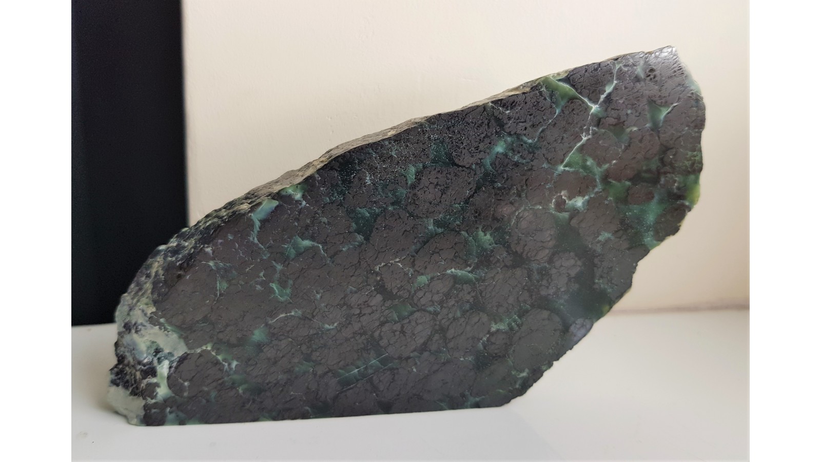 Piękny okaz rudy chromitowej z dużymi skupieniami chromitu w przeświecającym serpentynicie (oficie). W chromitach widoczne strefy bardziej brązowawe, lepiej polerujące się i jednolite oraz bardziej "żelaziste", stalowe. Są to według danych dotyczących złoża pierwotne pikotyty (spinele z zawartością Mg), magnesiochromity bądź chromity glinowe oraz chromity i magnetyty, które są wtórne w stosunku do pikotytu. Idealny poler. Strona przeciwna naturalna. Bardzo estetyczny, duży okaz. Polecam.