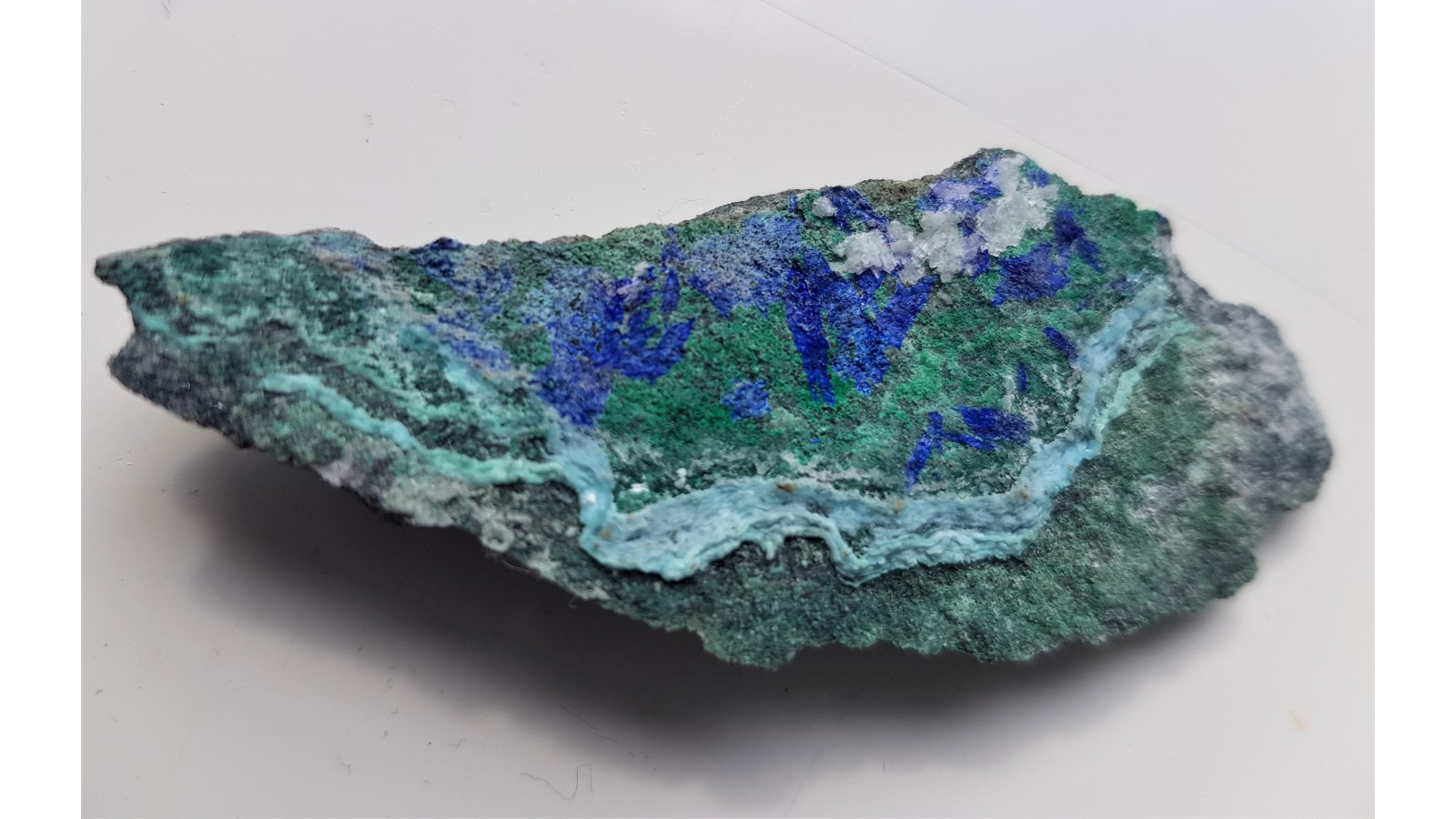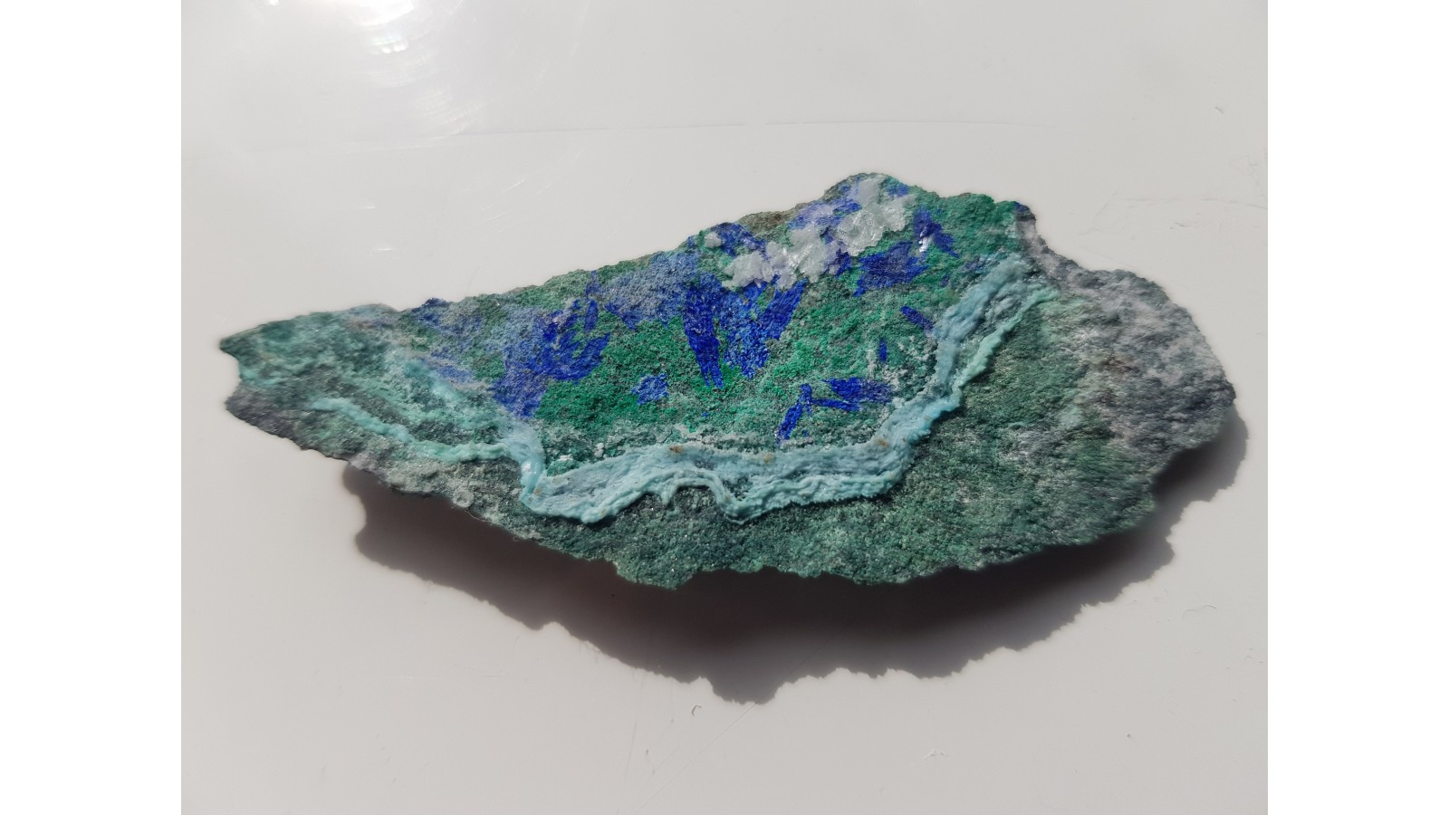 Ultrarzadki wtórny minerał miedzi - chalkonatronit w postaci bardzo wyrazistych, intensywnie niebieskich kryształów na piaskowcu z Polkowic. Jest to wtórny węglan sodu i miedzi notowany w kilku lokalizacjach na świecie, w tym kopalniach KGHM. Polecam.
