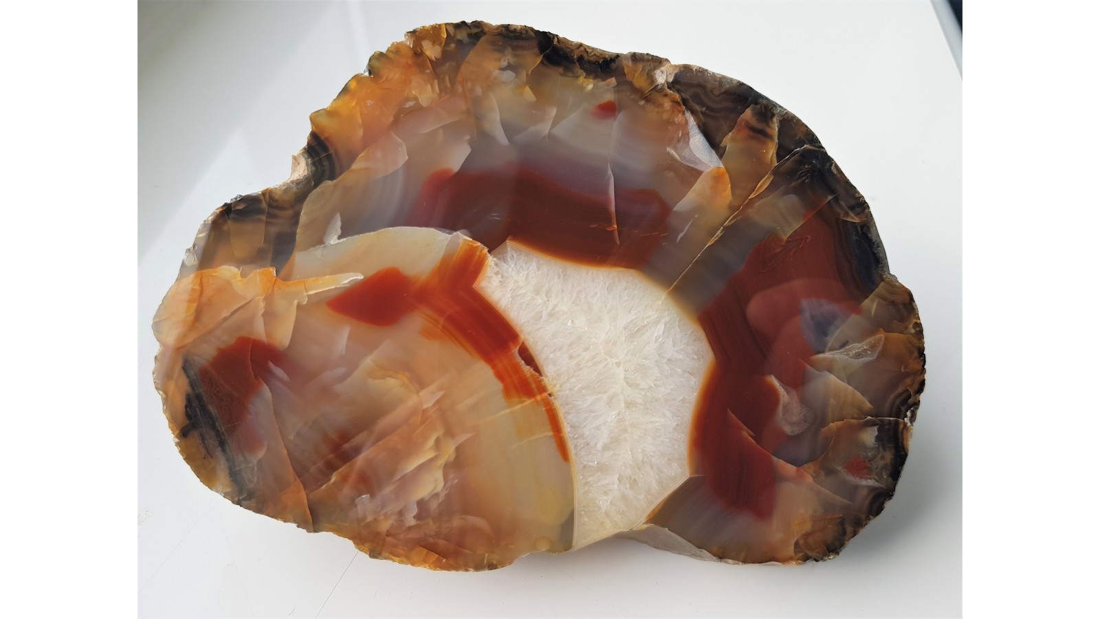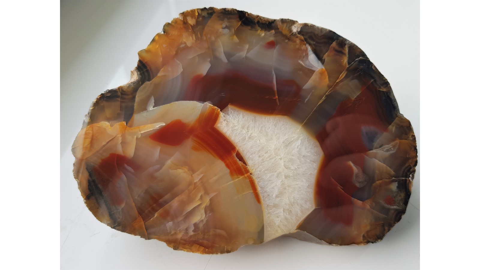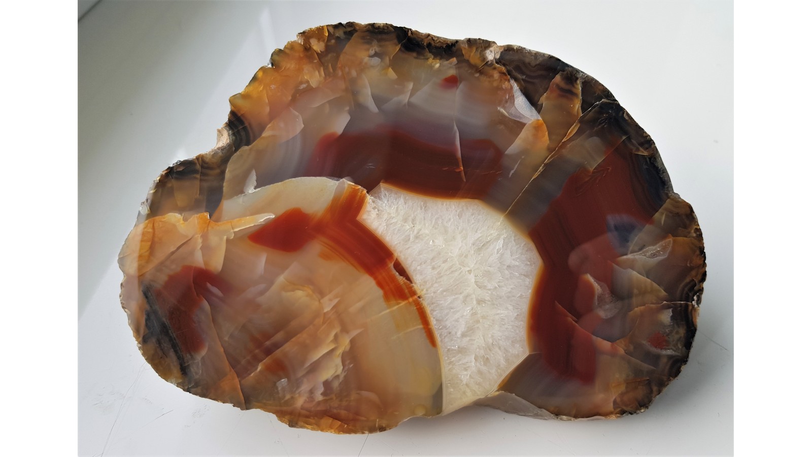 Agat rzeczny o miodowo-czerwonym zabarwieniu z centralną strefą kwarcową. Duży, spektakularny, miejscami chalcedon błękitnawy. Okaz ze żwirowni Nowe koło Lwówka Śląskiego. Strona przeciwna naturalna - otoczak rzeczny. Piękny poler. Polecam.