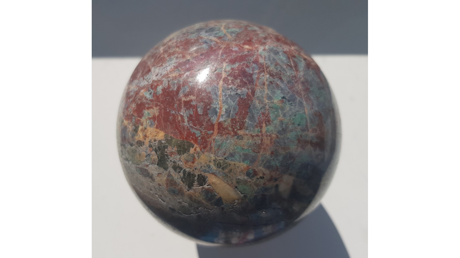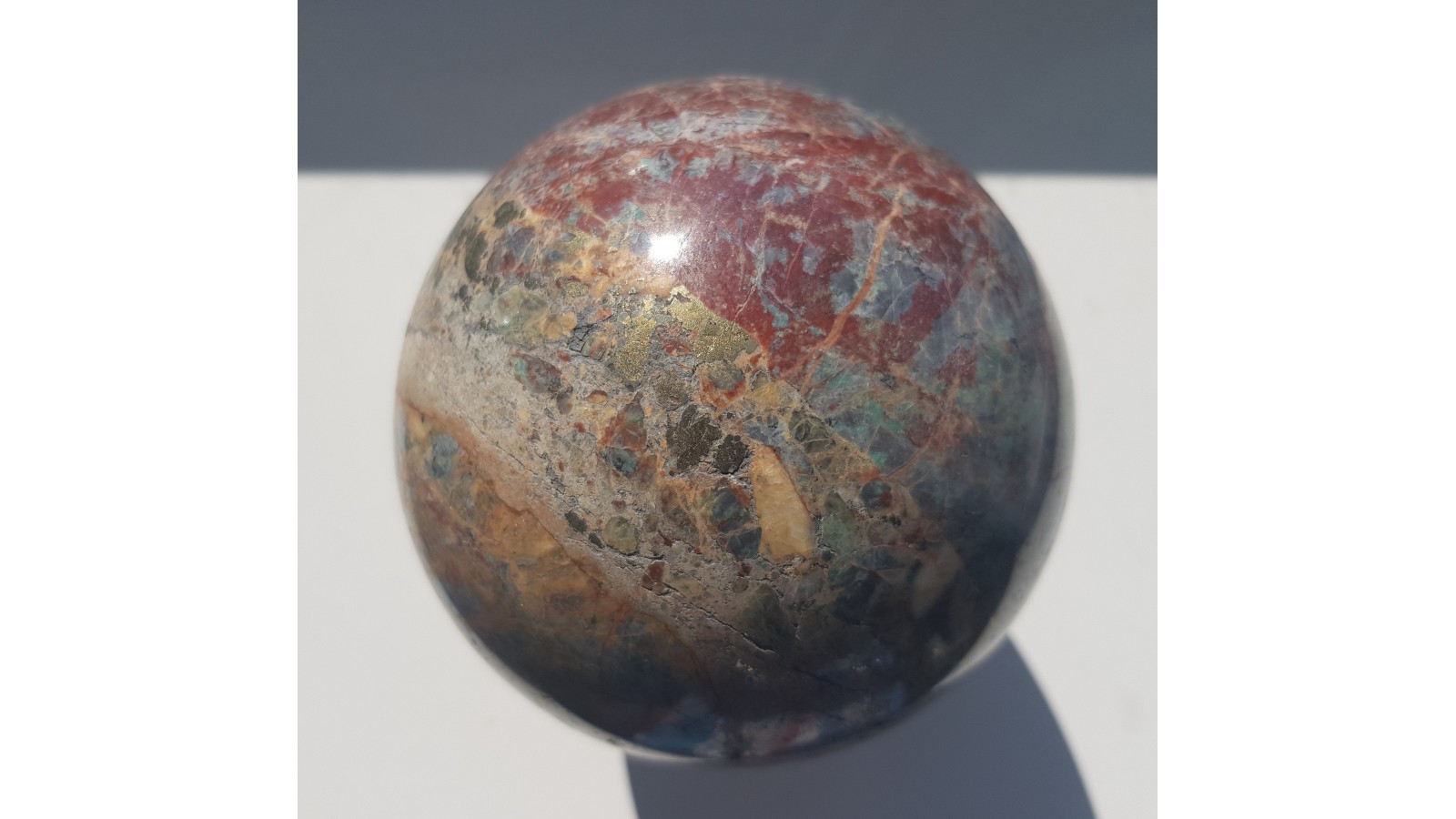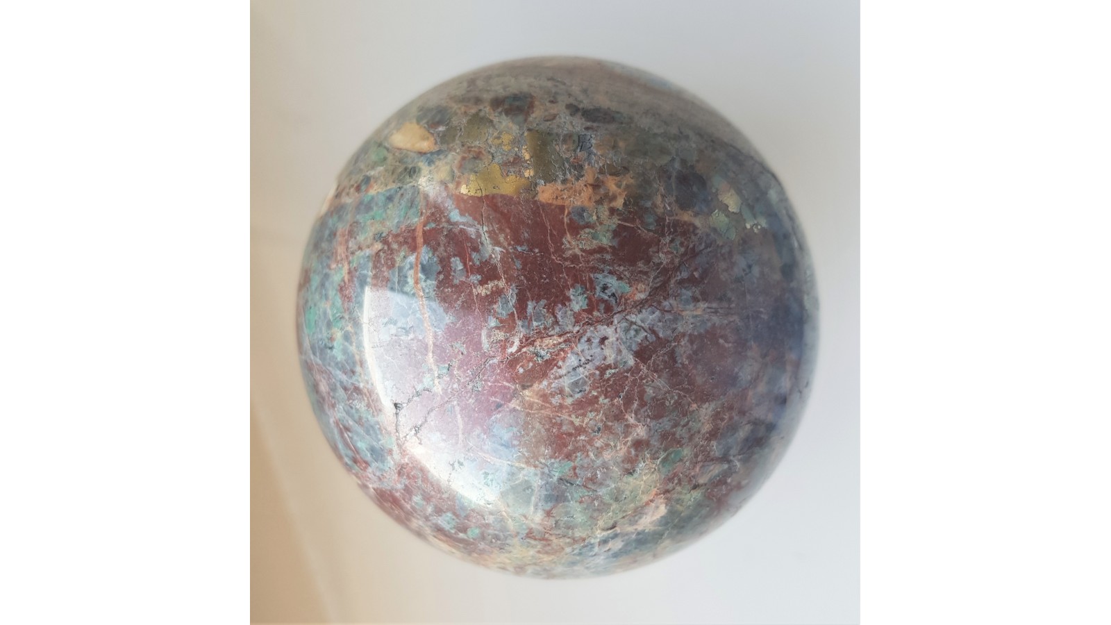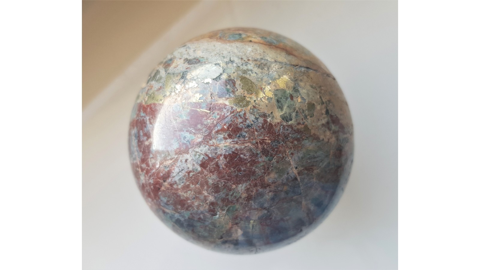 Kula z wyjątkowego materiału - listwenitu z dużymi skupieniami chalkopirytu z Przygórza k. Nowej Rudy. Kula w barwach od zielonej do czerwonej, ze strefami o połysku metalicznym. Kula duża i bardzo ozdobna. Piękny poler. Polecam.