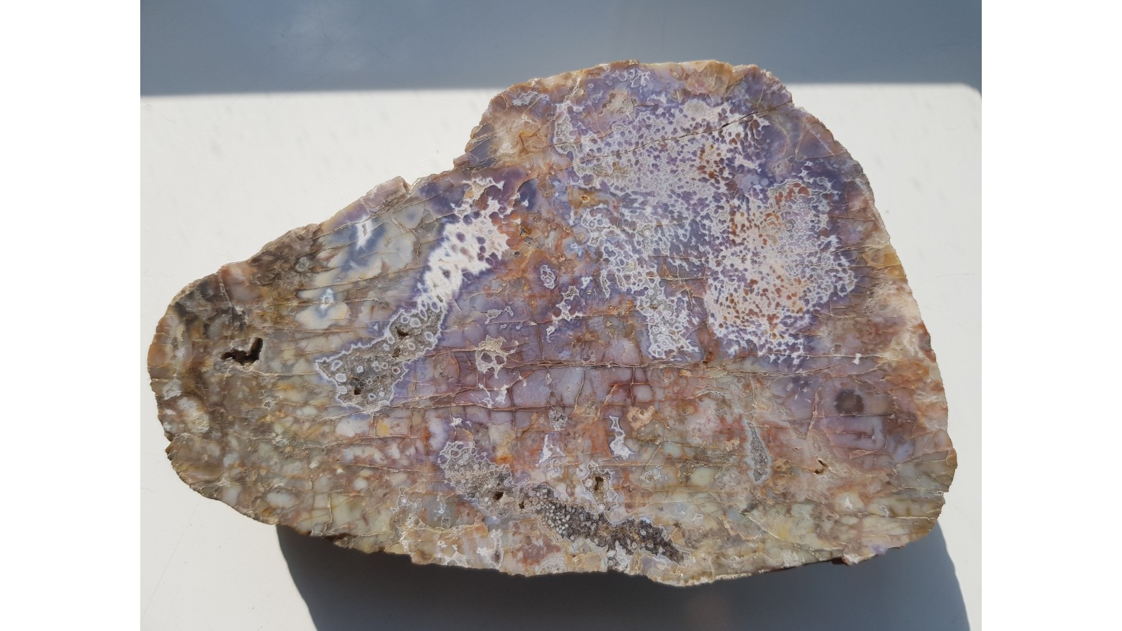Duży agat rzeczny o wyjątkowym deseniu "kwiatów bzu" i wyjątkowej barwie fioletowoniebieskiej skontrastowanej bielą. Unikatowy okaz ze żwirowni Nowe koło Lwówka Śląskiego. Strona przeciwna naturalna - otoczak rzeczny. Idealny poler. Polecam.