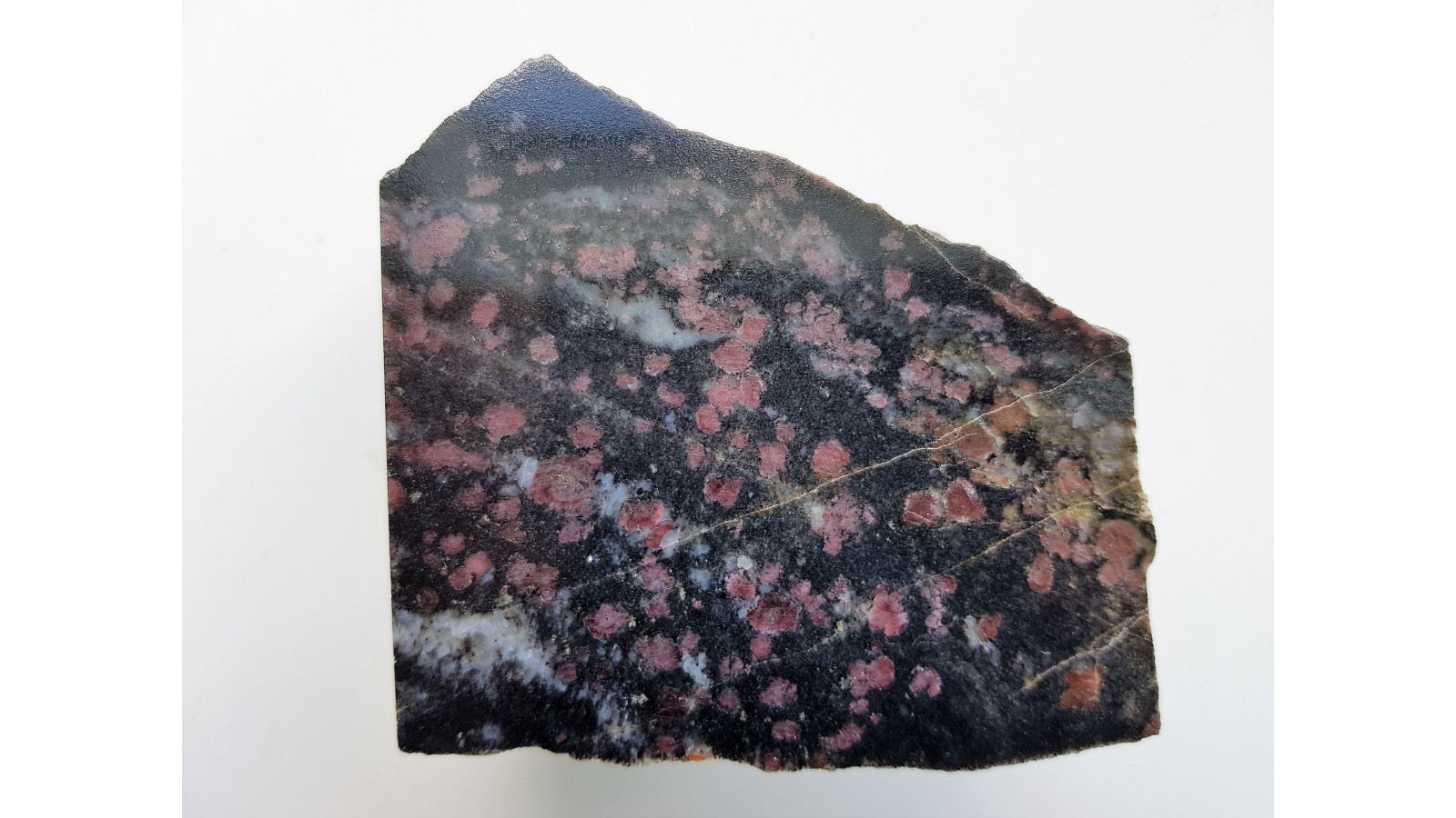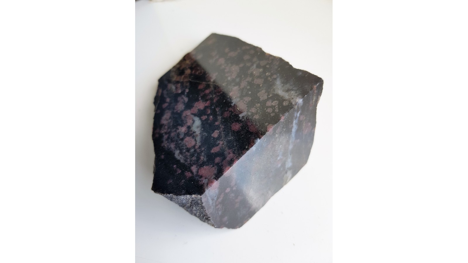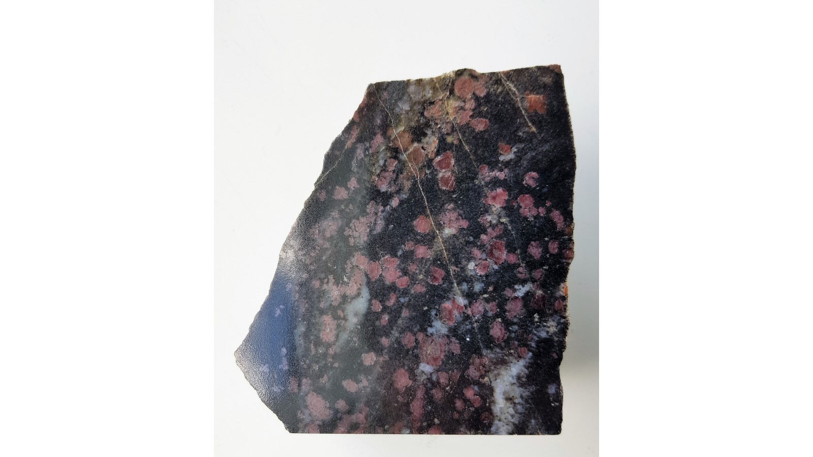 Polerowany okaz amfibolitu granatowego. Piękna skała ozdobna - na ciemnym tle widoczne są bardzo liczne, czerwone kryształy granatów. Idealny poler. Eratyk z Kalska w lubuskiem. Polecam.