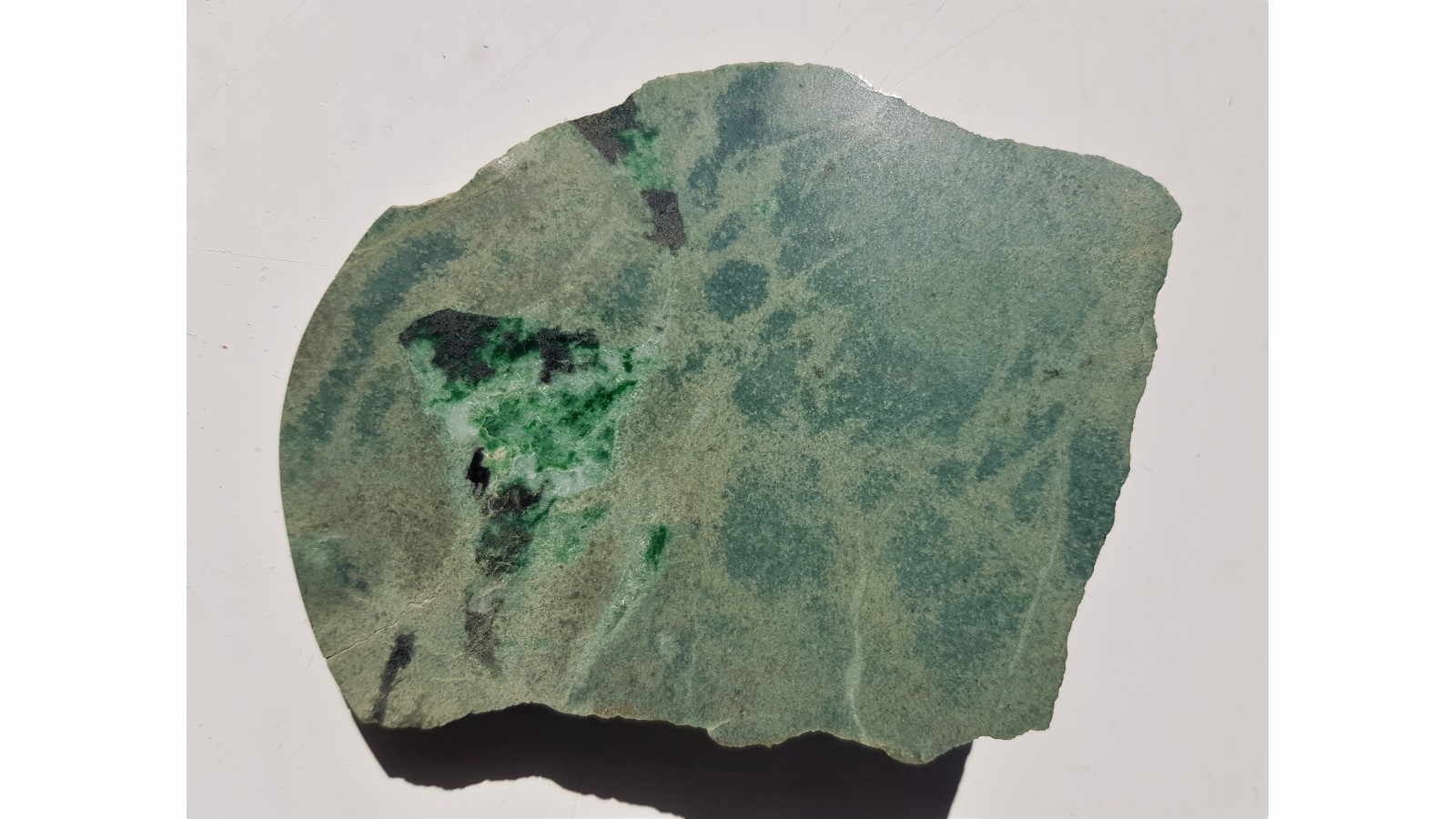 Polerowany okaz prawdziwego jadeitu, pięknie lokalnie zabarwiony na szmaragdowozielony kolor. Okaz z Masywu Monviso we włoskich Alpach, w którym odsłaniają się skały ofiolitu, pośród których unikatowe jest wystąpienie jadeitytów. Unikat. Strona przeciwa naturalna. Polecam.