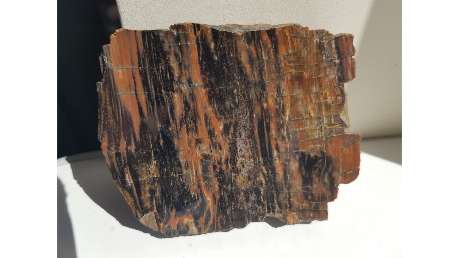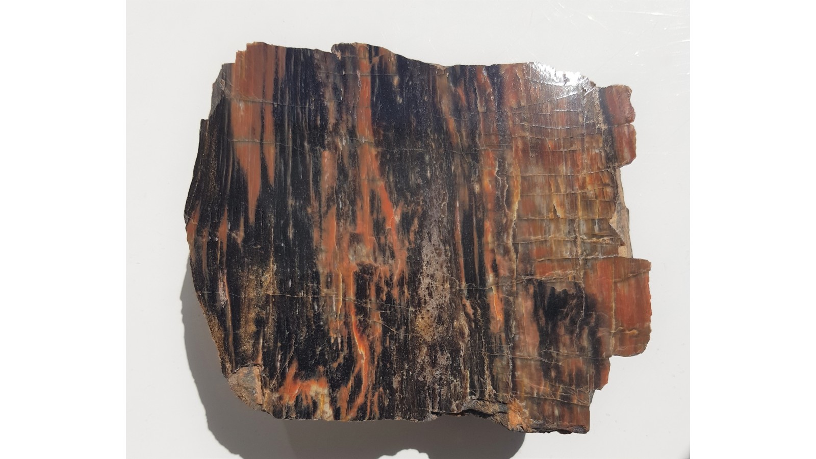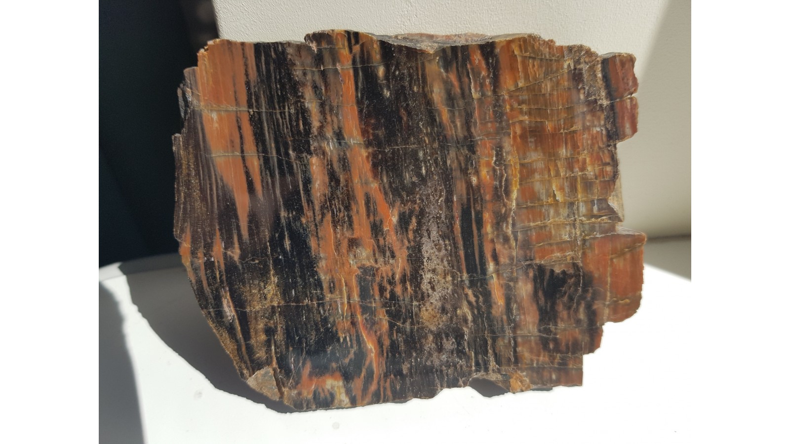 Piękny, barwny okaz drewna skrzemieniałego pochodzący ze zlepieńców karbonu/permu z rowu Świerzawy (fragment depresji północnosudeckiej). Idealny poler, bardzo estetyczny okaz, wyrazista barwa. Strona przeciwna naturalna, nie cięta. Polecam.