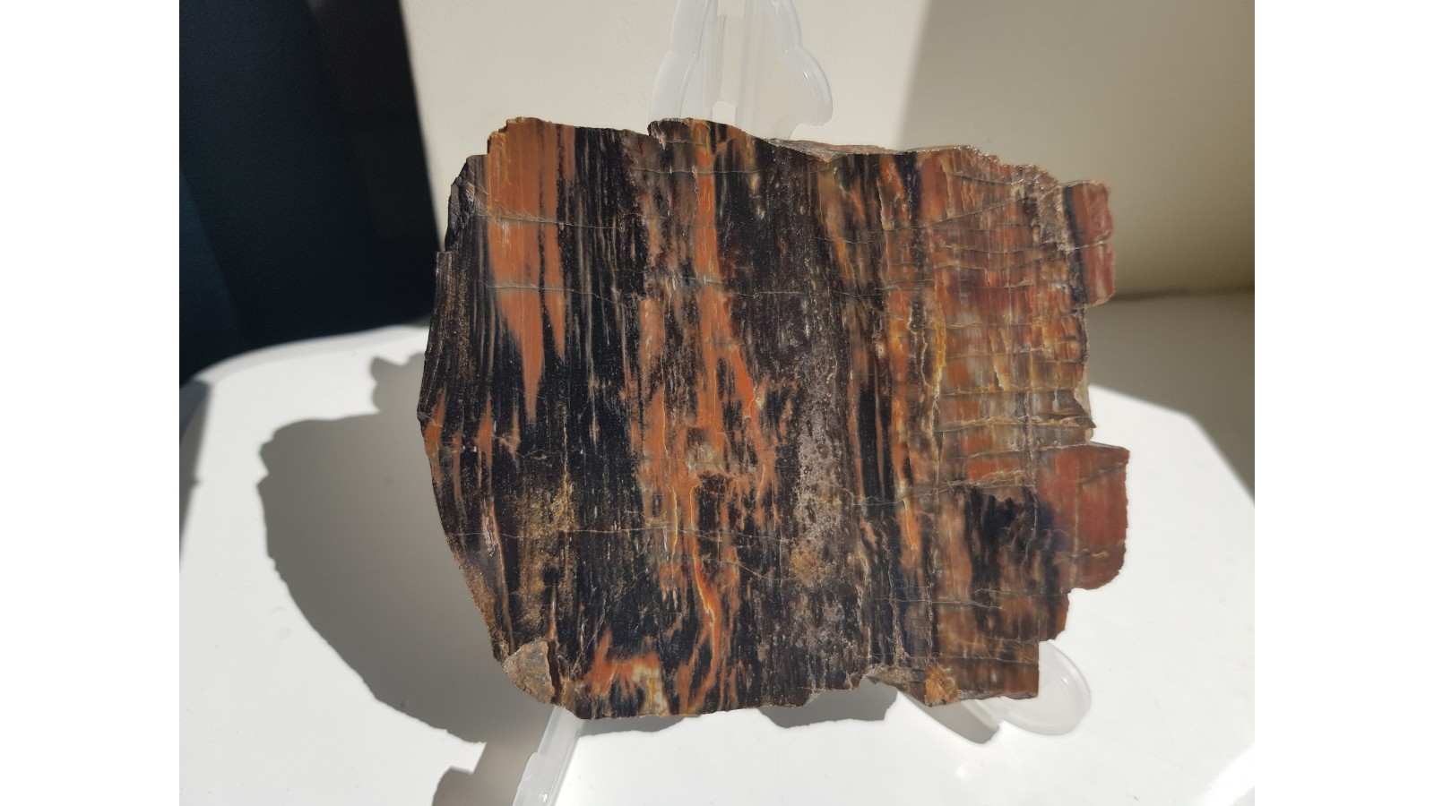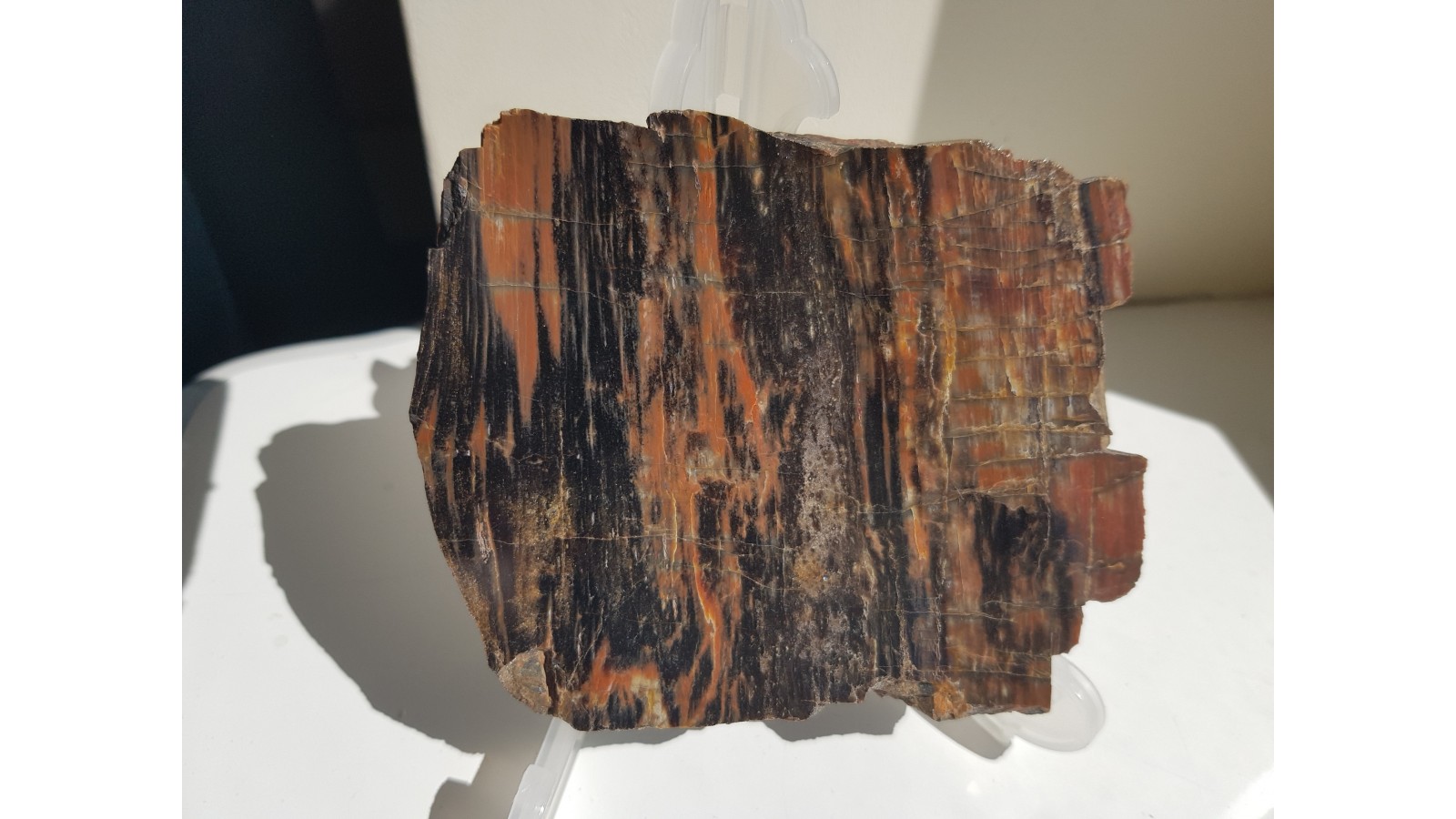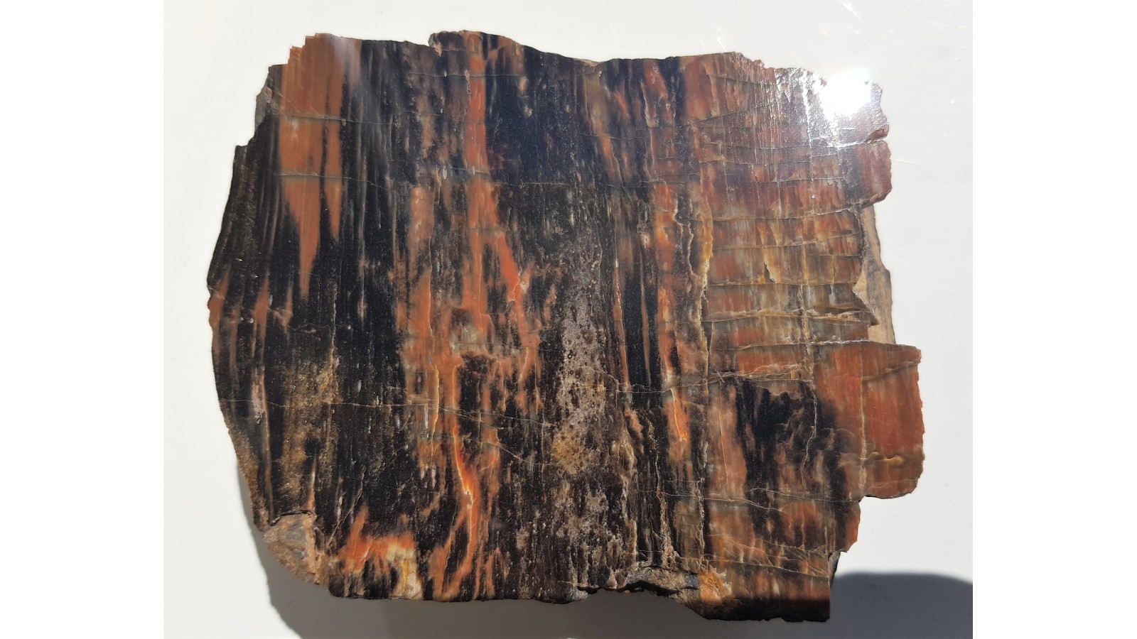Piękny, barwny okaz drewna skrzemieniałego pochodzący ze zlepieńców karbonu/permu z rowu Świerzawy (fragment depresji północnosudeckiej). Idealny poler, bardzo estetyczny okaz, wyrazista barwa. Strona przeciwna naturalna, nie cięta. Polecam.