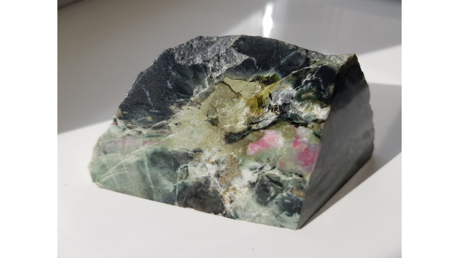 Ozdobny, pięknie wybarwiony (zieleń, róż, czerń), polerowany okaz skarnu z Łażan k. Żarowa zawierający minerały z grupy serpentynu oraz dokładnie niezidentyfikowane różowe minerały, prawdopodobnie zoisyt. Idealny poler, piękny okaz. Polecam.