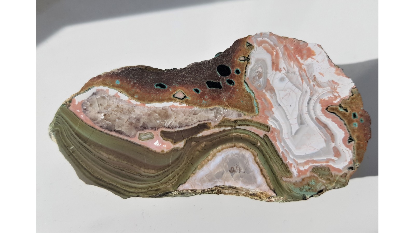 Piękny, kompletny agat z Lubiechowej w towarzystwie zmienionych porwaków. Okaz polerowany, strona przeciwna naturalna, cały migdał. Wyjątkowy okaz. Polecam.