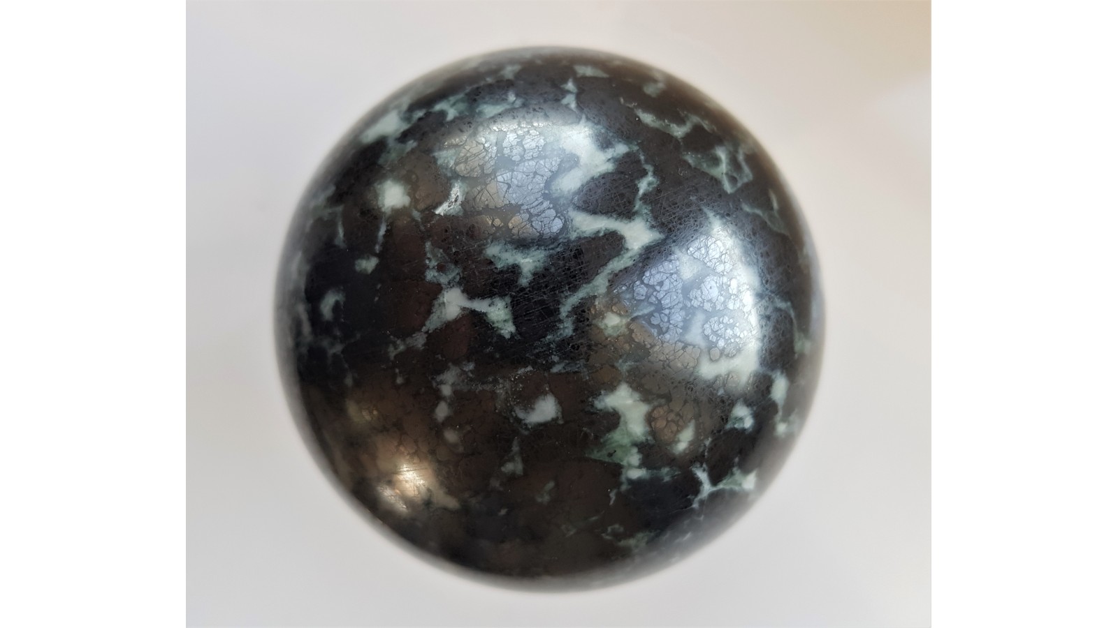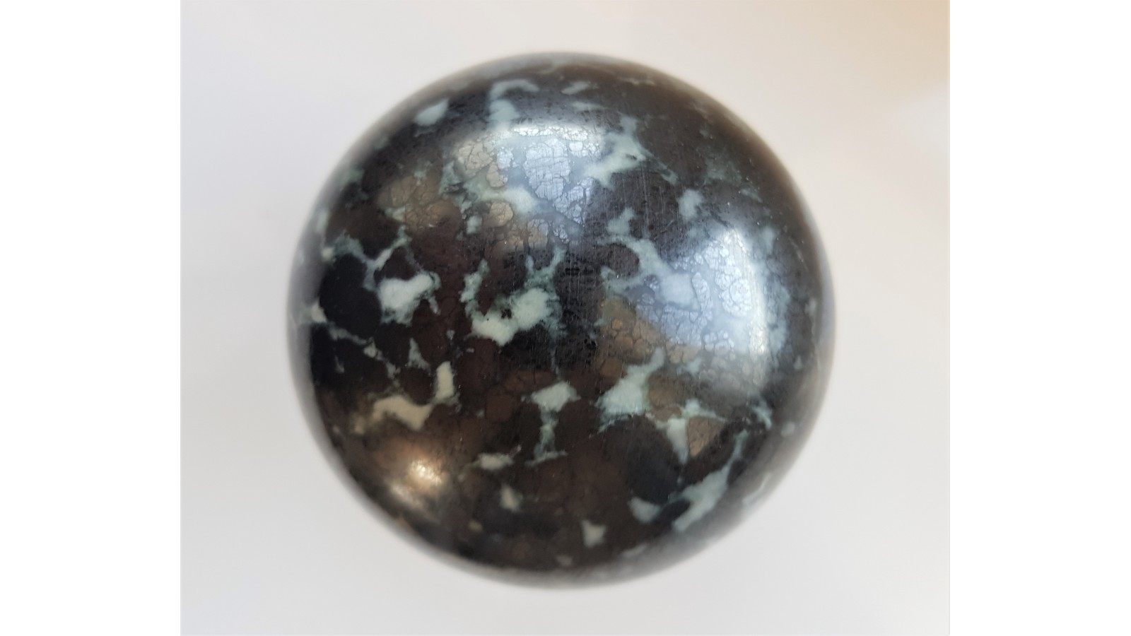Kula z wyjątkowego materiału - rudy chromitowej z kopalni chromitu na górze Czernica k. Tąpadeł k. Sobótki. W chromitach widoczne strefy bardziej brązowawe, lepiej polerujące się i jednolite oraz bardziej "żelaziste", stalowe. Są to według danych dotyczących złoża pierwotne pikotyty (spinele z zawartością Mg), magnesiochromity bądź chromity glinowe oraz chromity i magnetyty, które są wtórne w stosunku do pikotytu. Piękny poler, świetny deseń, gdyż duże ziarna chromitu są niejako "zatopione" w jasnym serpentynie. Zdecydowanie w materiale przeważa chromit. Polecam.