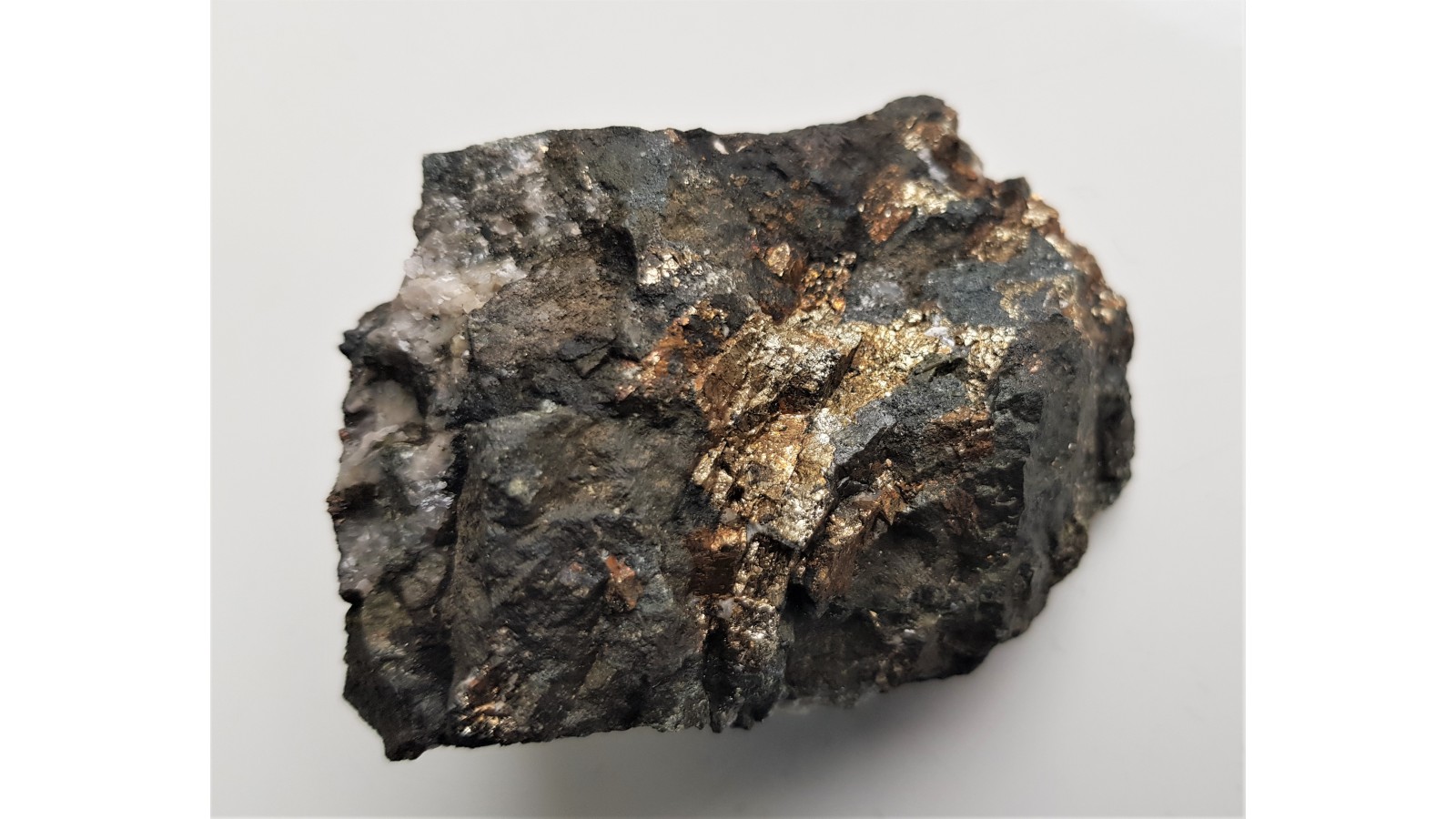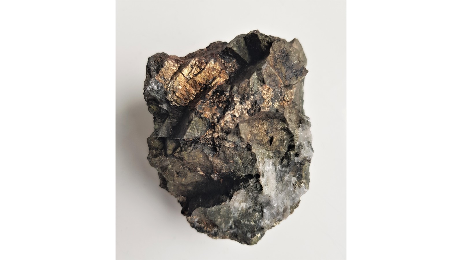 Piryt z Kowar. Widoczne liczne ścianki pirytów oraz zarysy kryształów. Dosyć duża brykła cała przerośnięta pirytem.