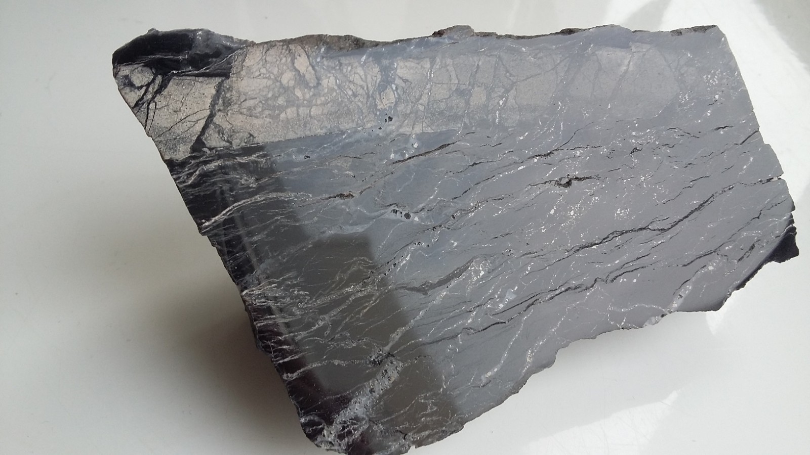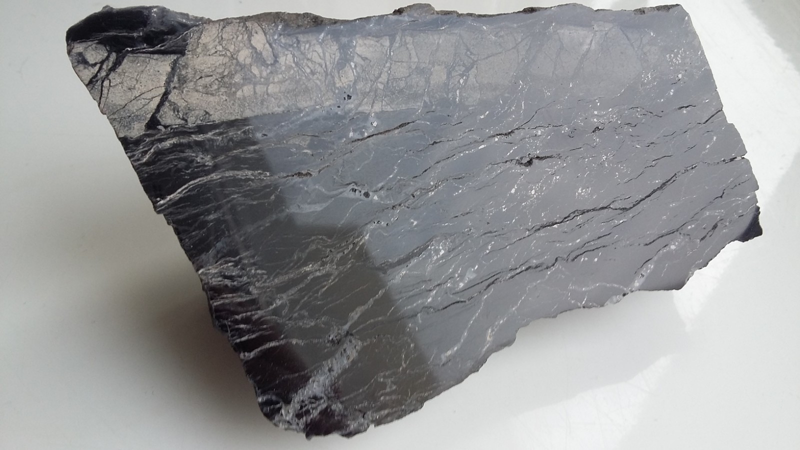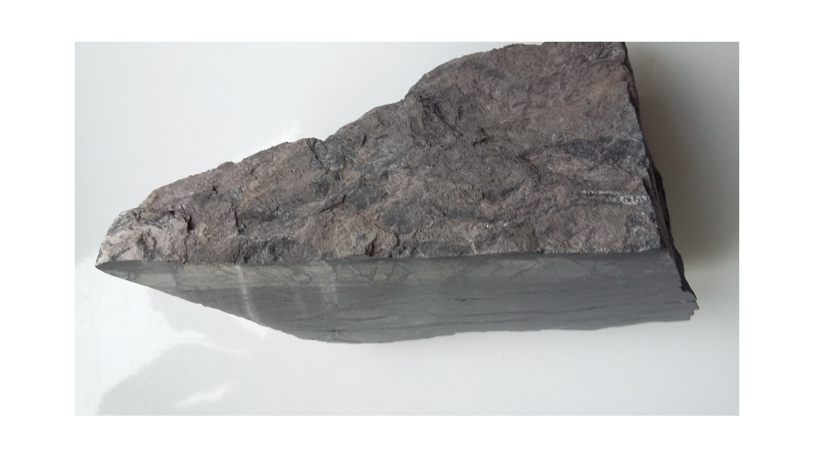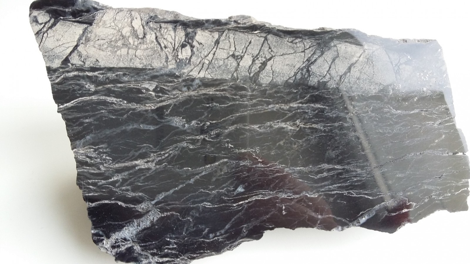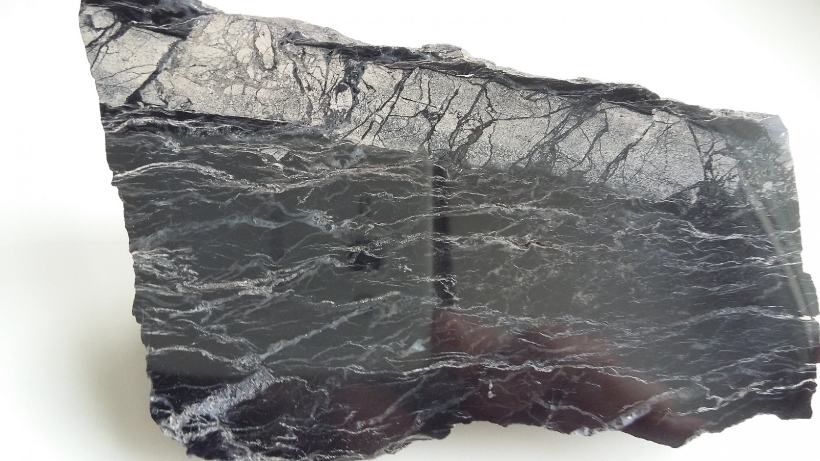Skała z bezpośredniego kontaktu ryolitów okolic Świerzawy ze skałami osłony - sylurskimi, skrzemionkowanymi łupkami grafitowymi.