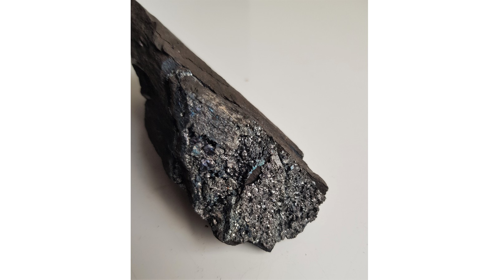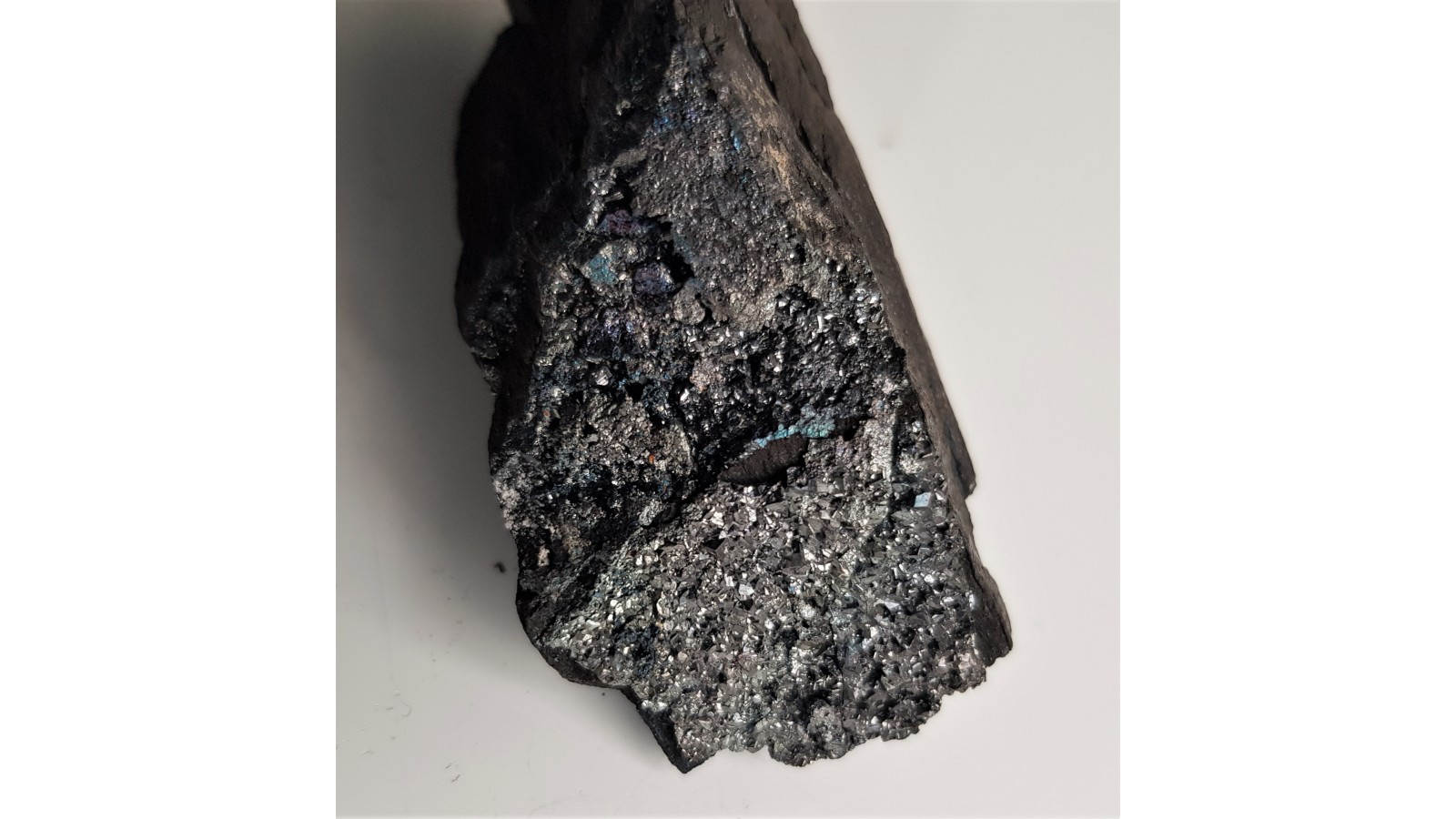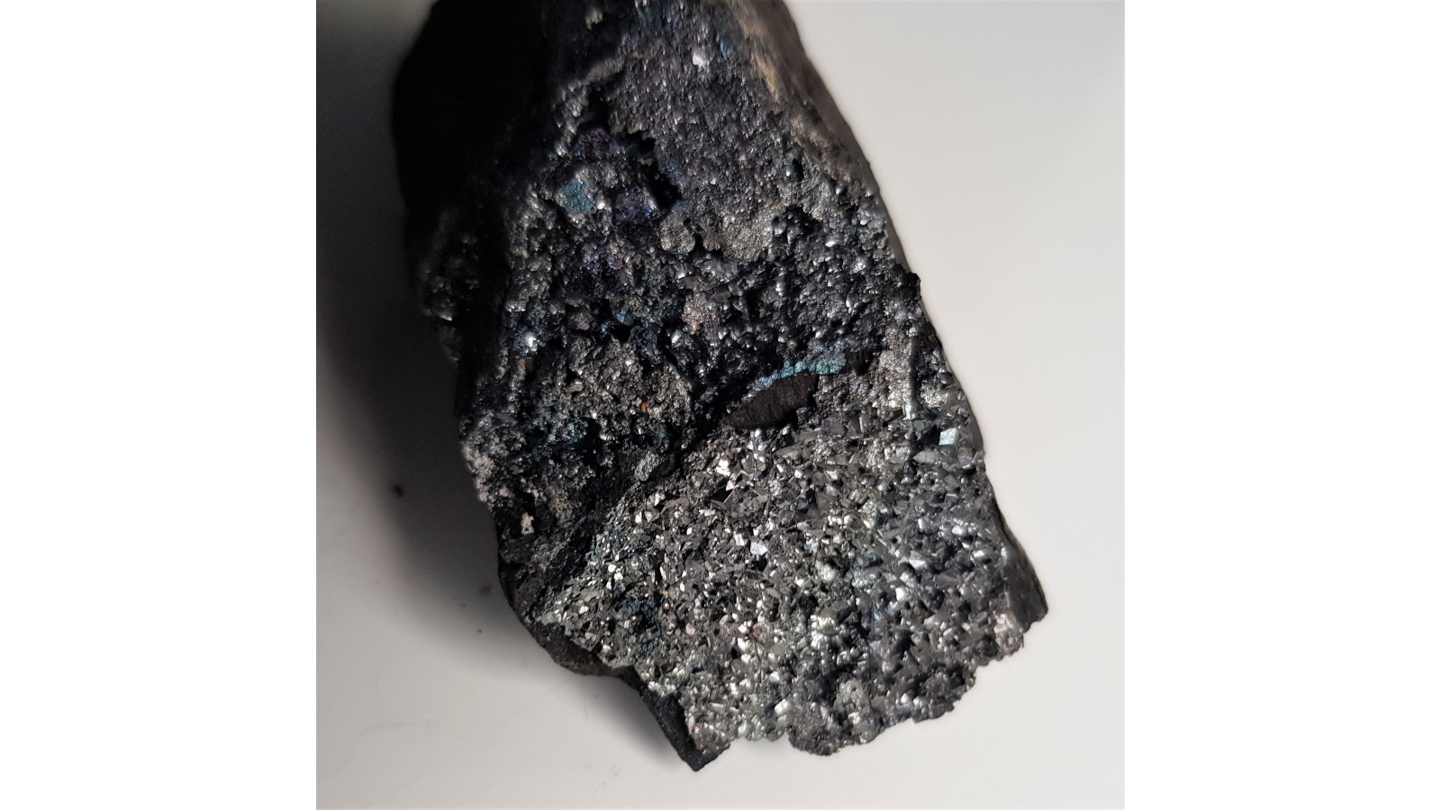 Szczotka idealnie wykształconych kryształów tennantytu z pięknym połyskiem narośniętych w szczelinach łupków miedzionośnych. Piękny okaz kolekcjonerski i rzadkość. Polecam.