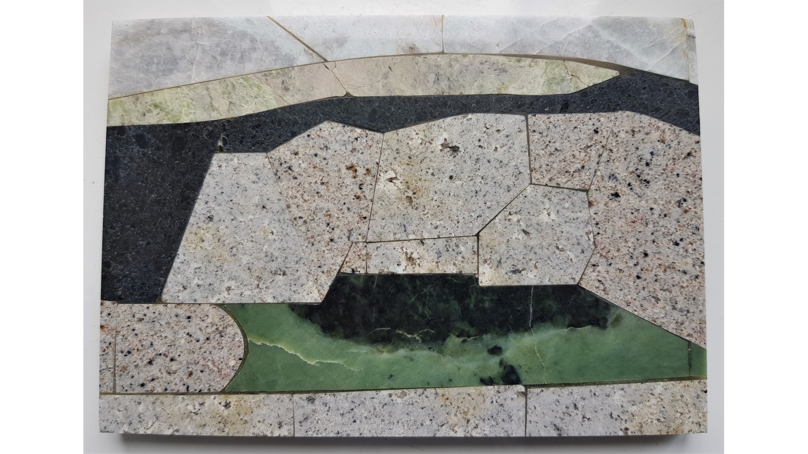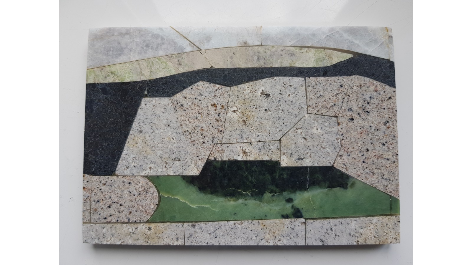 Mozaika wykonana z następujących dolnośląskich kamieni ozdobnych: granitu ze Szklarskiej Poręby-Huty, serpentynitu, rodingitu, masywnego błękitnego albitu oraz ciemnego pikrytu z Wojcieszowa. Całość na marmurze ze Stronia Śląskiego, polerowana. Przykład wyrobu ozdobnego z kamieni dolnośląskich, pejzaż z kamieniołomem granitu. Polecam.