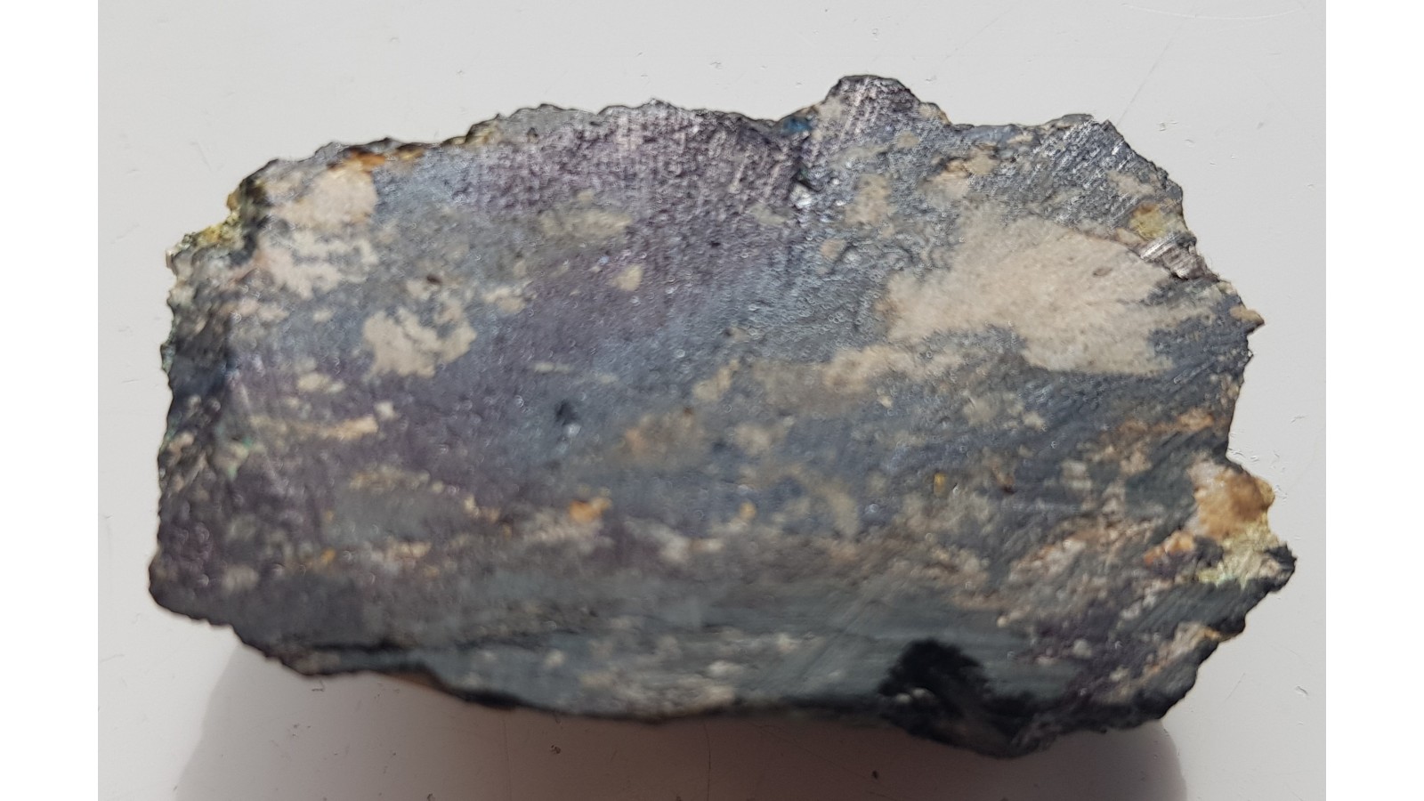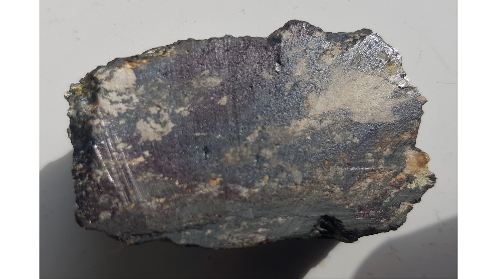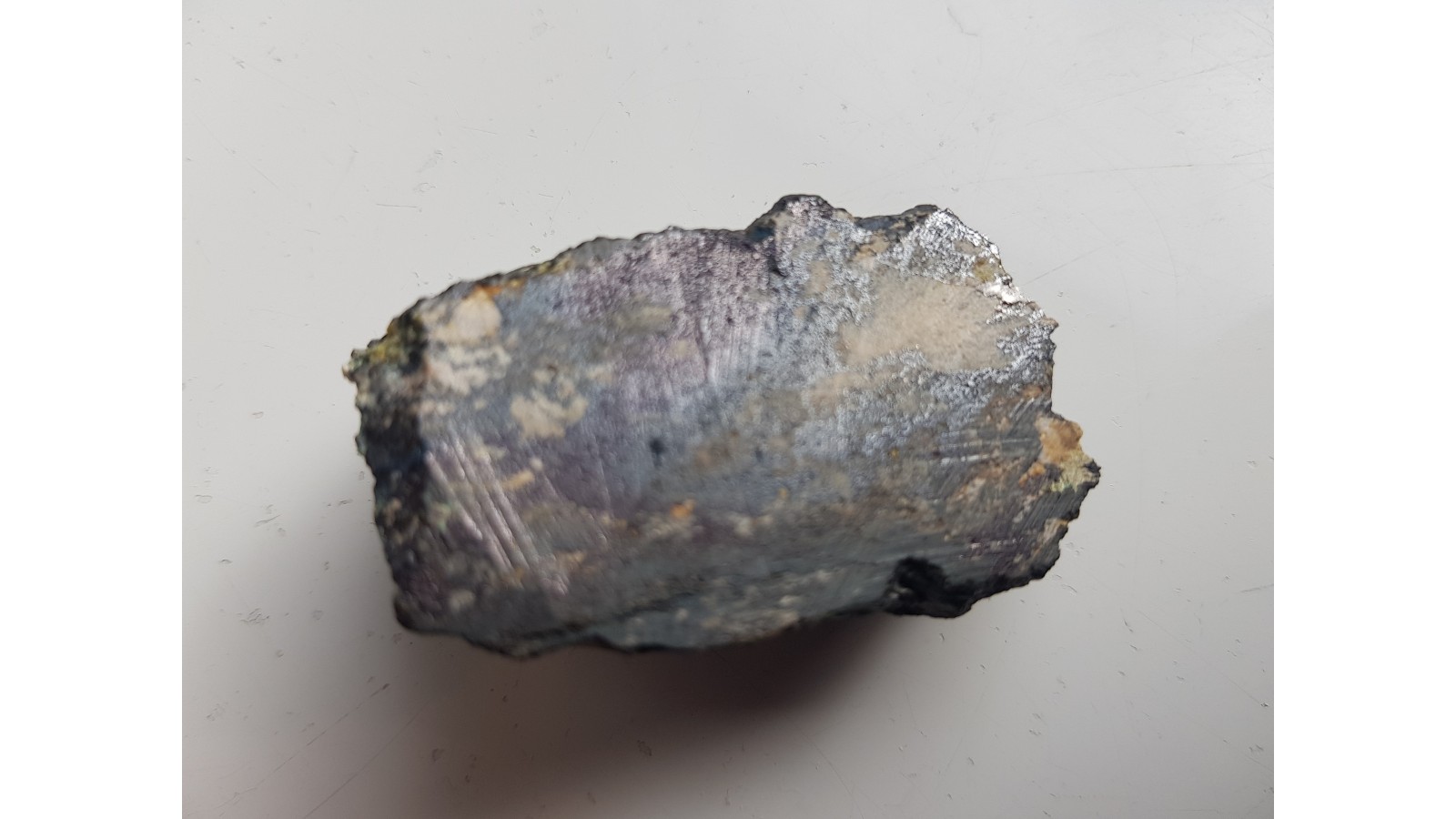 Duże skupienie srebra rodzimego wrośniętego w żyłę okruszcowaną bornitem. Treść żyły stanowią też kalcyt i baryt. Srebro widoczne na przekroju, po cięciu, celowo nie polerowane, aby nie "zgubić" masy srebra. Wyraźnie widoczne, intensywnie odbija światło (wysoki współczynnik refleksji). Okaz z hałdy dawnej kopalni w Ciechanowicach k. Miedzianki w Sudetach. Srebro widoczne na brzegou okazu. Sam wrostek srebra ma około 3 mm średnicy. Rzadkość mineralogiczna. Polecam.