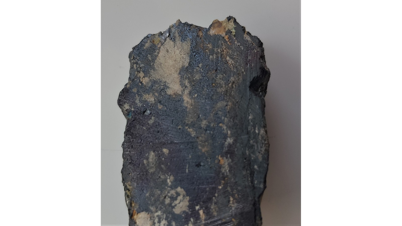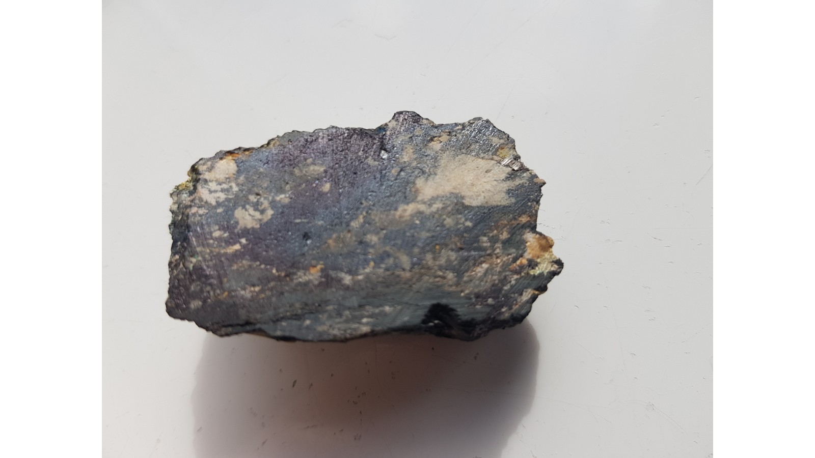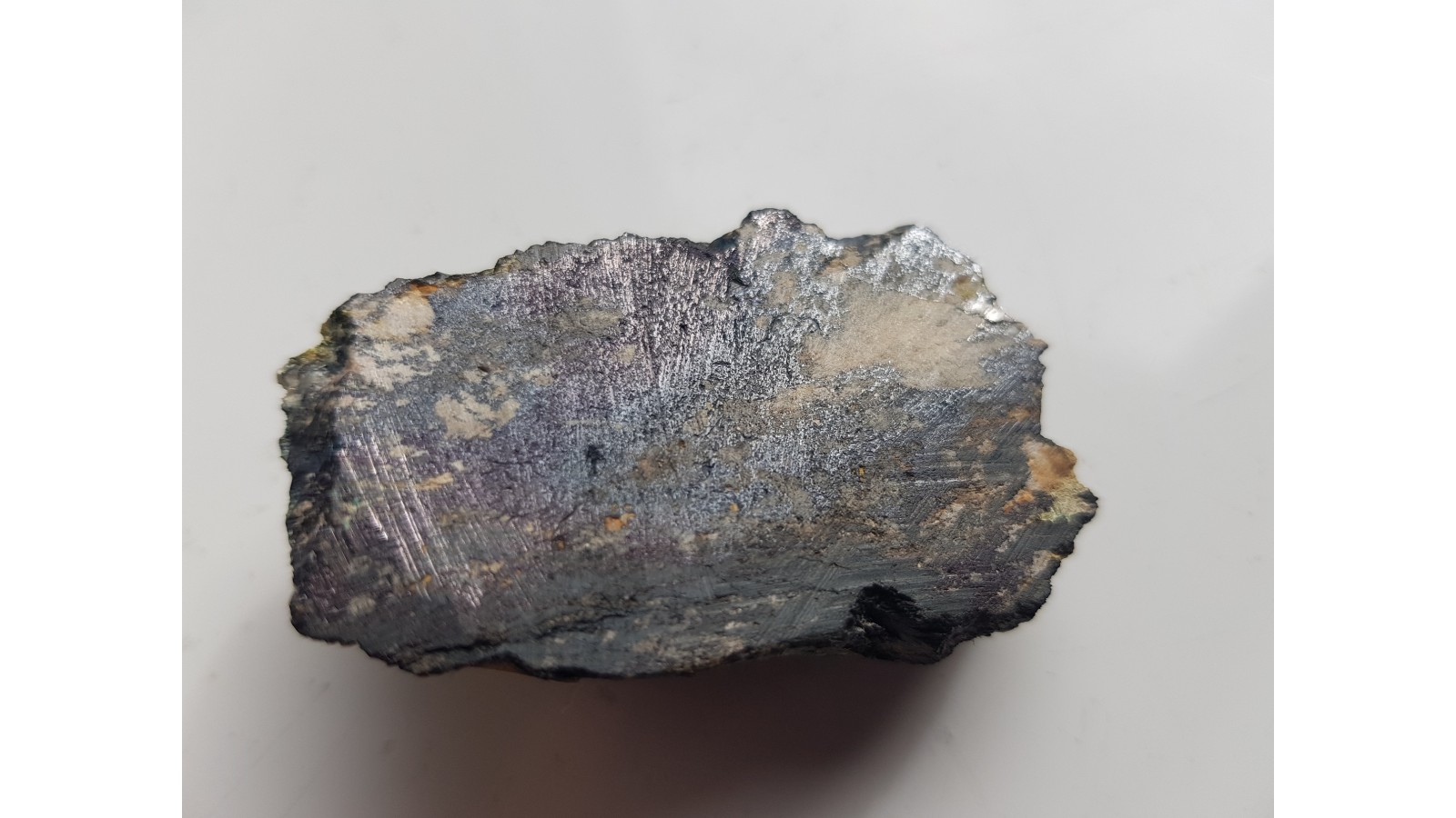Duże skupienie srebra rodzimego wrośniętego w żyłę okruszcowaną bornitem. Treść żyły stanowią też kalcyt i baryt. Srebro widoczne na przekroju, po cięciu, celowo nie polerowane, aby nie "zgubić" masy srebra. Wyraźnie widoczne, intensywnie odbija światło (wysoki współczynnik refleksji). Okaz z hałdy dawnej kopalni w Ciechanowicach k. Miedzianki w Sudetach. Srebro widoczne na brzegou okazu. Sam wrostek srebra ma około 3 mm średnicy. Rzadkość mineralogiczna. Polecam.