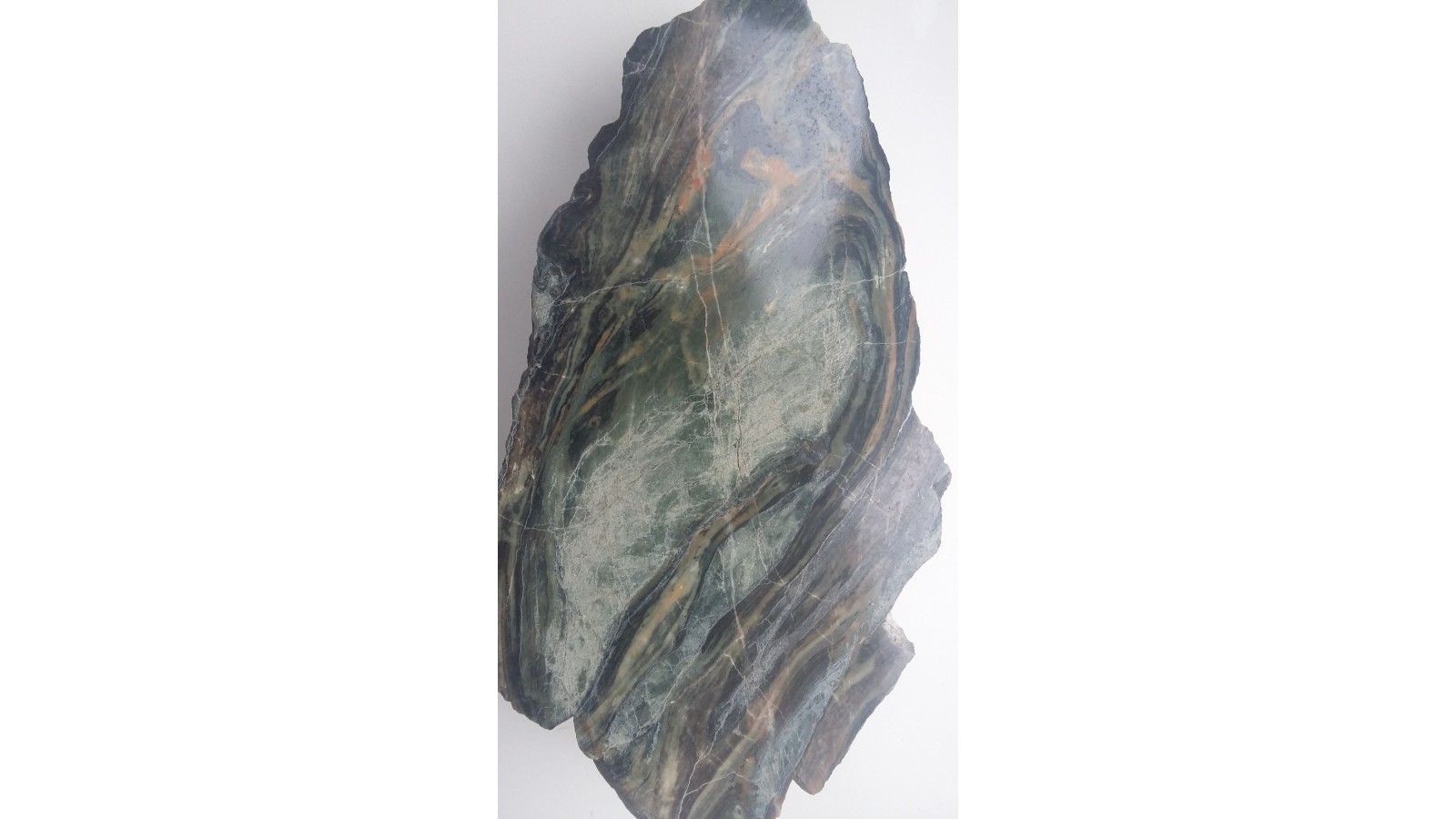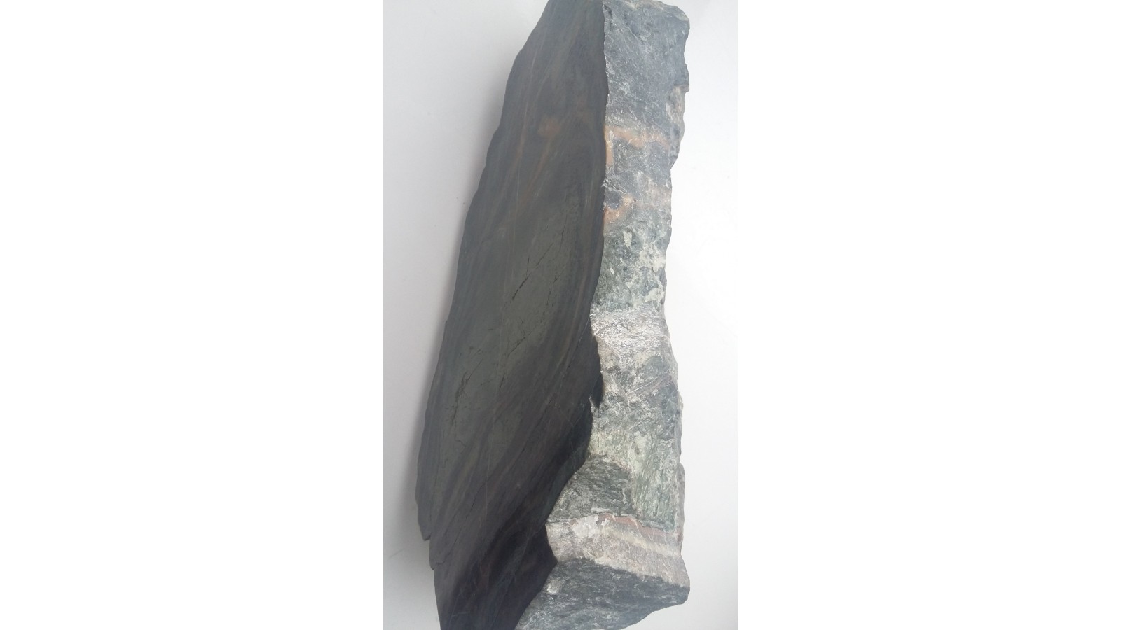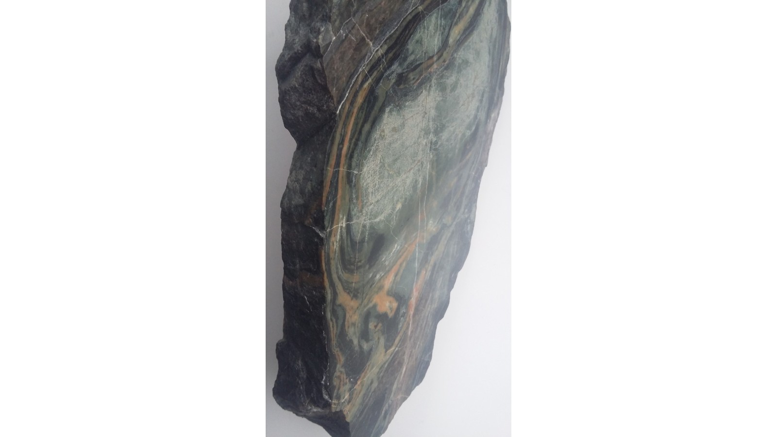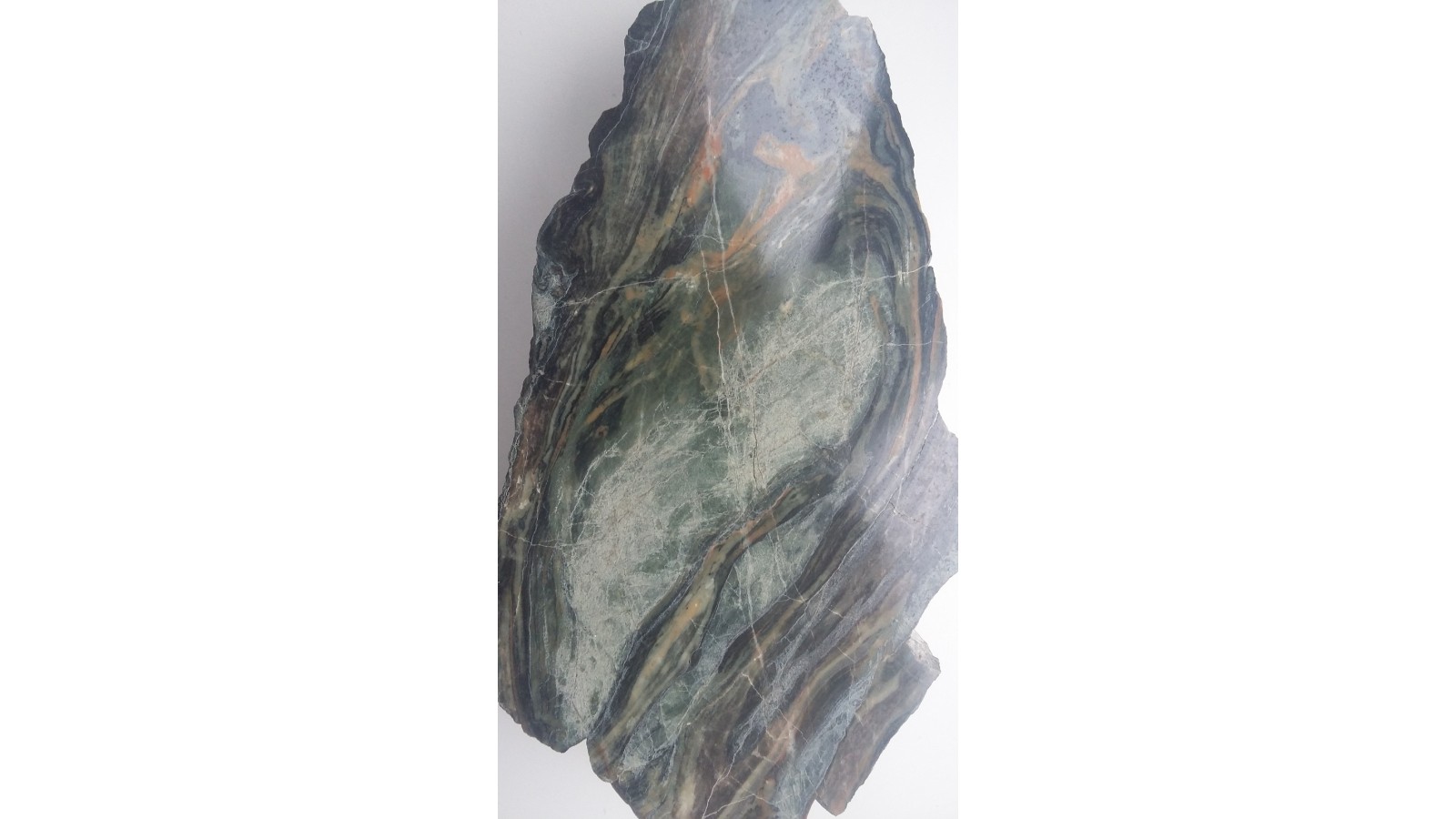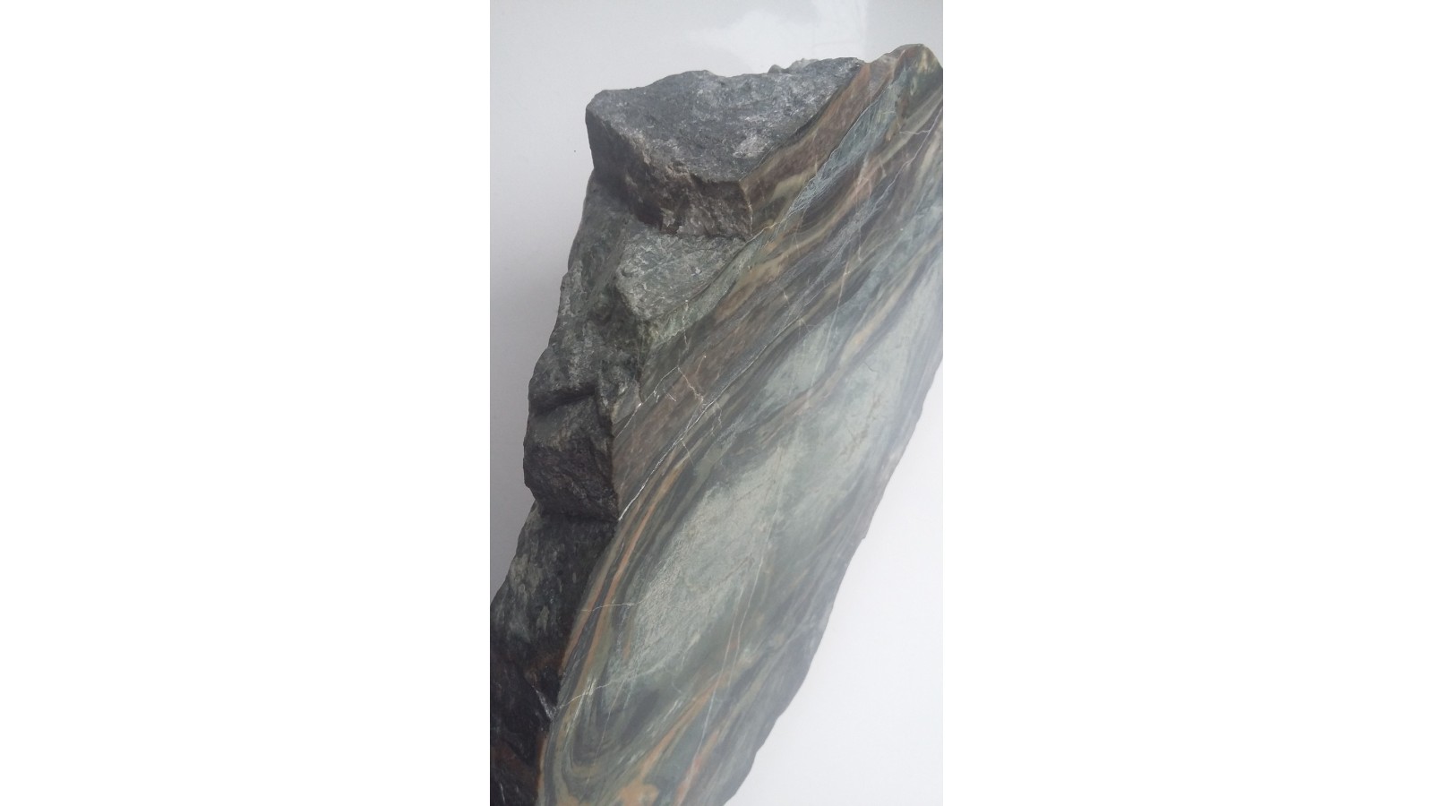 Wyjątkowa z uwagi na zafałdowanie oraz piękny deseń i zestawienie barw skała wapniowo-krzemianowa z dawnej kopalni Wulkan w Kowarach. Duży polerowany okaz. Wspaniała rzecz do kolekcji petrologicznej.