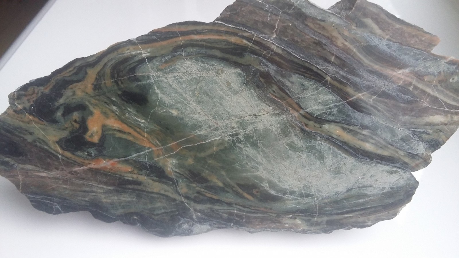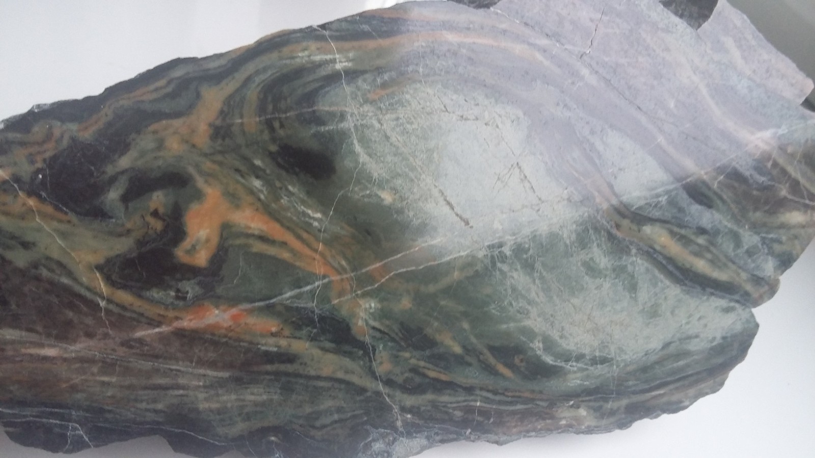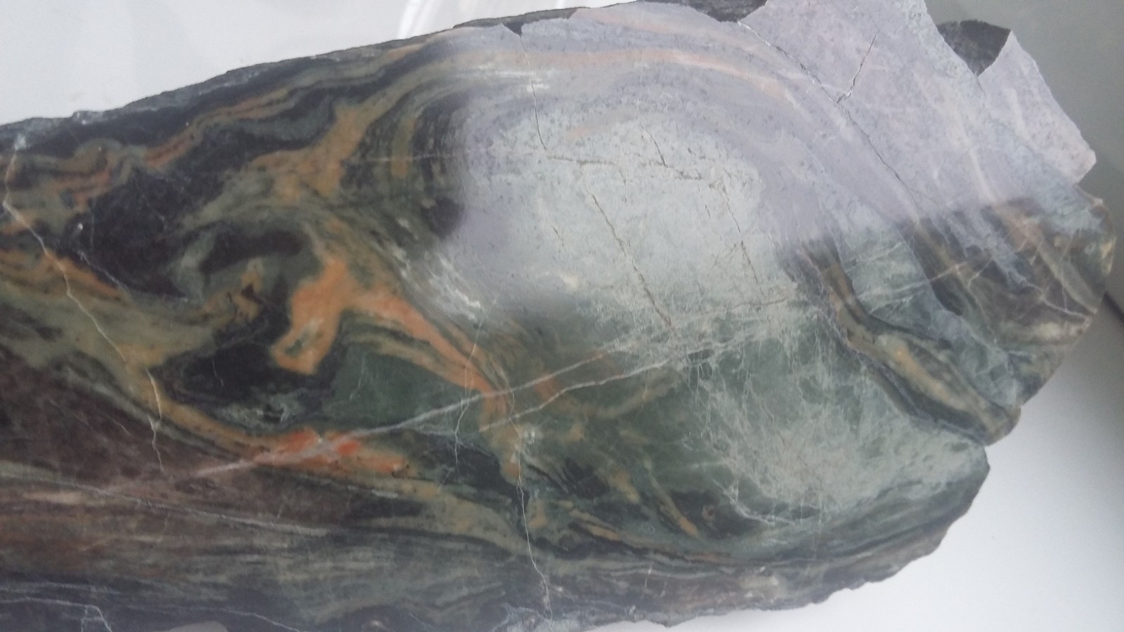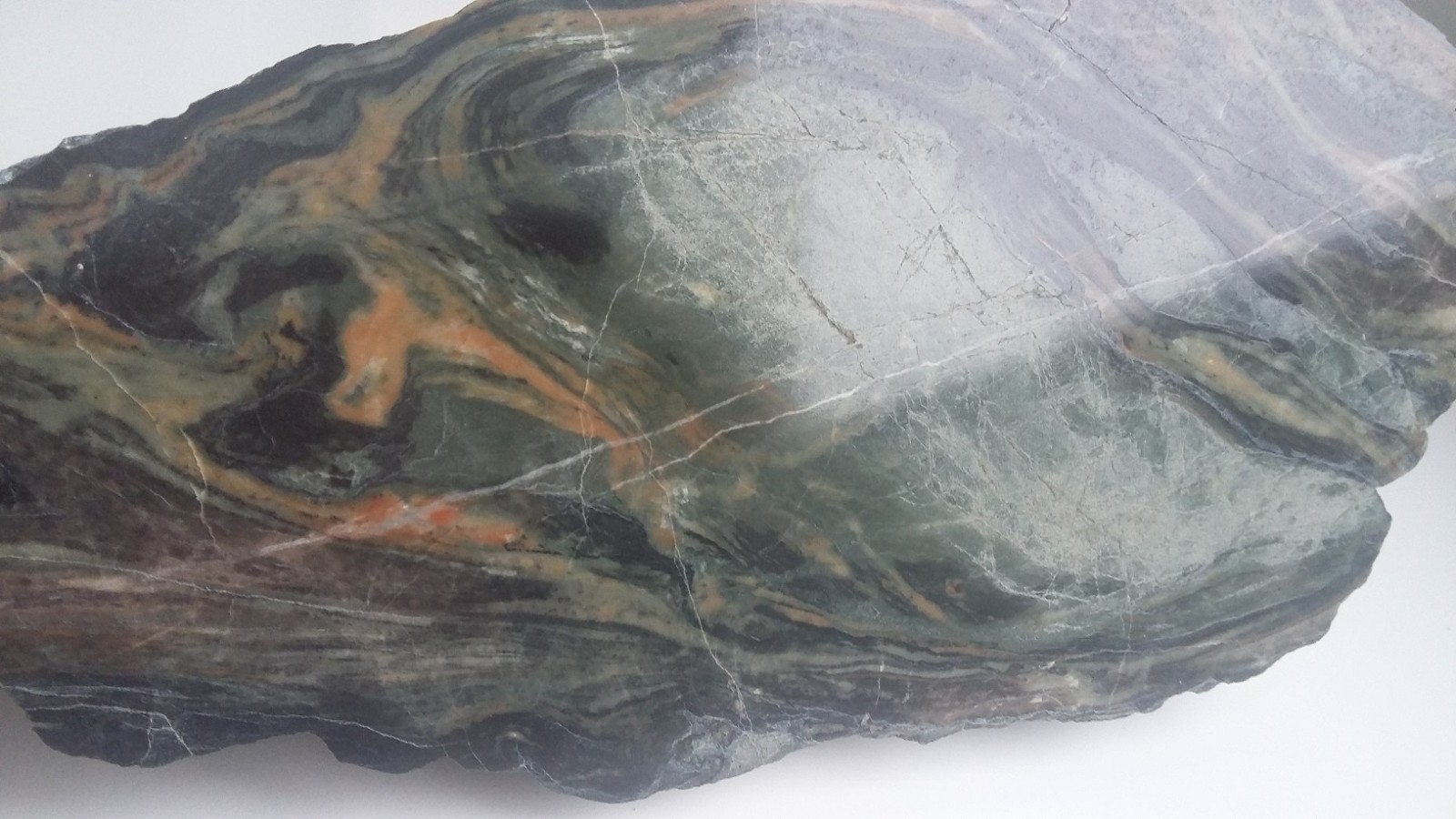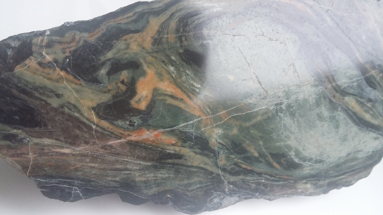 Wyjątkowa z uwagi na zafałdowanie oraz piękny deseń i zestawienie barw skała wapniowo-krzemianowa z dawnej kopalni Wulkan w Kowarach. Duży polerowany okaz. Wspaniała rzecz do kolekcji petrologicznej.