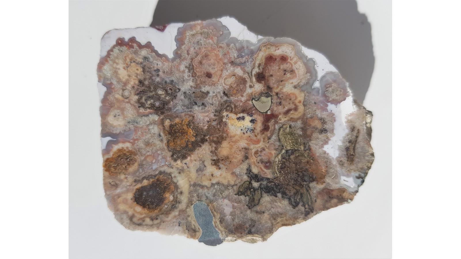 Agat, skała agatowa, barwna, niespękana z Czadrowa k. Kamiennej Góry. Okaz z historycznej lokalizacji. Polecam.