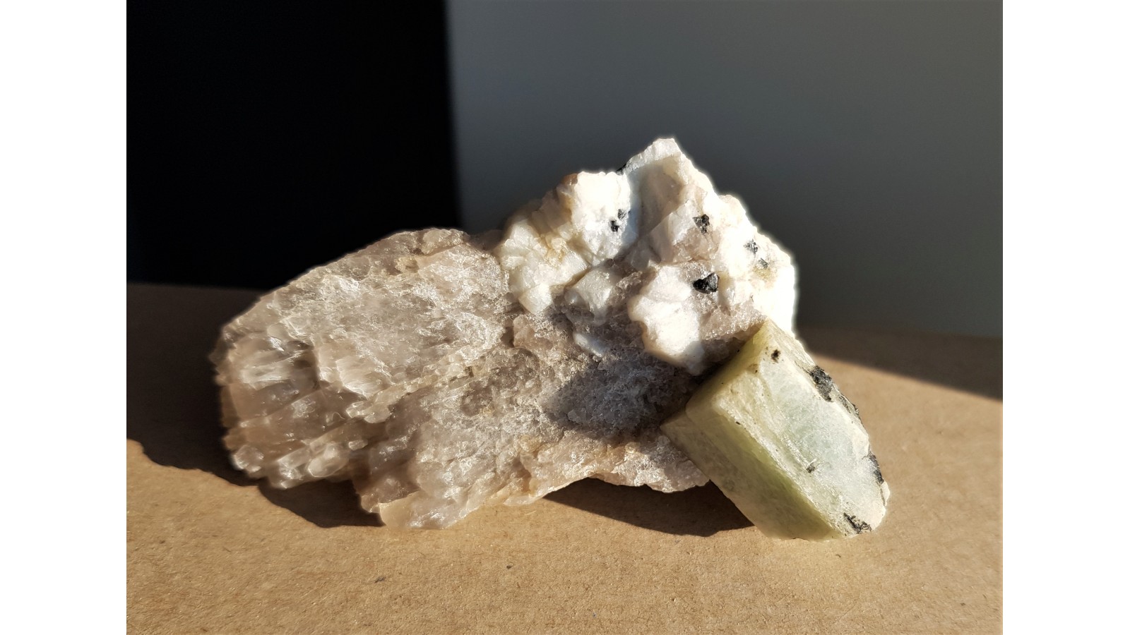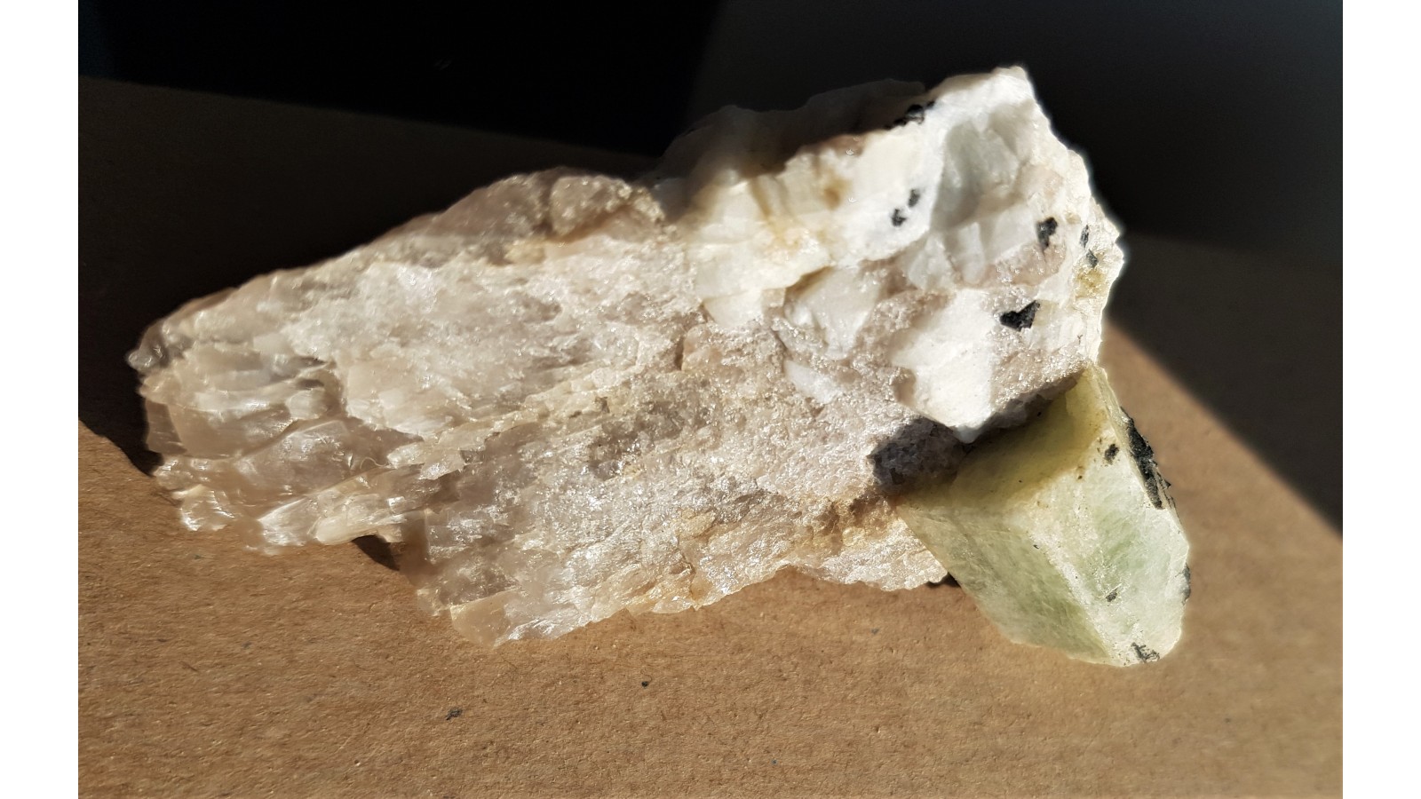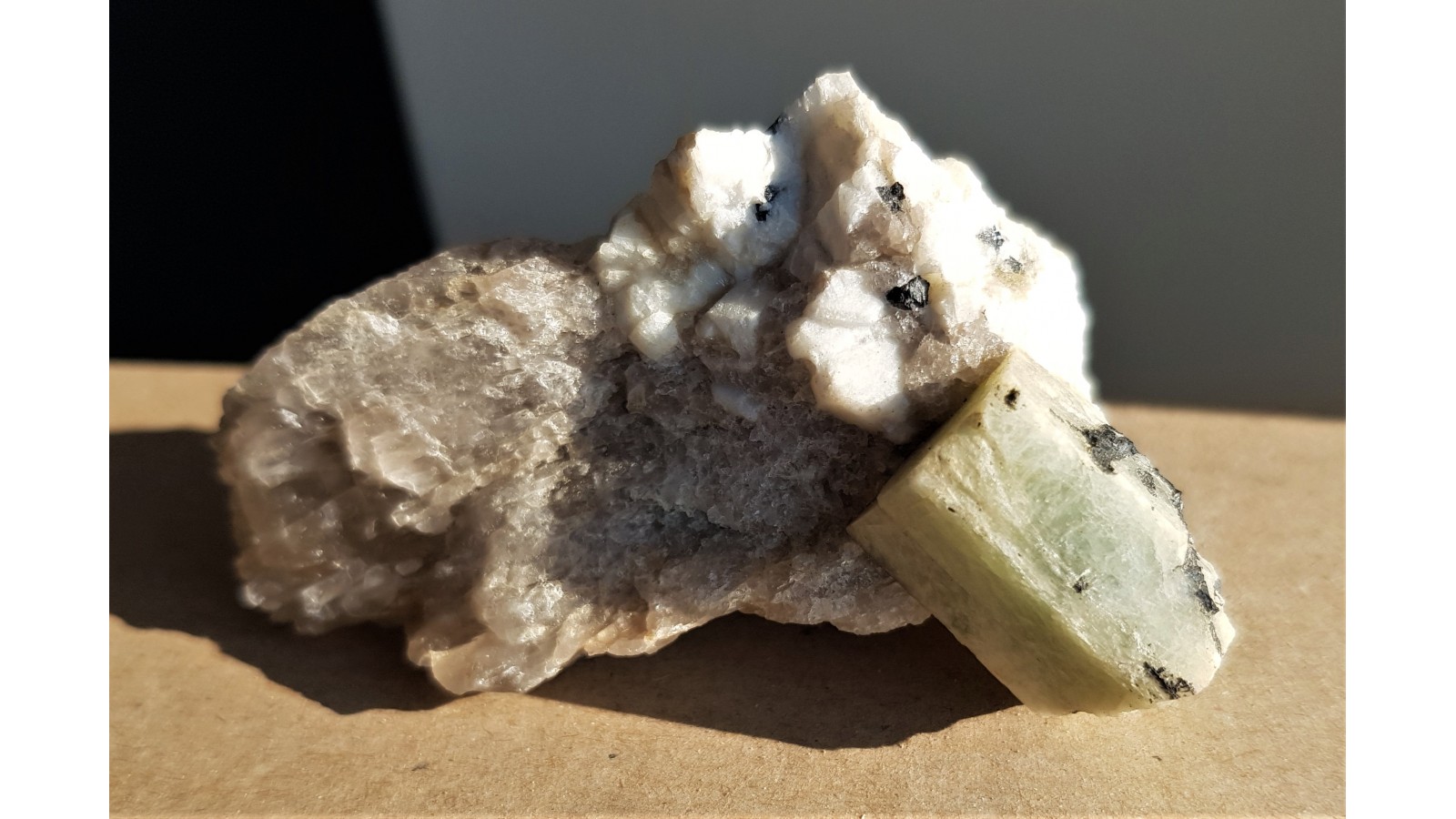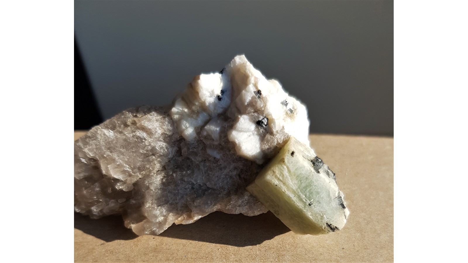 Pięknie wykształcony, idealnie zakończony, ze ścianami z połyskiem, zielony kryształy berylu wrośnięty w pegmatyt z Piławy Górnej. Bardzo estetyczny okaz bez uszkodzeń, ustawny. Polecam.