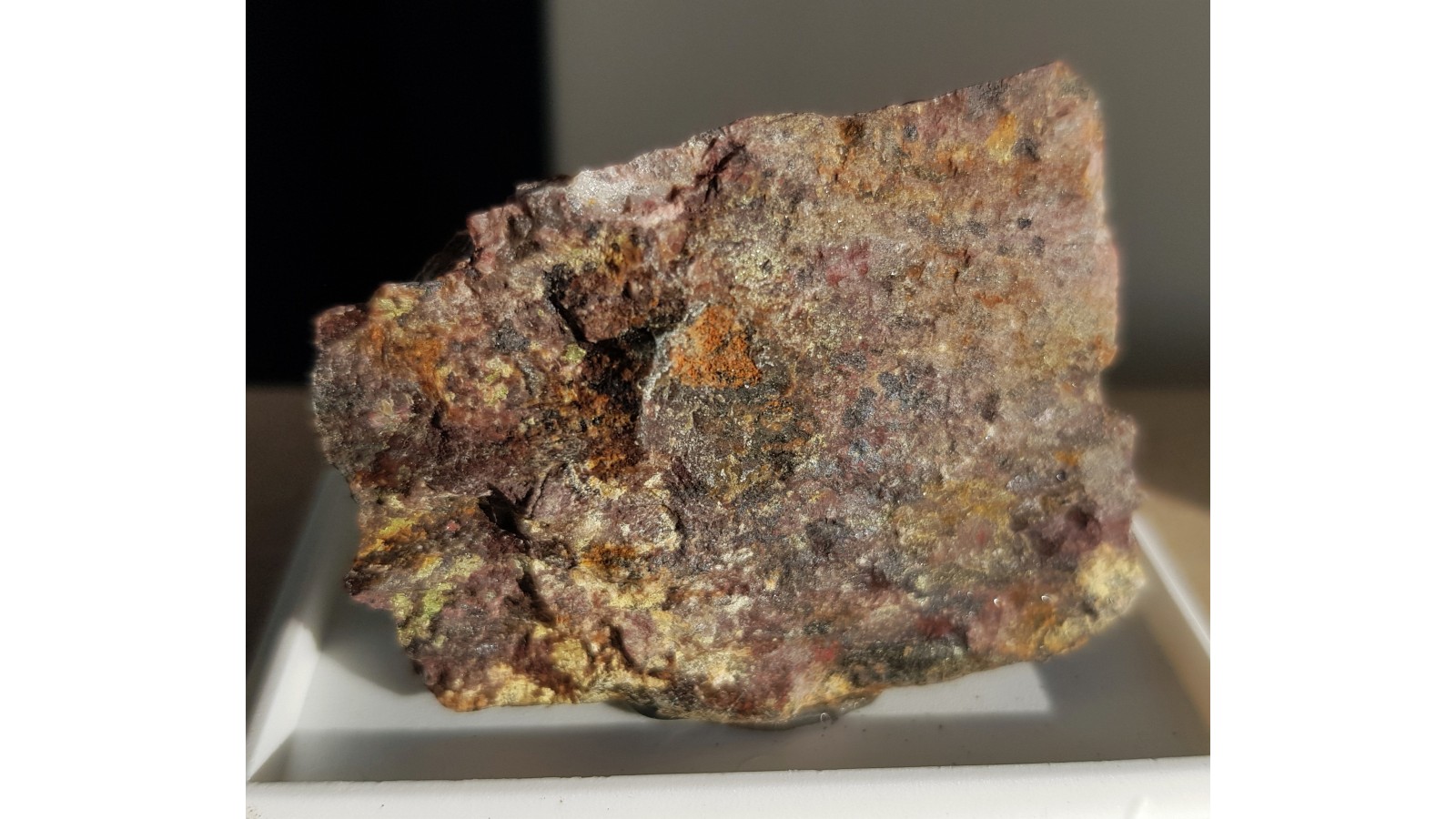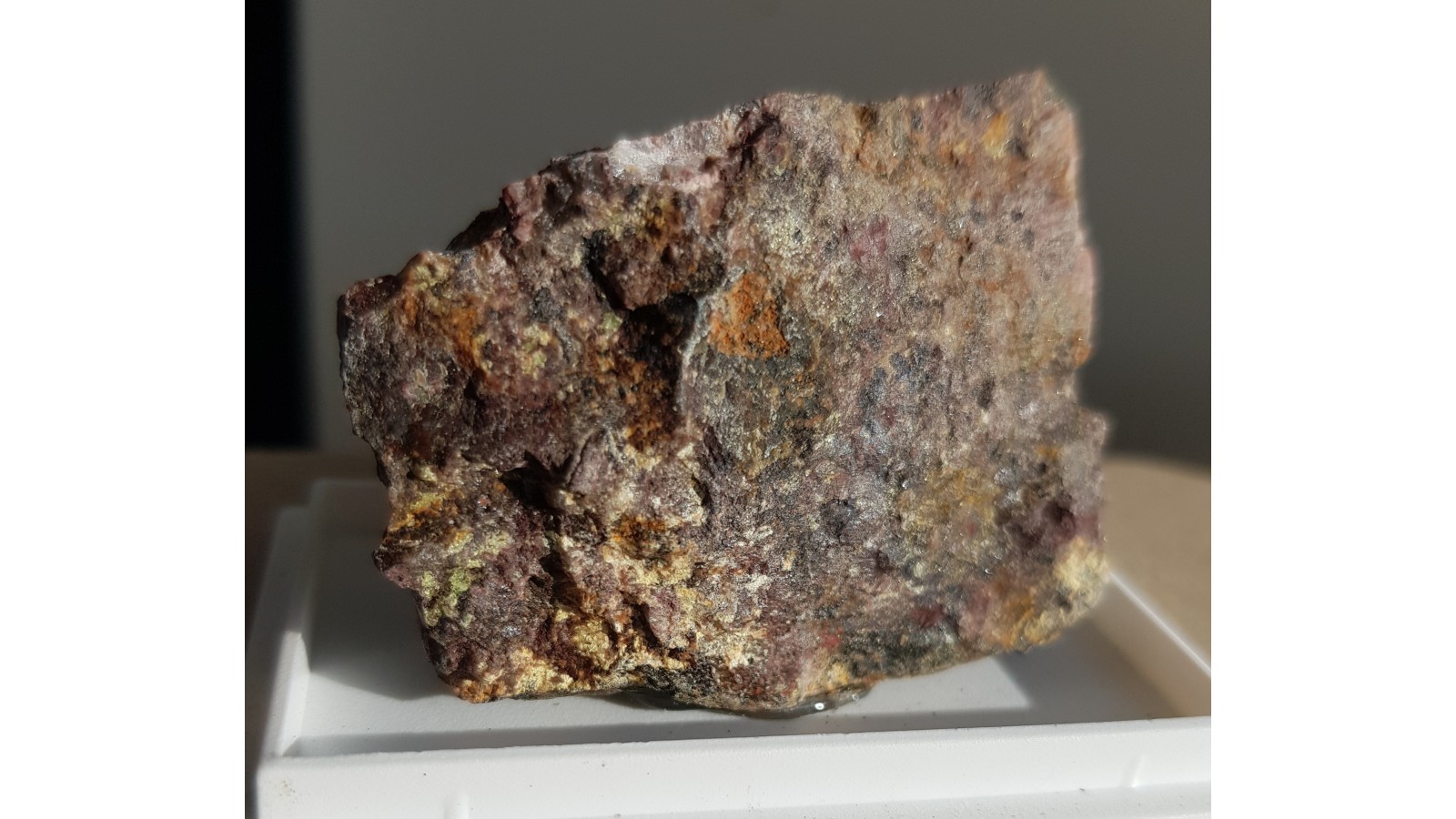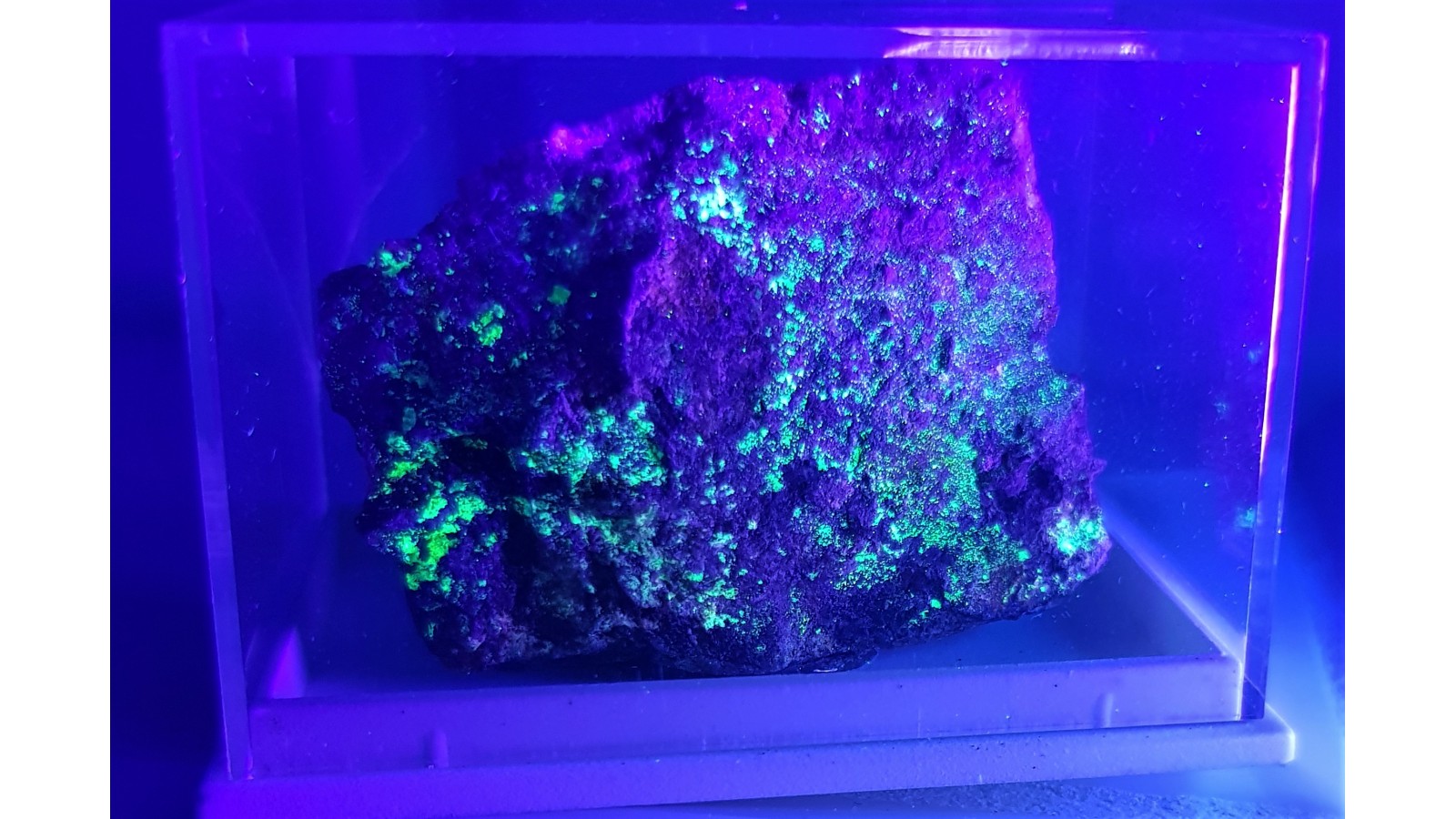 Naskorupienia zielonożółtego autunitu na skale macierzystej z Kowar Górnych. Piękne świecenie w UVA, które pokazuje rozmieszczenie minerału na skale. Rzadki fosforan wapnia z grupą uranylową. Ciekawostka mineralogiczna z Sudetów. Polecam zaawansowanym kolekcjonerom.