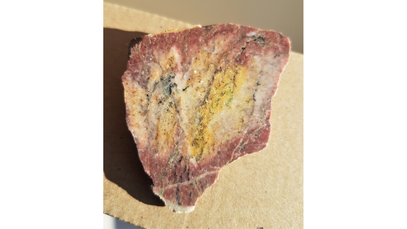 Polerowany okaz ozdobnej skały kwarcowo-łyszczykowej z okolic Wojborza (tzw. Garb Golińca) k. Nowej Rudy. Skała barwna z dendrytami. Niewielki okaz, ale estetyczny. Polecam.