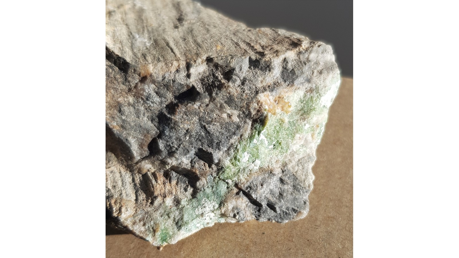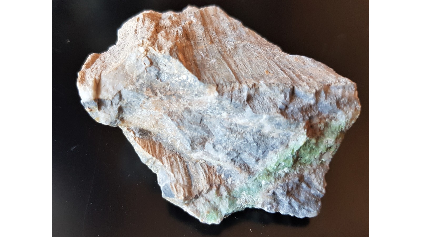 Okaz wavellitu/waryscytu z Pustkowa Wilczkowskiego koło Wrocławia. Impregnacja w sylurskim łupku grafitowym, a w szczególności w tnącej go żyłce kwarcowej. Zdecydowanie inna barwa niż turkusu oraz widoczne przekroje przez kuleczkowate skupienia małych kryształków wavellitu - intersekcji koloidalnych skupień minerału. Rzadko występujące okazy z tej lokalizacji. Polecam.