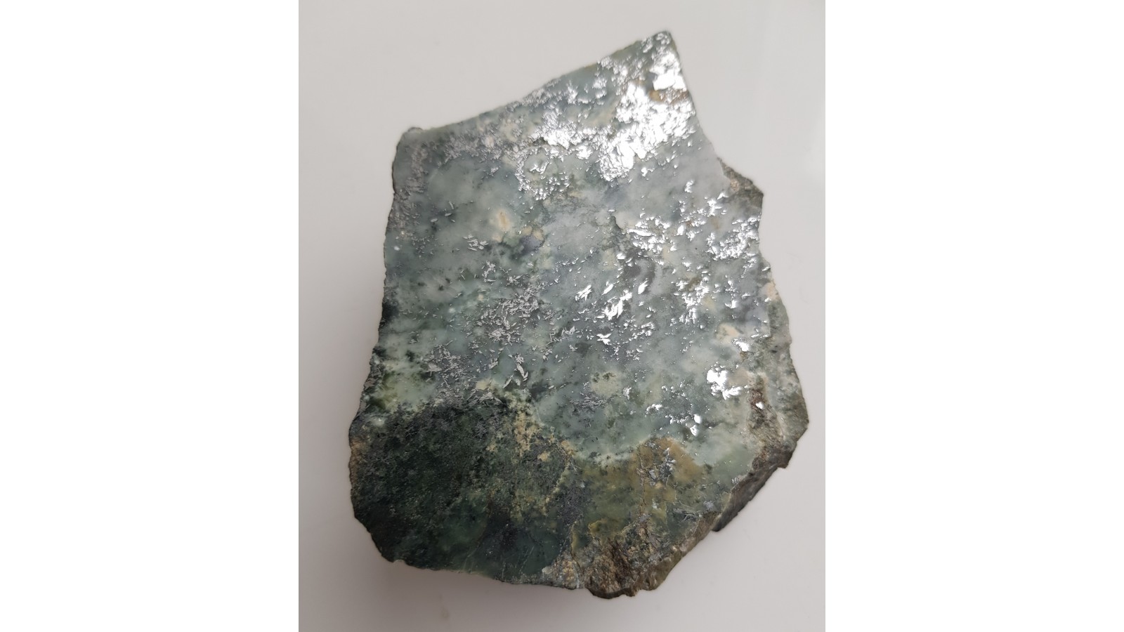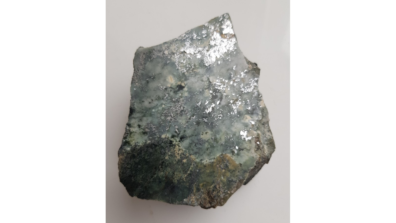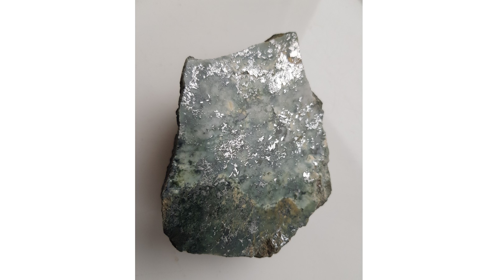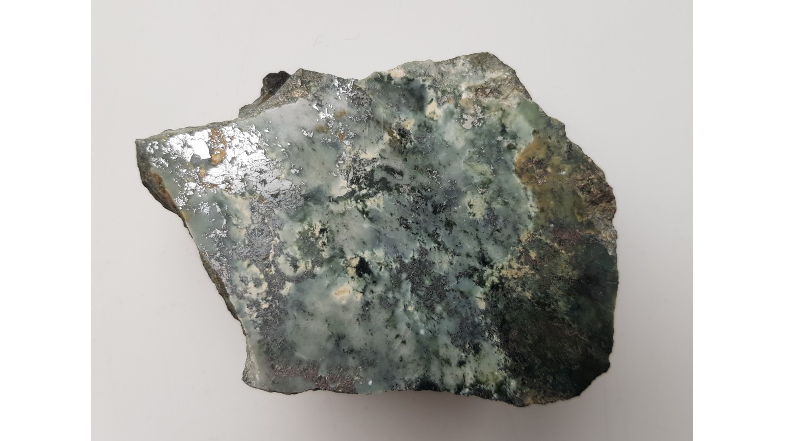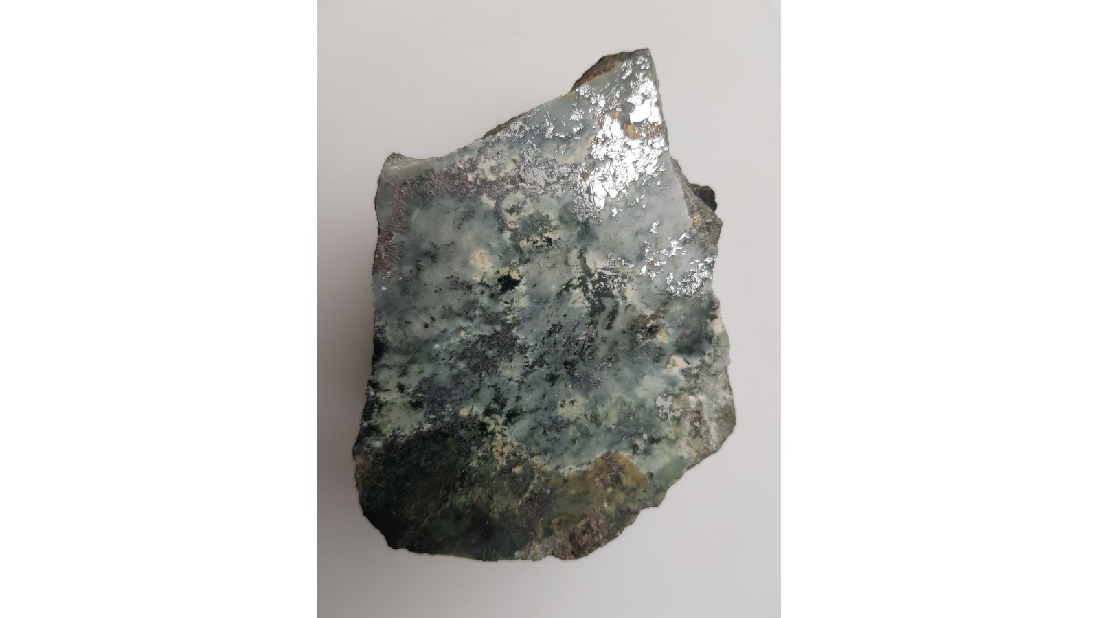 Polerowany okaz okruszcowanego nefrytu ze Złotego Stoku. Jasny nefryt, historyczna lokalizacja. Nefryt o rzadkiej genezie skarnowej (inny typ w stosunku do jordanowskiego powstającego wskutek przemian serpentynitów). Strona przeciwna naturalna, nie cięta. Polecam.