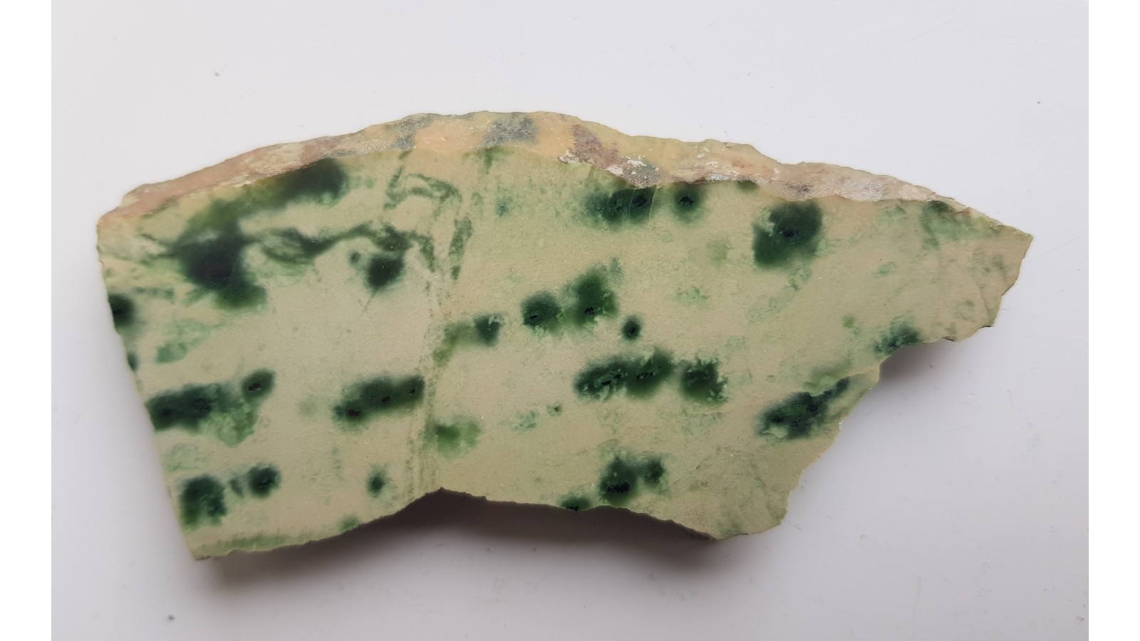Polerowany okaz rodingitu z Naslawic. Okaz jasny z intensywnie zielonymi piętnami i smugami, w środku których znajdują się metalicznie błyszczące spinele chromowe. Intensywne barwy (najprawdopodobniej granat chromowy). Świetny poler. Polecam.