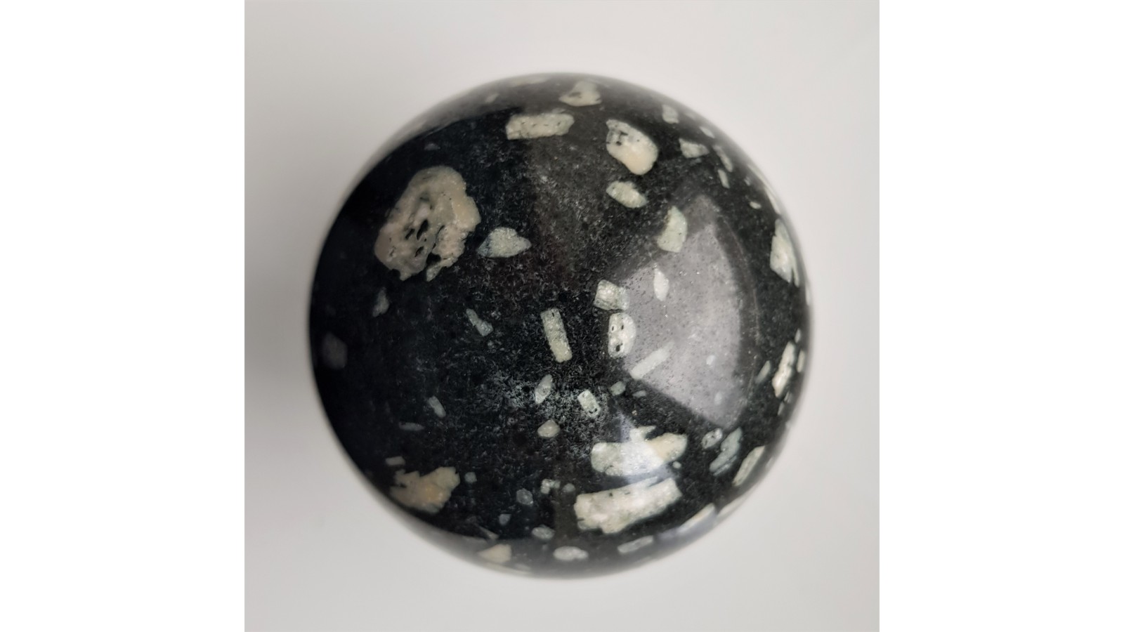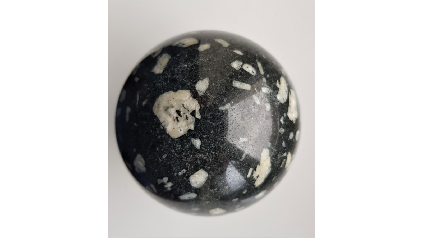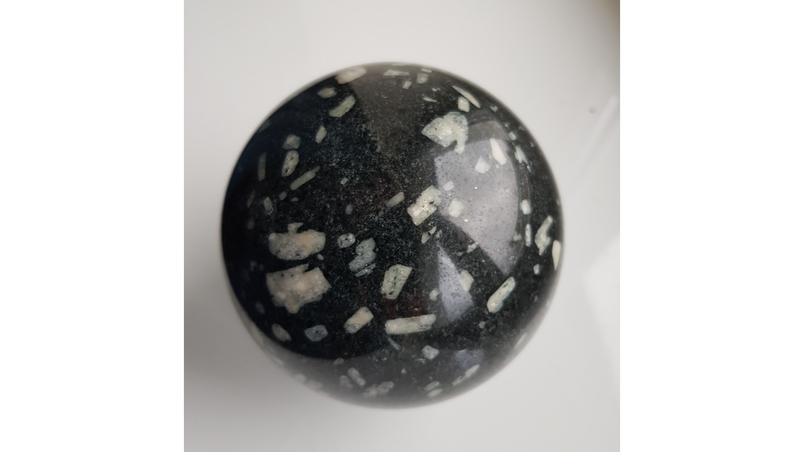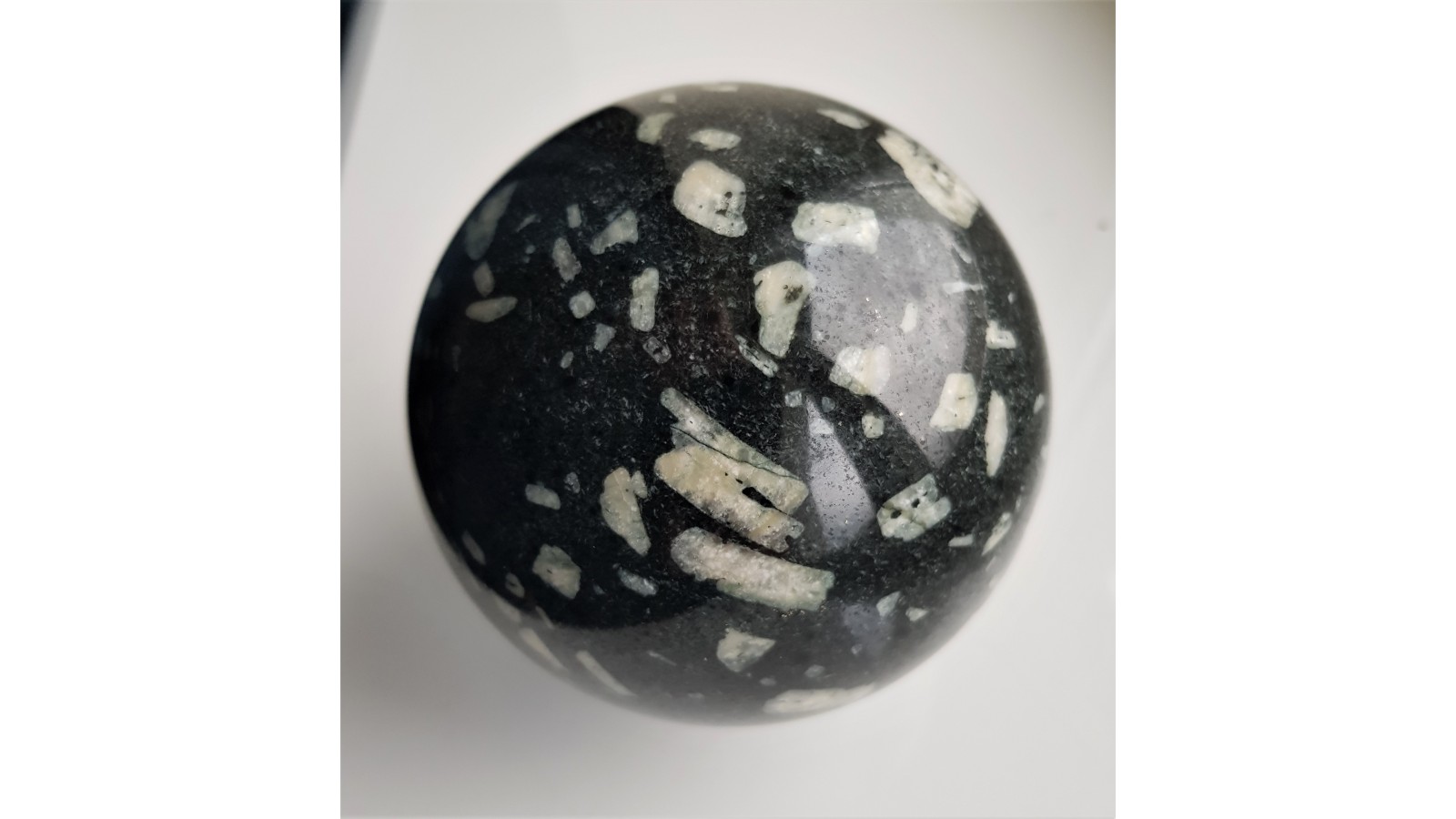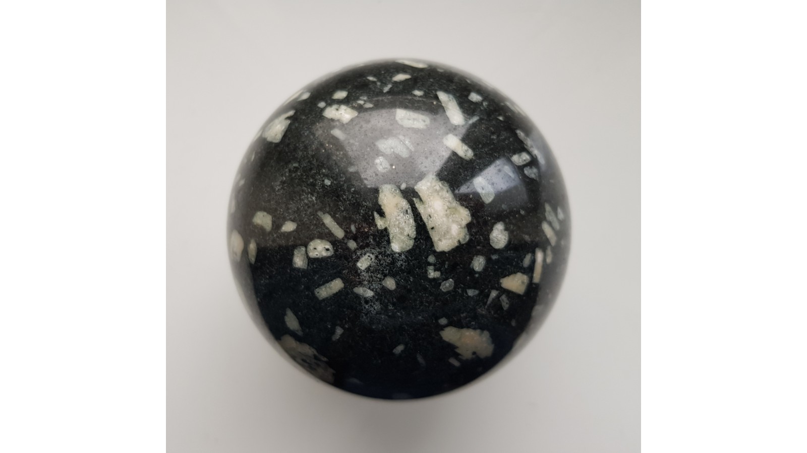 Wyjątkowa, absolutnie niespękana, piękna i duża kula ze skały typu dolerytu o więźbie porfirowej, w której duże kryształy skaleni są zanurzone w drobnokrystalicznym cieście skalnym. Idealny poler, bardzo estetyczna. Eratyk z województwa lubuskiego. Polecam.