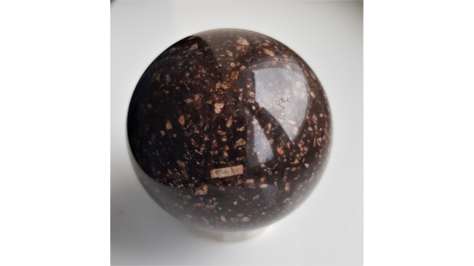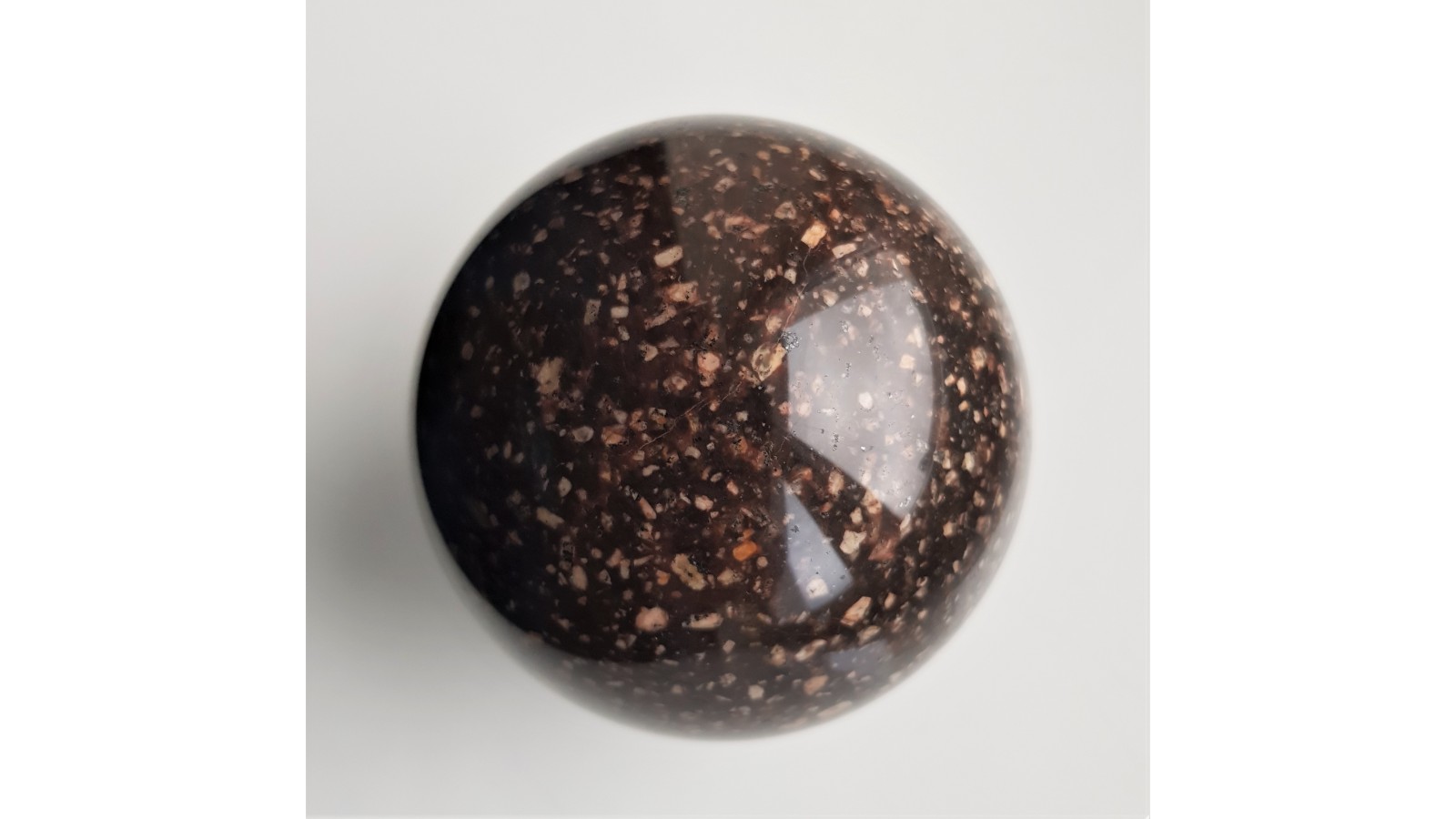 Pięknam, niespękana, duża kula ze skały typu syenitu/trachitu o więźbie porfirowej, w której prakryształy skaleni są zanurzone w drobnokrystalicznym cieście skalnym. Idealny poler, bardzo estetyczna. Eratyk z pobrzeża Bałtyku. Polecam.