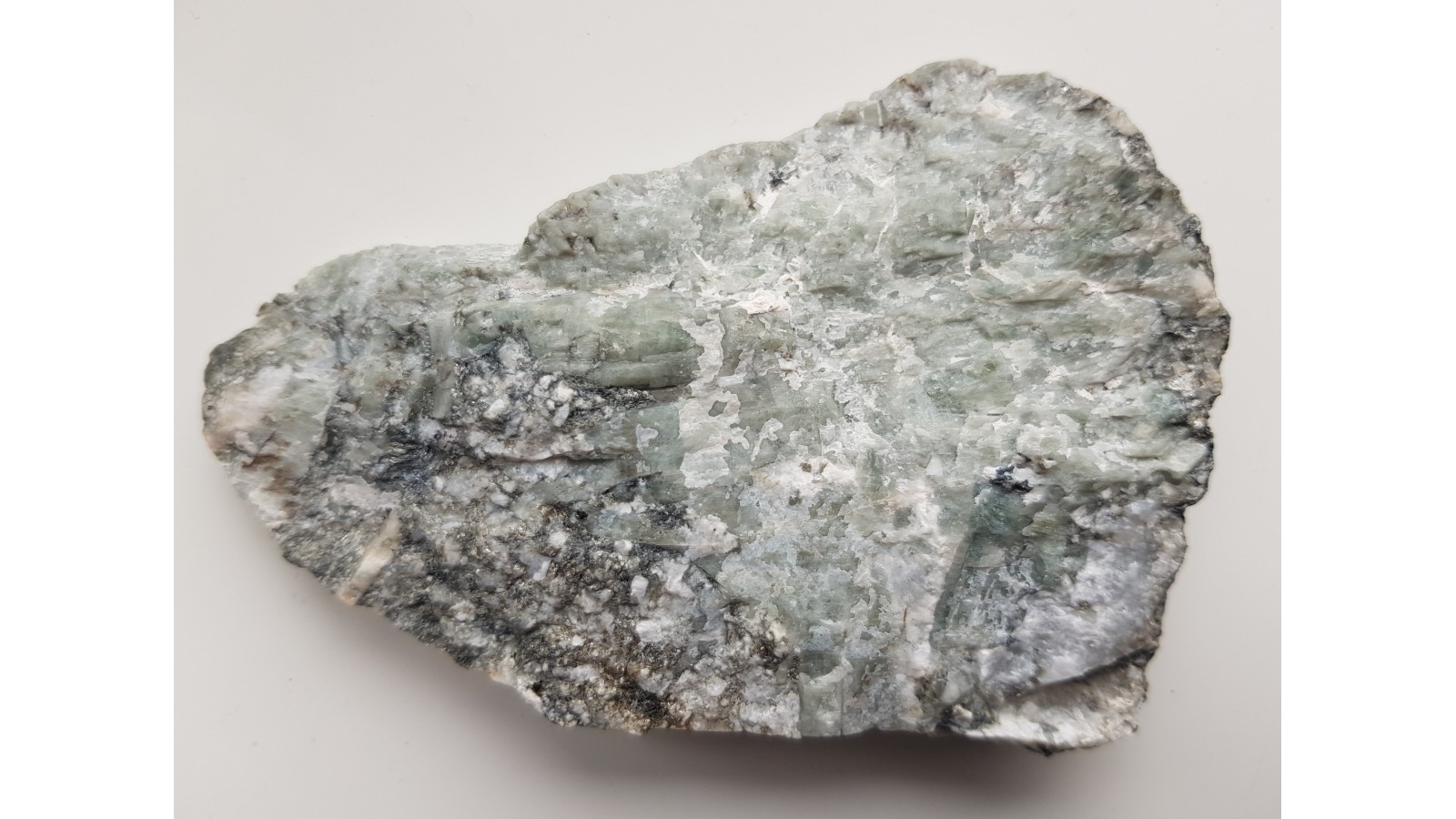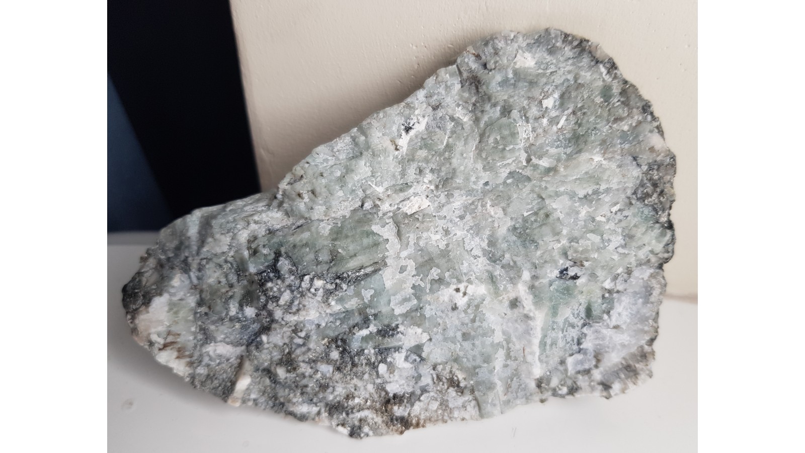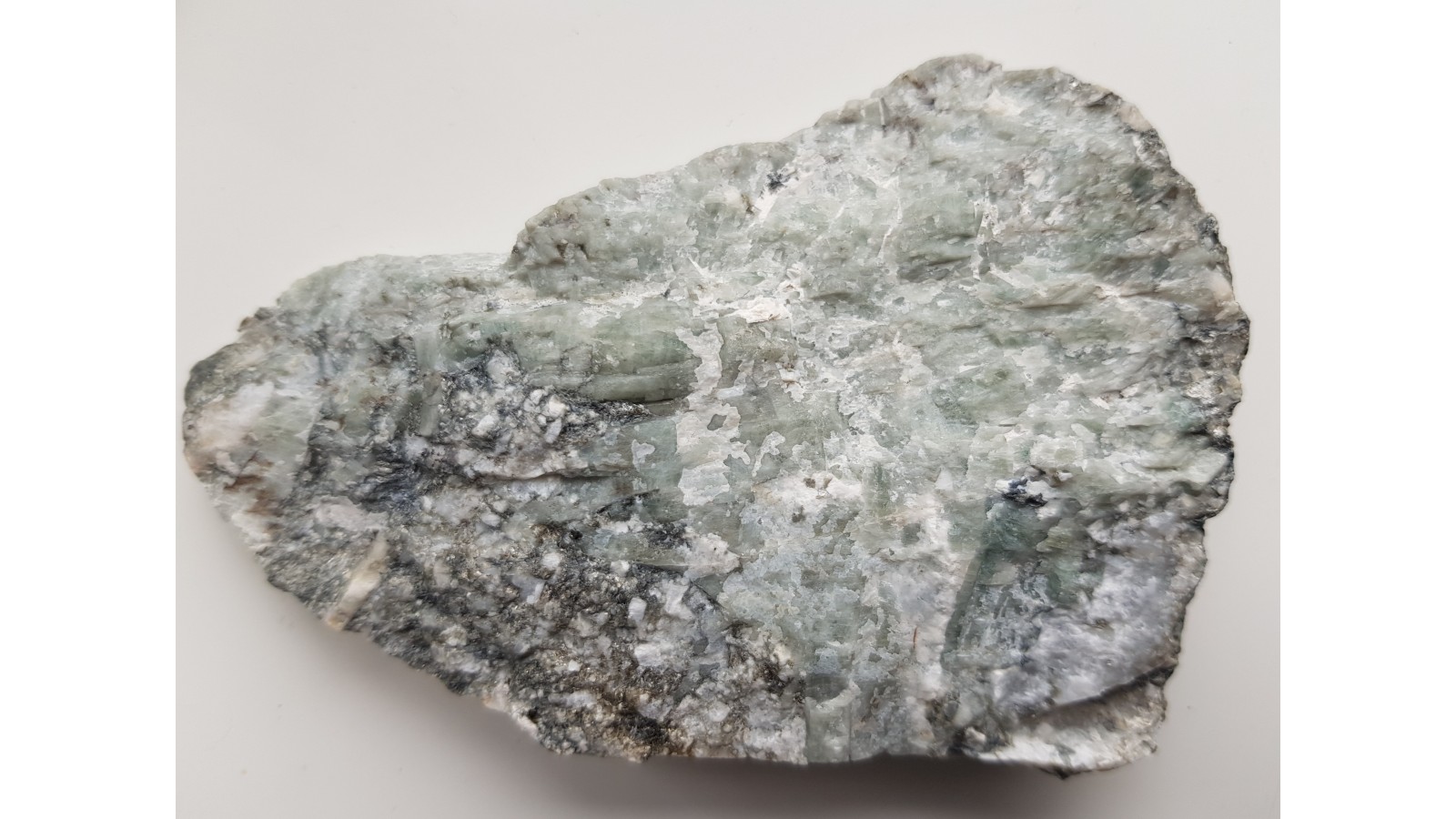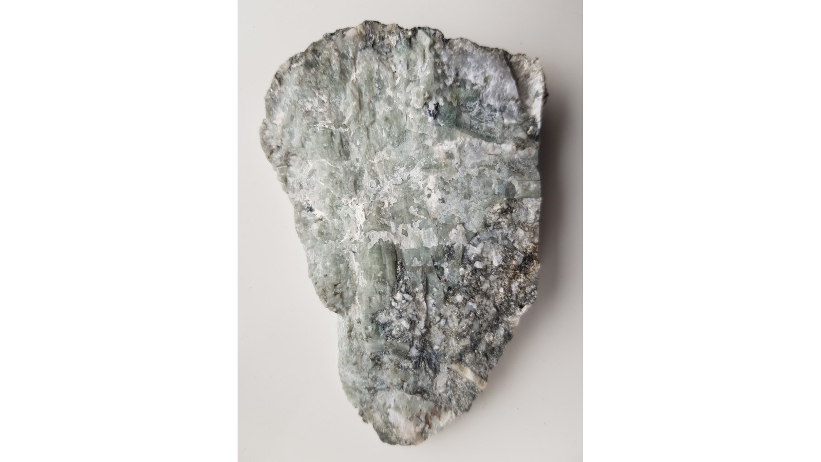 Płyta z licznymi kryształami berylu barwy szarobłękitnawej z pegmatytu desylifikowanego z kopalni magnezytu w Wirach k. Sobótki. Strona przeciwna docięta. Cała próbka jest przerośnięta berylami. Rzadkość mineralogiczna z polskich Sudetów. Polecam.