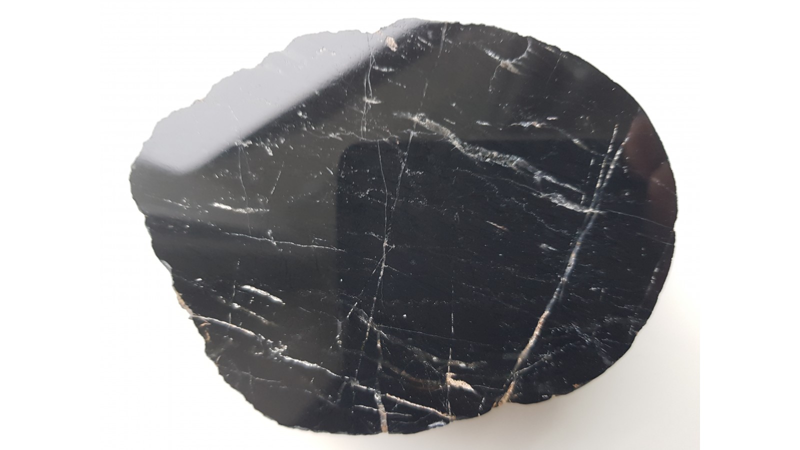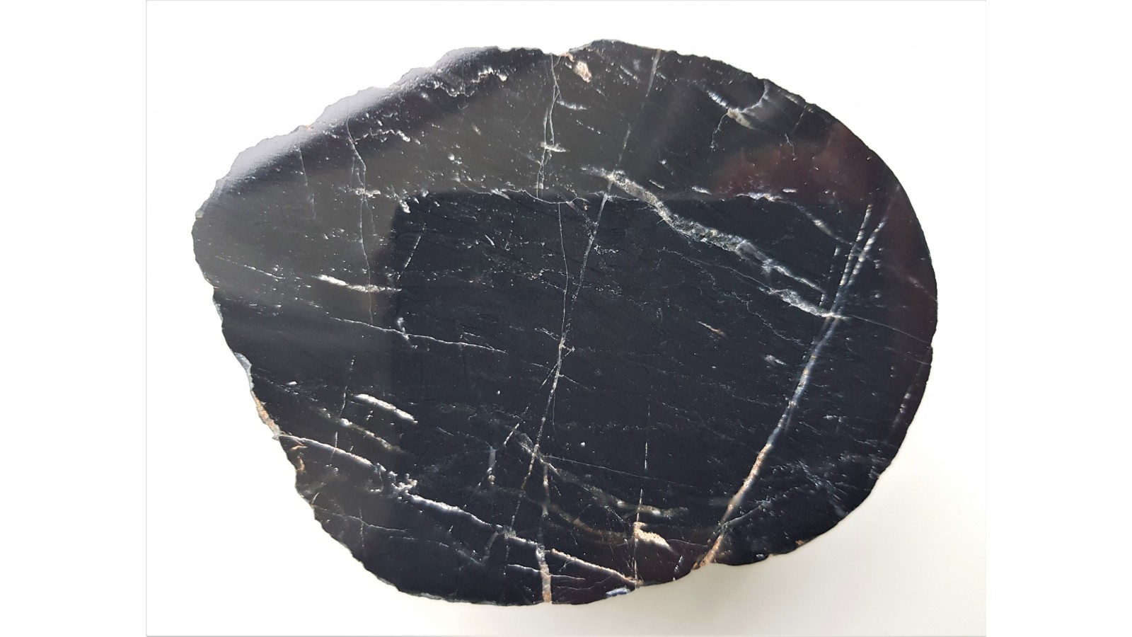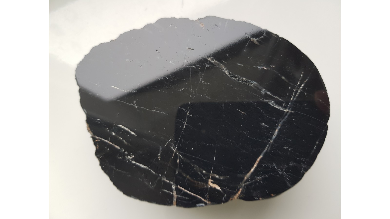 Masywny, polerowany lidyt ze zlepieńców kulmu niecki śródsudeckiej okolic Wałbrzycha. Idealny, piękny poler, strona przeciwna naturalna, nie cięta. Połowa otoczaka. Okaz o głębokiej, czarnej barwie. Niespękany. Cała, zamknieta forma. Polecam.