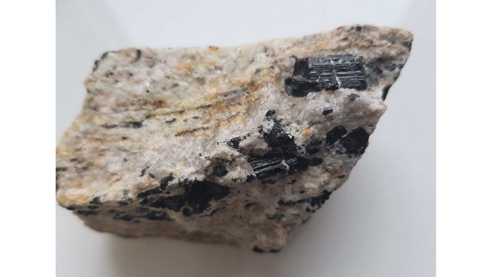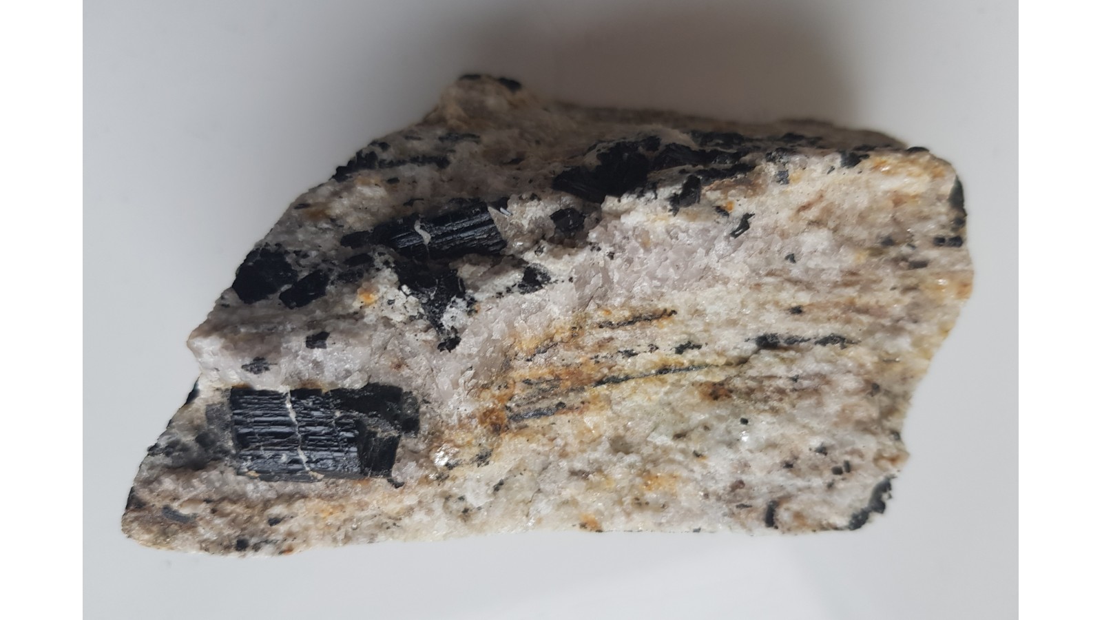 Polerowany przekrój przez jasny gnejs z turmalinami z Różanej k. Bielawy w Górach Sowich