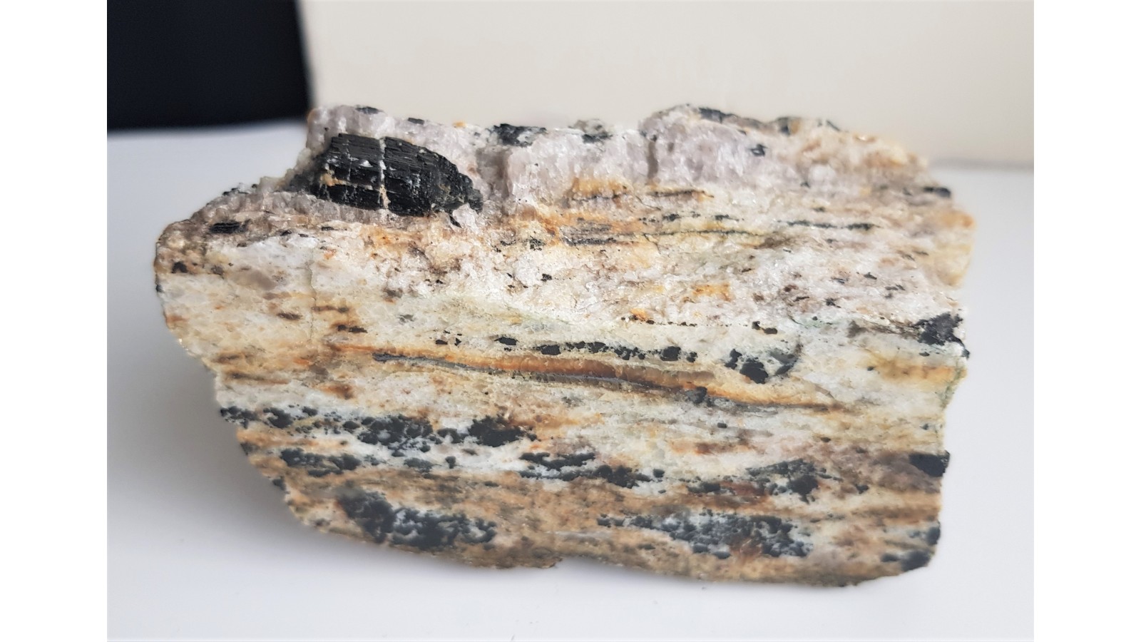 Okaz polerowanego jednostronnie jasnego gnejsu z laminami podkreślonymi obecnością czarnego turmslinu. Dwa błyszczące kryształy turmalinu w górnej, niepolerowanej części okazu ukazują sposób jego rozmieszczenia w skale. Okaz z okolic Różanej k. Bielawy w obszarze kry sowiogórskiej. Polecam.