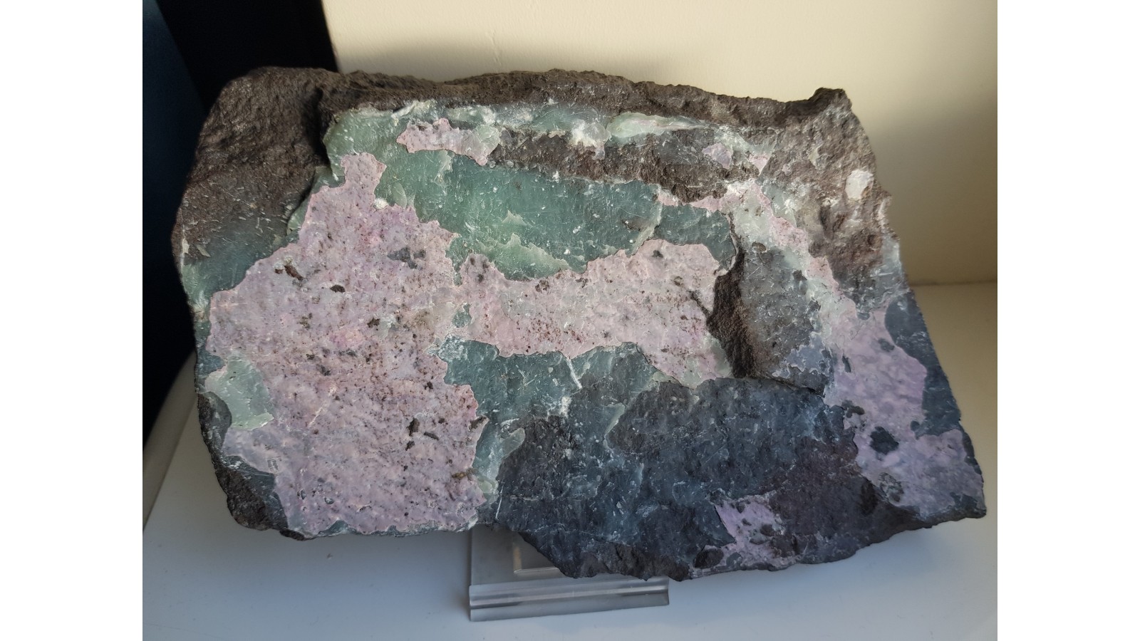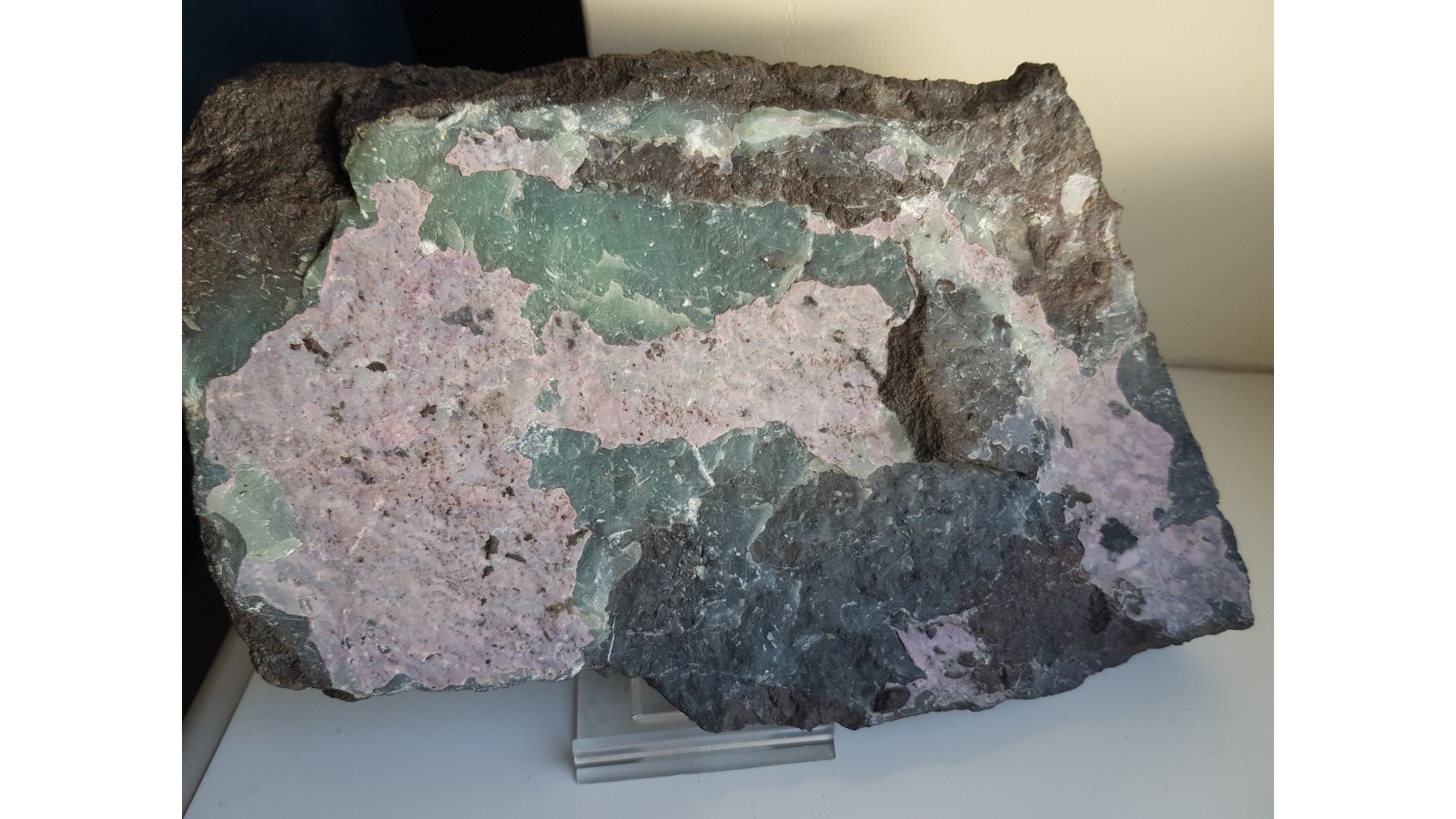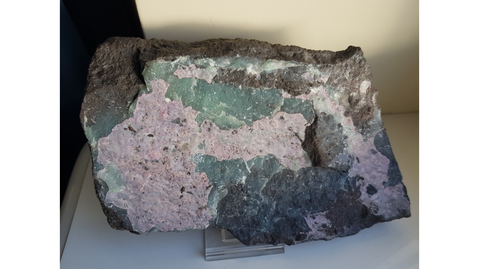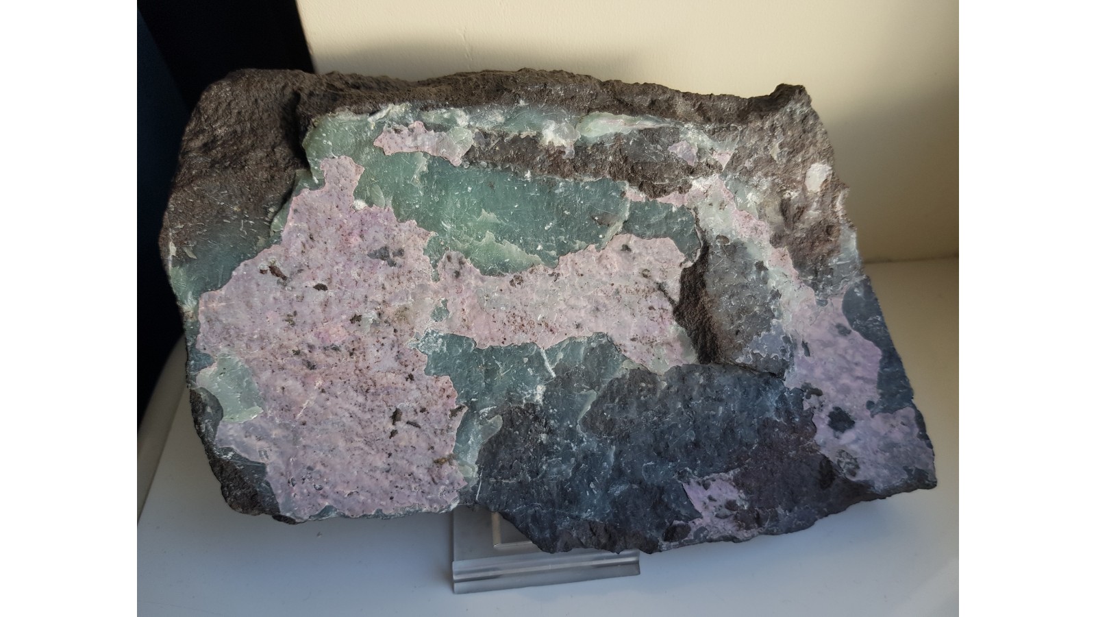 Duża płyta ciemnego, niemal czarnego piaskowca pokryta barwnymi pokrywami intensywnie różowego alumohydrokalcytu i zielonego dickitu z Nowej Rudy. Unikatowy okaz z uwagi na wielkość, wybarwienie, ilość minerałów. Bardzo wyrazisty i okazały. Okaz sprzed wielu lat. Polecam.
