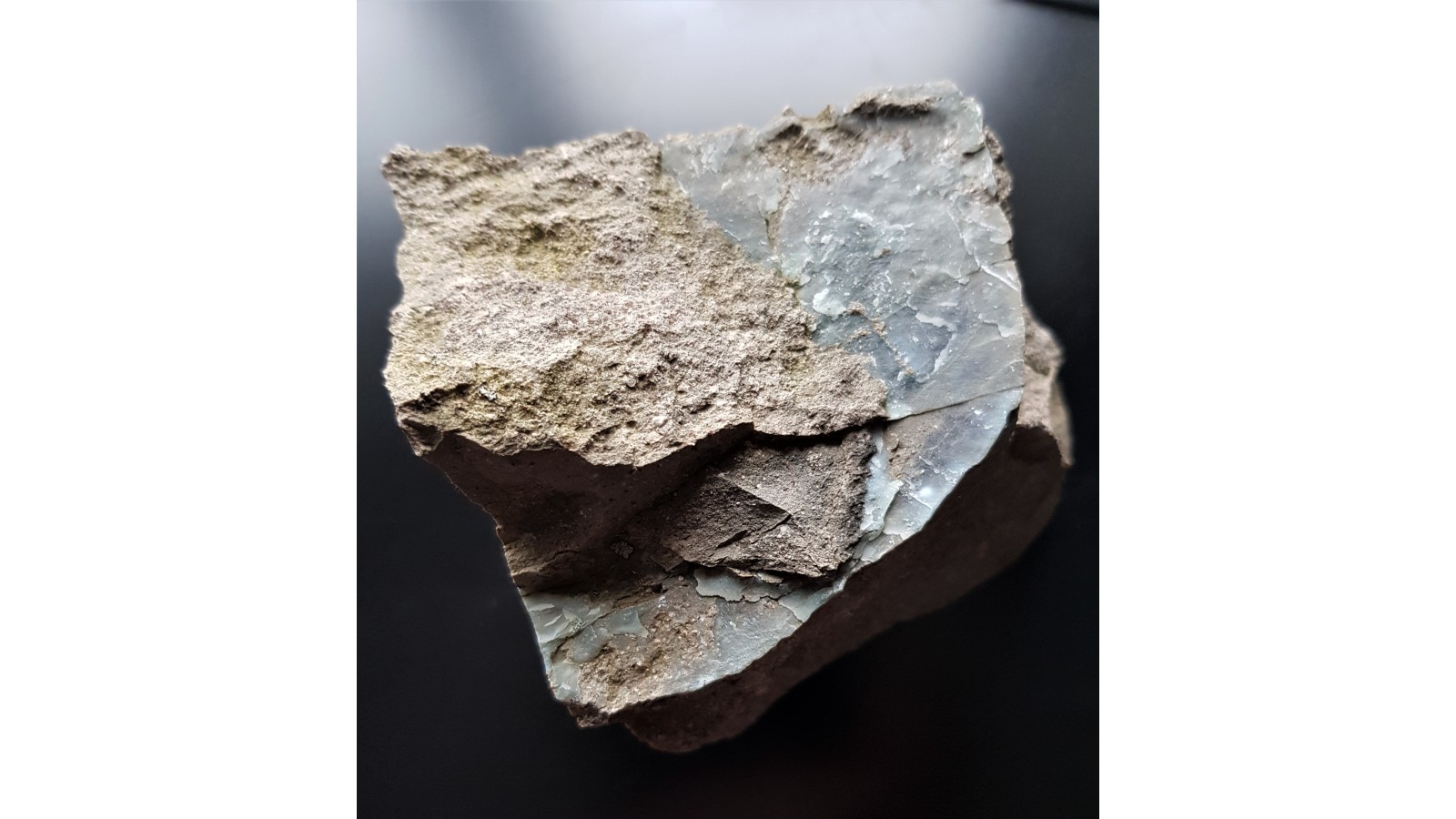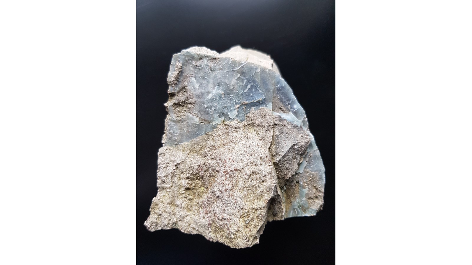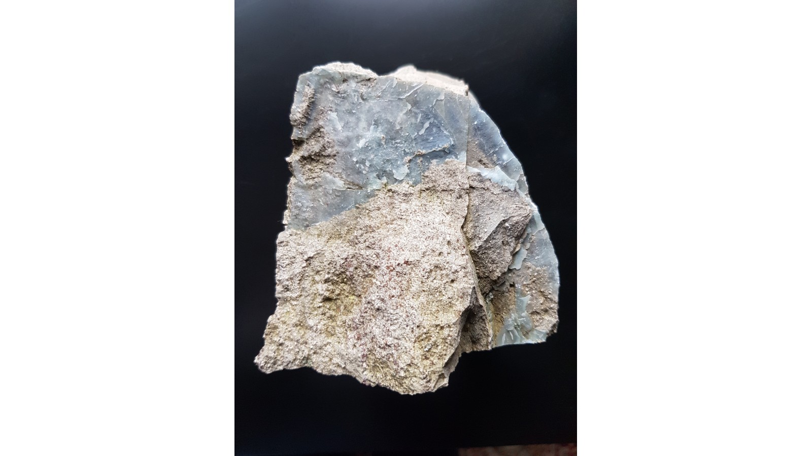 Foleryt (dickit) jako żyła o wyrazistej niebieskiej barwie w jasnym piaskowcu karbońskim z Nowej Rudy. Dodatkowo piaskowiec impregnowany hematytem. Polecam.