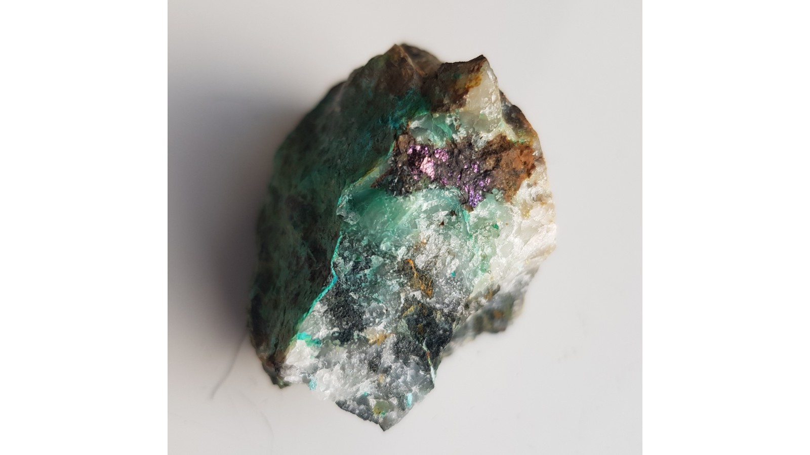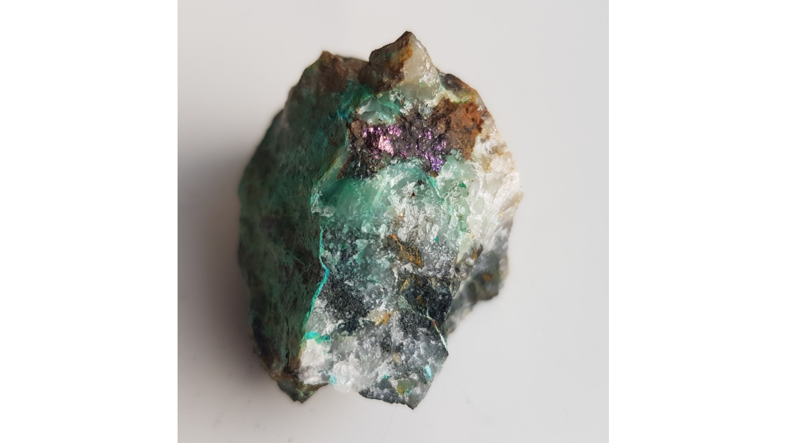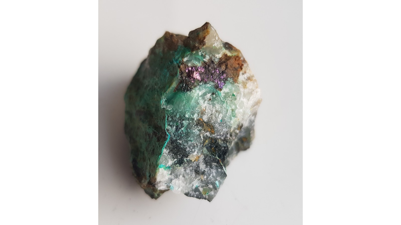 Wyrazisty bornit w żyle rudnej z kopalni Einigkeit w Miedziance k. Janowic Wlk. Ładny, niewielki okaz. Polecam.