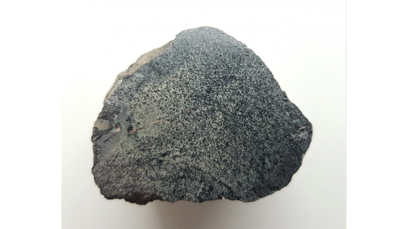 Polerowany okaz skały flogopitowo-apatytowej z Kopańca. Skałę wydobywano przy okazji poszukiwań rud uranu w obrębie leukogranitów. Tworzyła szlirę w leukogranitach oraz bezpośrednio łupkach amfibolowych. Apatyt w postaci drobnych, jasnych, bardzo licznych ziarenek pomiędzy blastami flogopitu. Ciekawostka petrologiczno-mineralogiczna Gór Izerskich. Strona przeciwna okazu naturalna, nie cięta. Polecam.