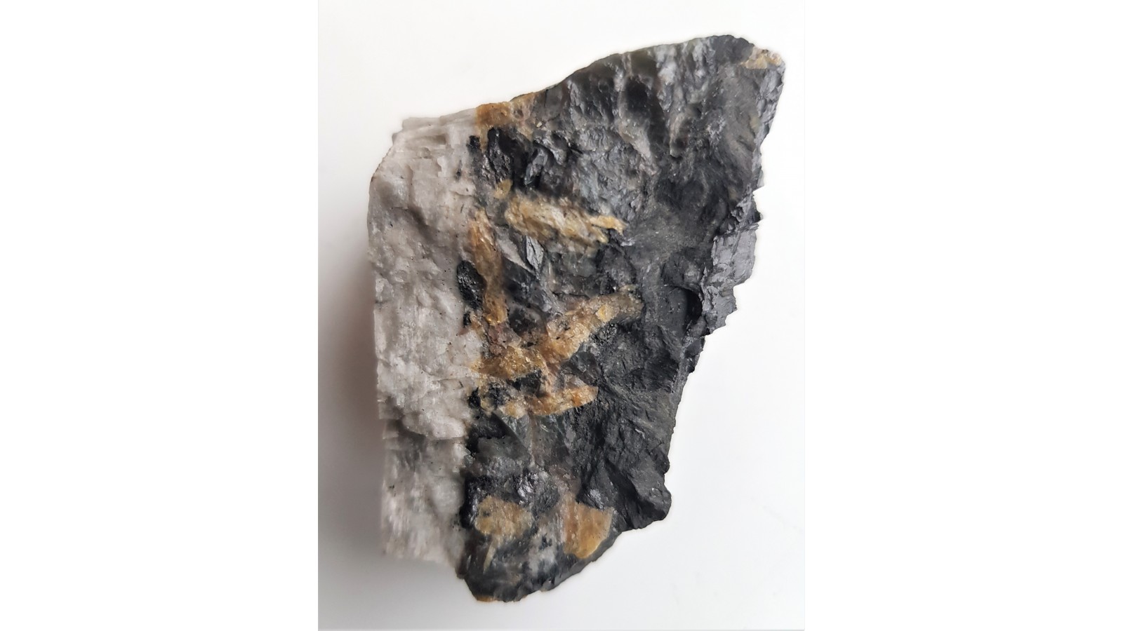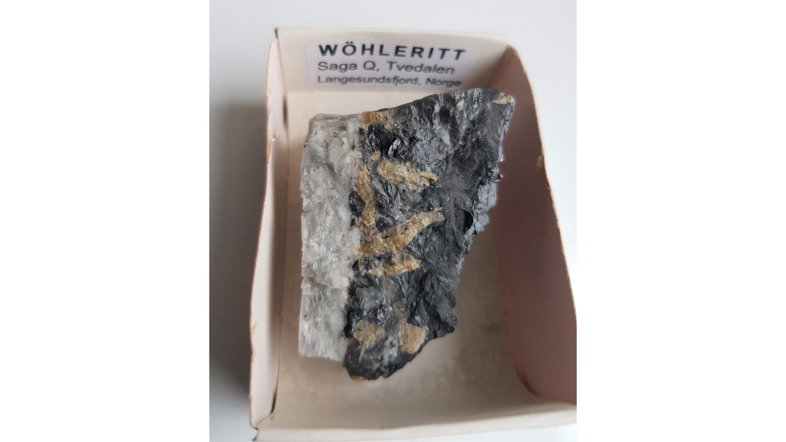 Unikatowy krzemian - wohlerit z kamieniołomu Saga, Tvedallen, Langesundsfjord (Norwegia) w towarzystwie plagioklazu oraz czarnego, rzadkiego amfibolu - barkevikitu. Okaz sprzed wielu lat. Widoczne duże, intensywnie żółte kryształy wohleritu, na jednym cała powierzchnia kryształu. Polecam.