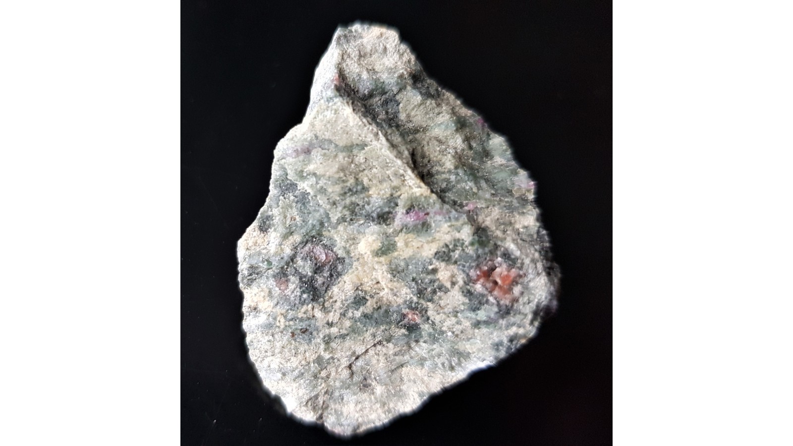 Okaz eklogitu z wrostkami rubinu z Bystrzycy Górnej. Rubiny czerwone, świecą w UV w odróżnieniu od granatów także obecnych w skale. Okaz naturalny, bez obróbki. Rzadkość z Sudetów. Niewielki okaz. Polecam.