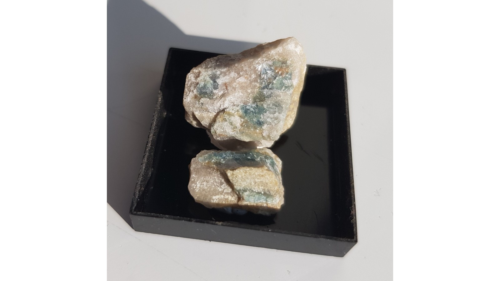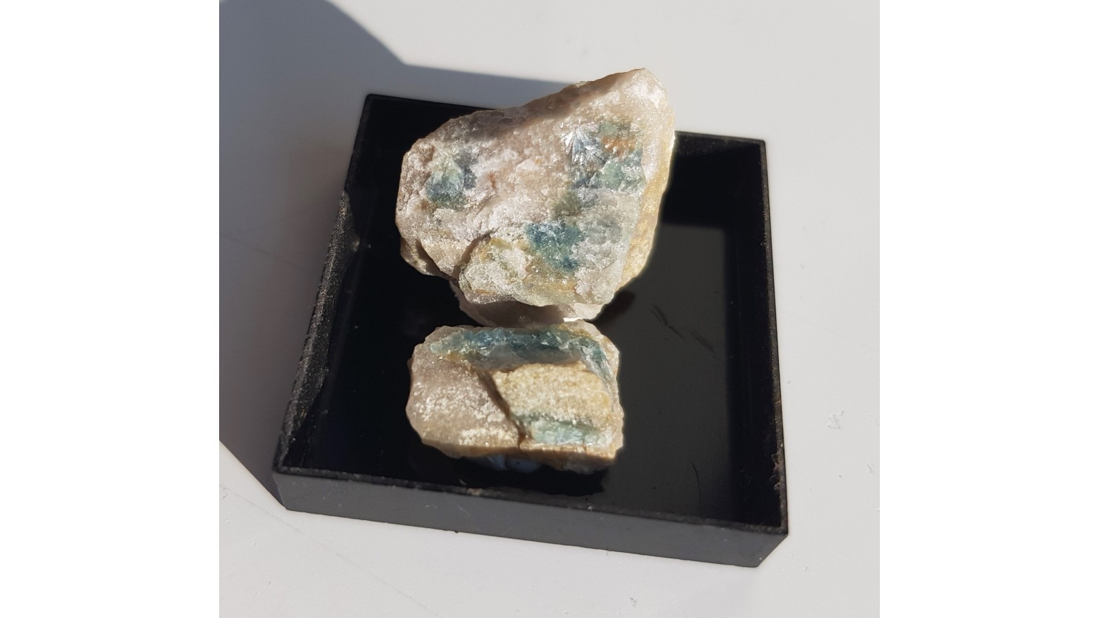 Mały okaz wavellitu (dwa okazy w małym pudełeczku 2,5x2 cm) o intensywnej, ładnej barwie zielonej i wyraźnych kryształkach zrośniętych promieniście. Wavellit na łupku kwarcowym. Okaz sprzed lat. Słabo znana lokalizacja sudecka. Polecam.