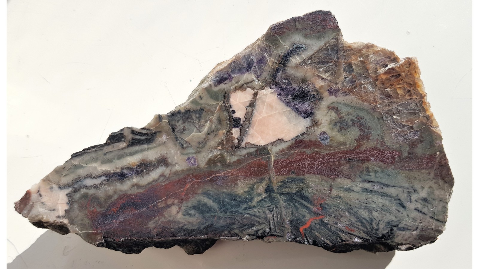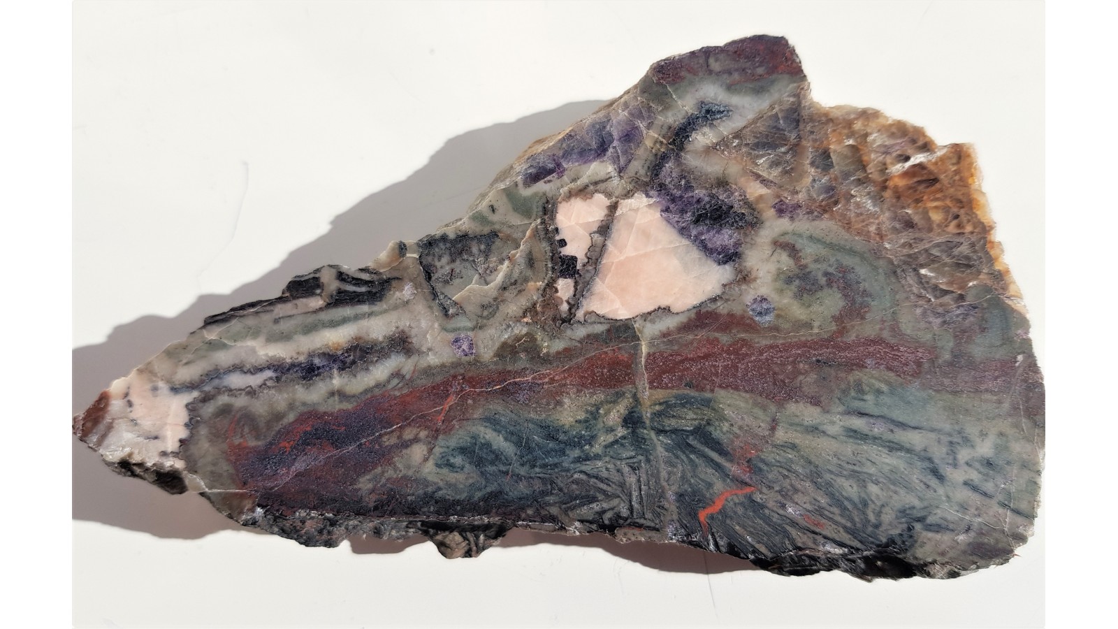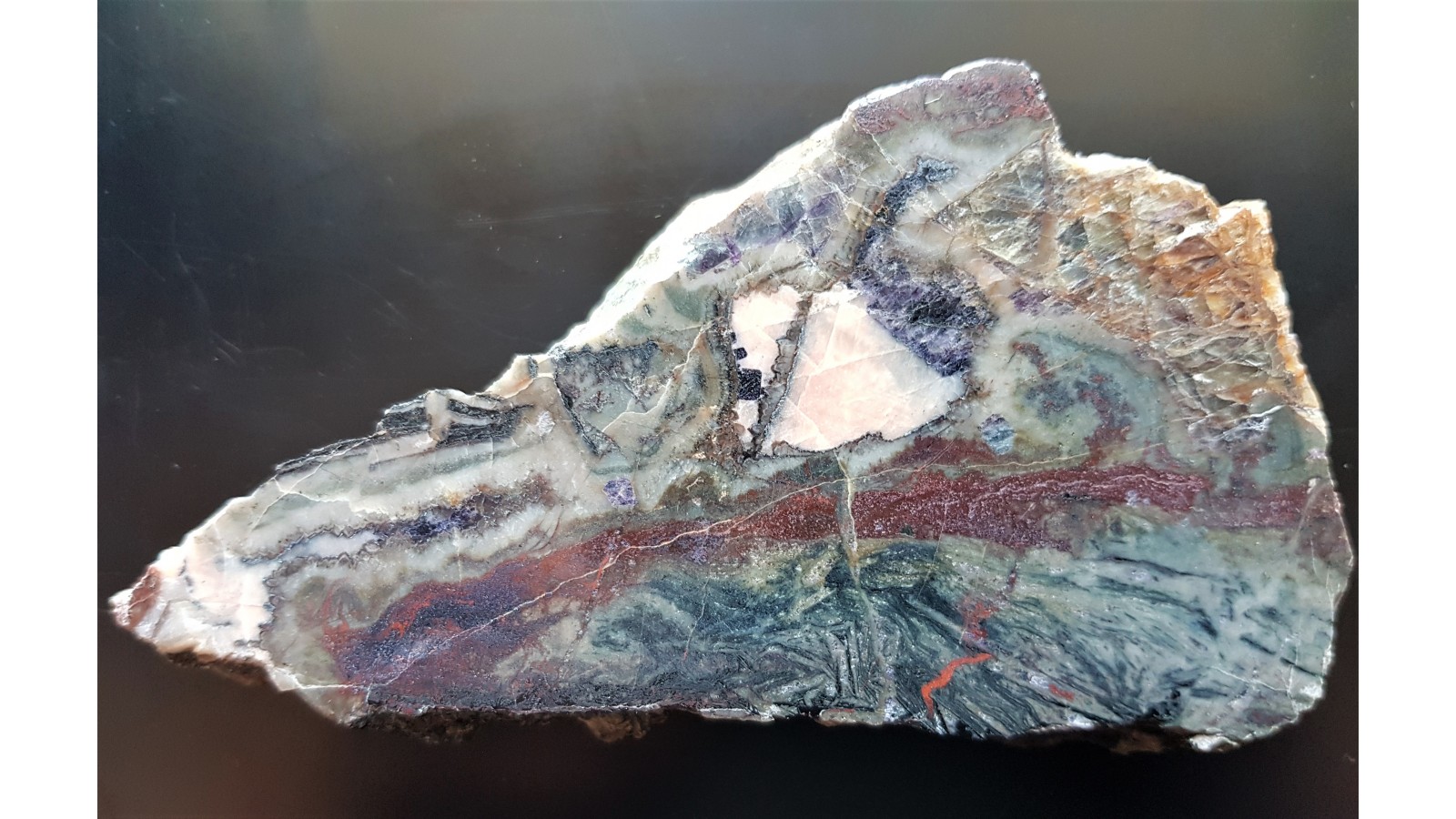 Polerowany okaz skarnu z kawernami zapełnionymi fioletowym antozonitem, zielonym fluorytem, kalcytem i hematytem z Kowar. Antozonit w postaci kryształów, widocznych także na stronie przeciwnej, narastających na ścianach kawerny wypłenionej kalcytem. Na ścianach także powłoka hematytu. Świetny poler, strona przeciwna naturalna, bez obróbki. Polecam.