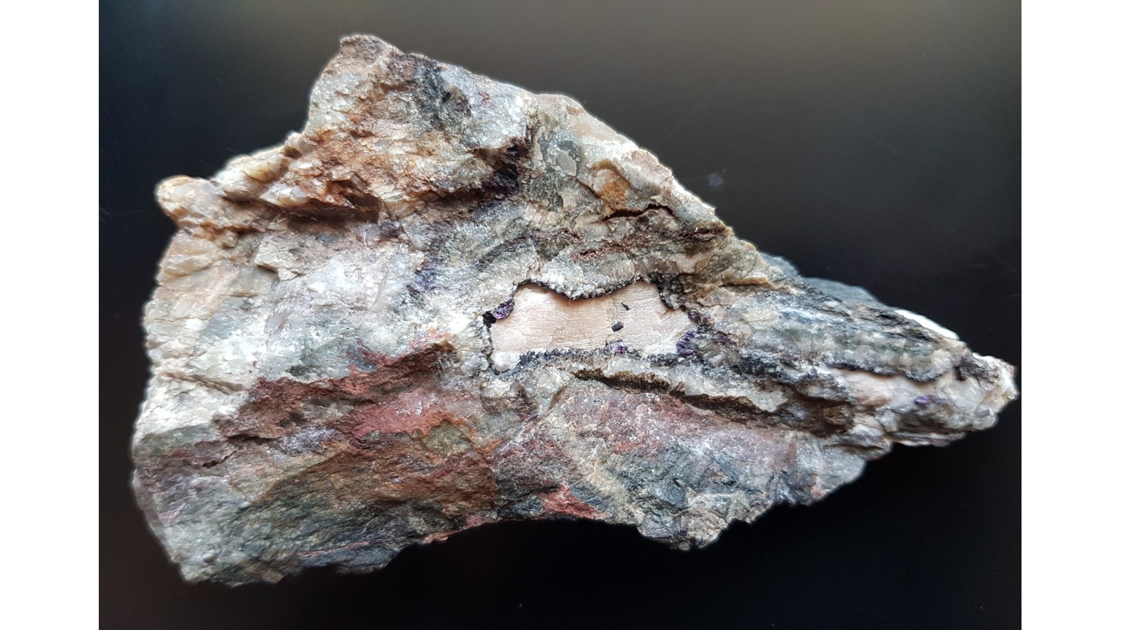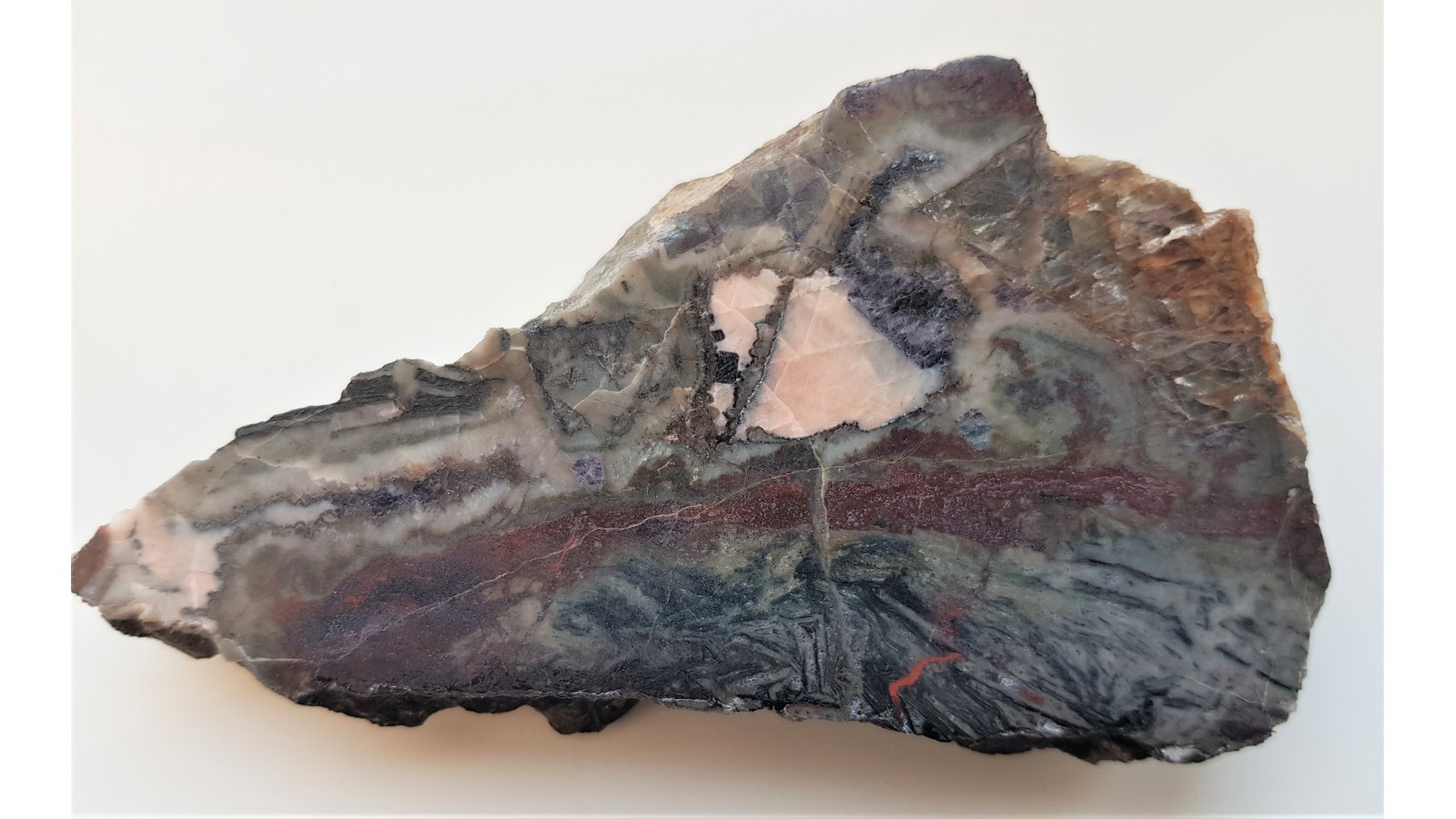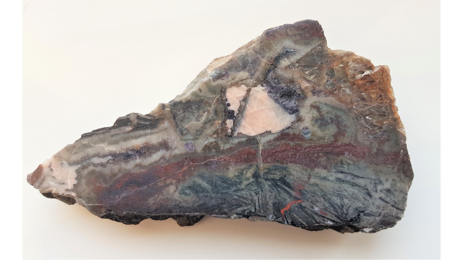 Polerowany okaz skarnu z kawernami zapełnionymi fioletowym antozonitem, zielonym fluorytem, kalcytem i hematytem z Kowar. Antozonit w postaci kryształów, widocznych także na stronie przeciwnej, narastających na ścianach kawerny wypłenionej kalcytem. Na ścianach także powłoka hematytu. Świetny poler, strona przeciwna naturalna, bez obróbki. Polecam.