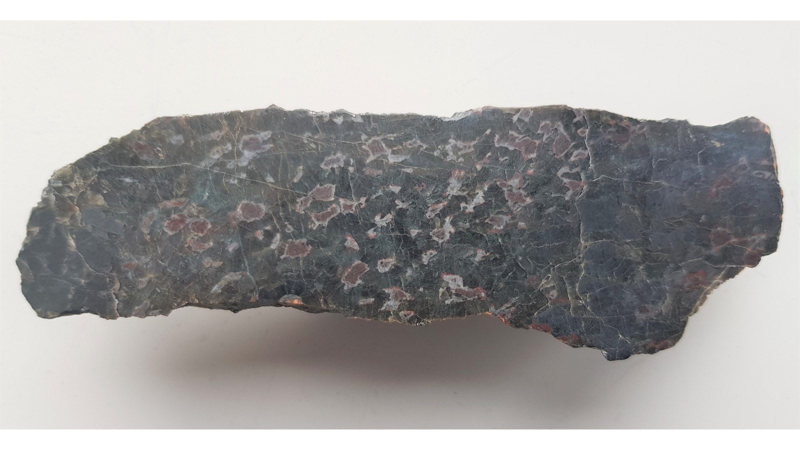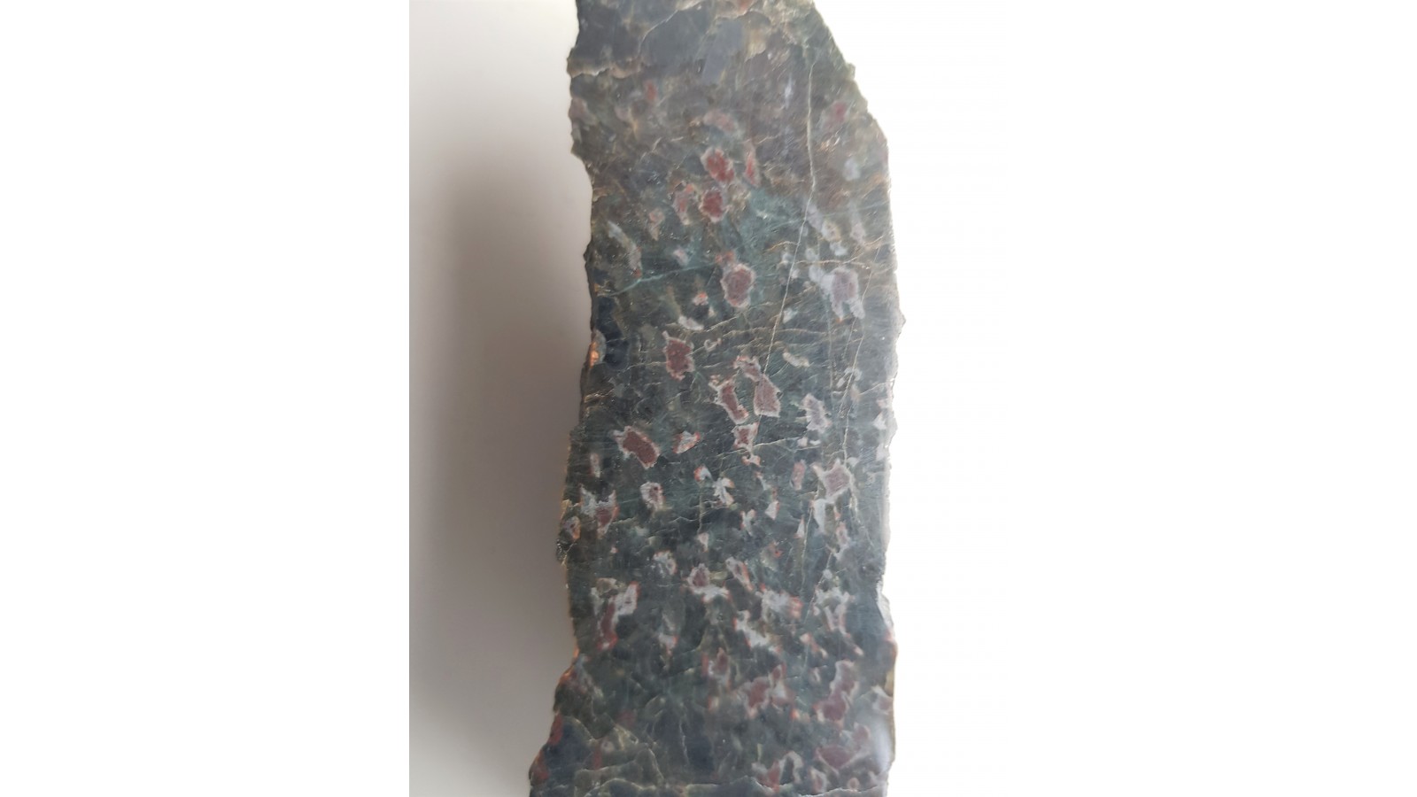 Gabro z Nowej Rudy - Słupca z czerwonymi strefami będącymi najprawdopodobniej produktami przeobrażenia pierwotnych oliwinów. Okaz polerowany jednostronnie, strona przecwna naturalna. Małe wtrącenia minerałów rudnych i dostrzegalne "świecenie" piroksenów w części zgładu. Polecam.