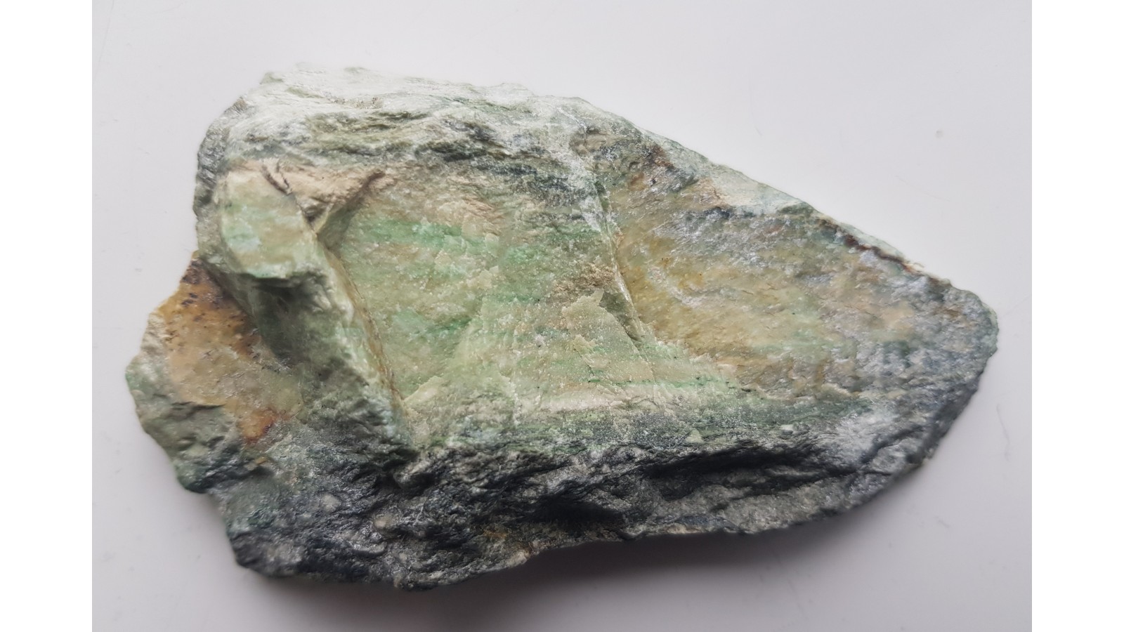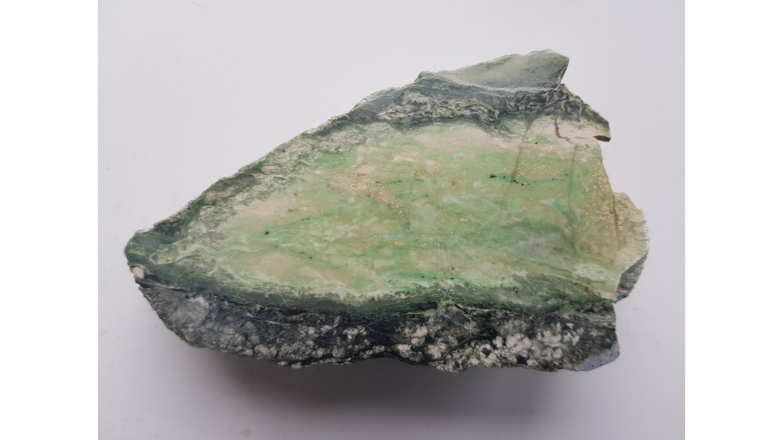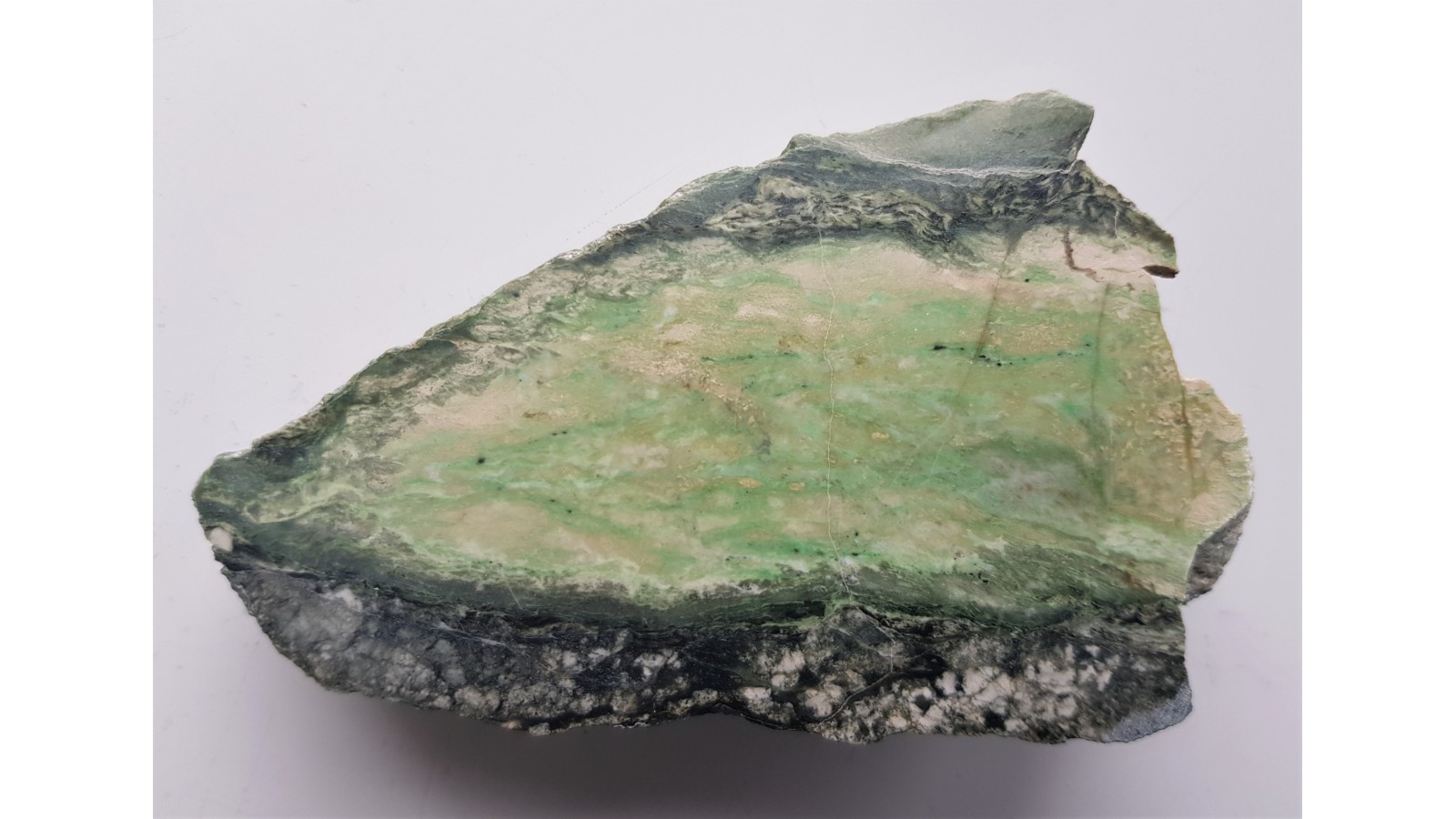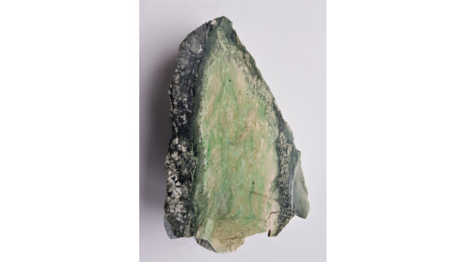 Jasny rodingit z Jordanowa Śląskiego z minerałami chromu o charakterystycznej, szmaragdowej barwie w formie budiny na kontakcie ze skałami typu serpentynitów bądź z nefrytem. Najprawdopodobniej w pobliżu ciemnych spineli chromowych (nieprzezroczyste, czarne wtrącenia spineli glinowych zawierających chrom) zlokalizowane są chromowozielone granaty. Jedna strona polerowana, przeciwna naturalna, bez obróbki. Bardzo ozdobna skała. Polecam.