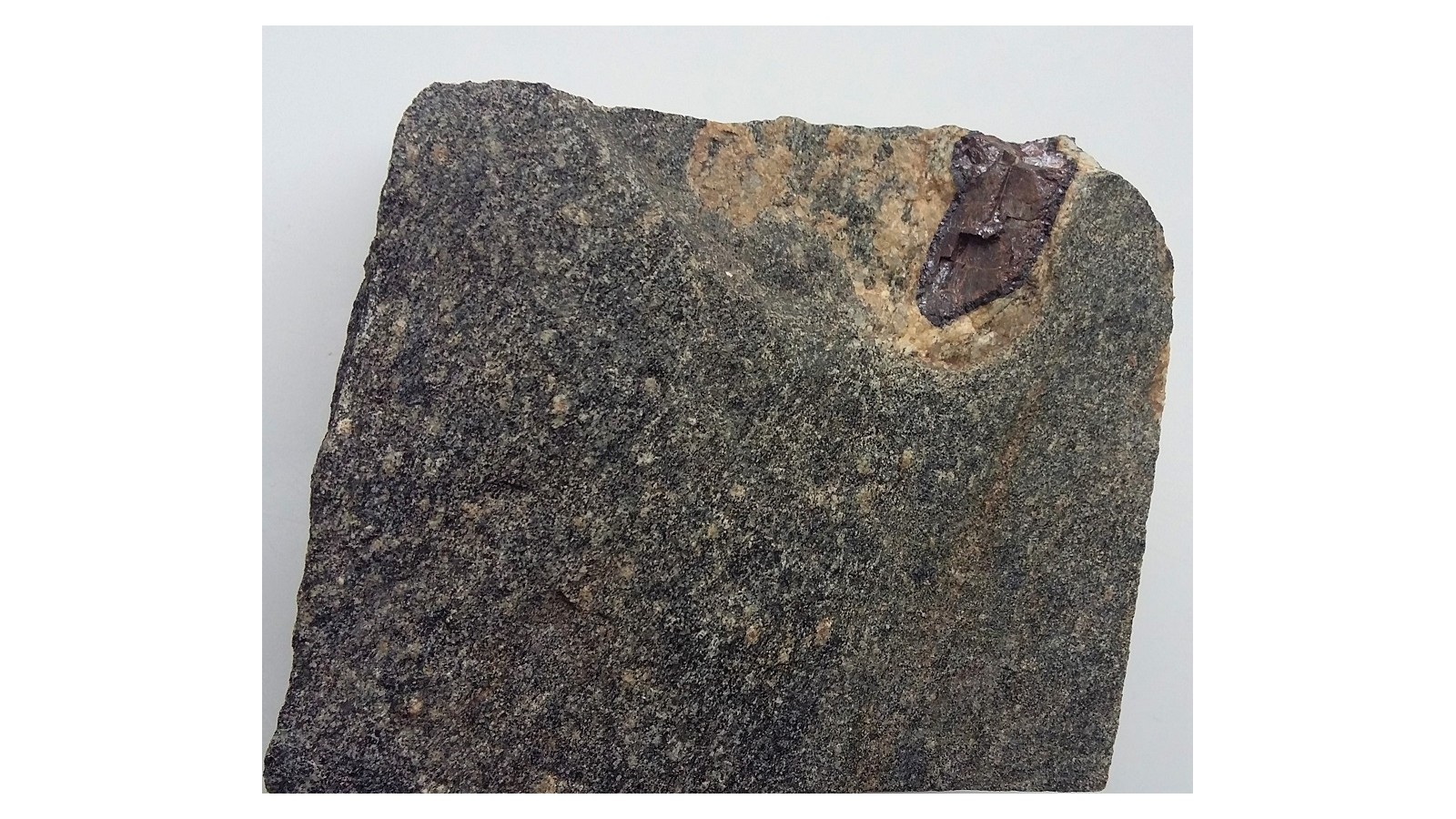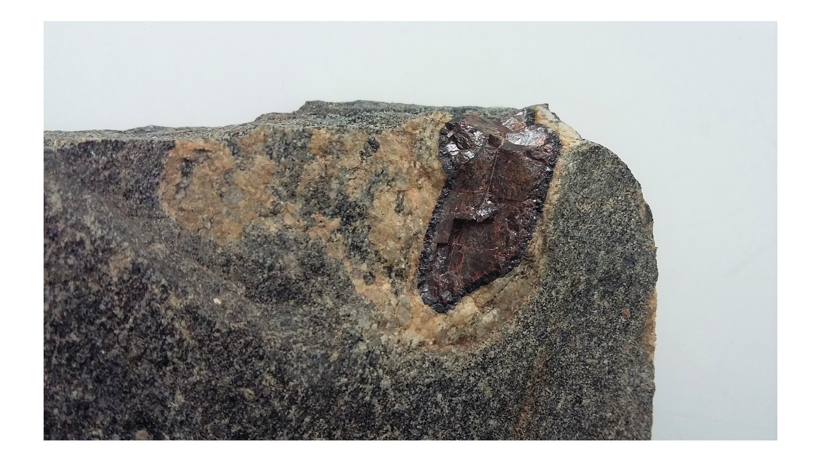 Oferujemy bardzo rzadki okaz mineralogiczny - duży okaz rutylu wrośnięty w amfibolit z Jodłownika w Górach Sowich. Sam kryształ rutylu ma ponad 2 cm długości i ponad centymetr grubości. Wyjątkowa rzadkość. Pięknie widoczny ciemnoczerwony kolor i metaliczny przełam. Rutyl w ciemnej otoczce ilmenitu widocznej na zdjęciu. Wyjątkowej klasy okaz mienralogiczny z Sudetów.