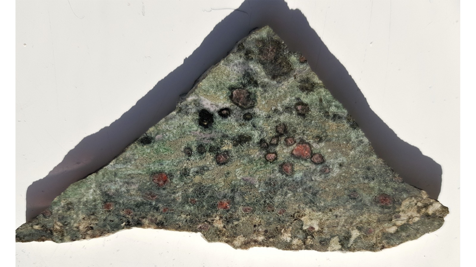 Okaz eklogitu z wrostkami rubinu. Rubiny różowe, intensywnie świecą w UV w odróżnieniu od granatów także obecnych w skale. Okaz z polerem dwustronnym. Rubiny po obydwu stronach. Rzadkość z Sudetów. Okaz z Bystrzycy Grn. w bloku sowiogórskim. Polecam.